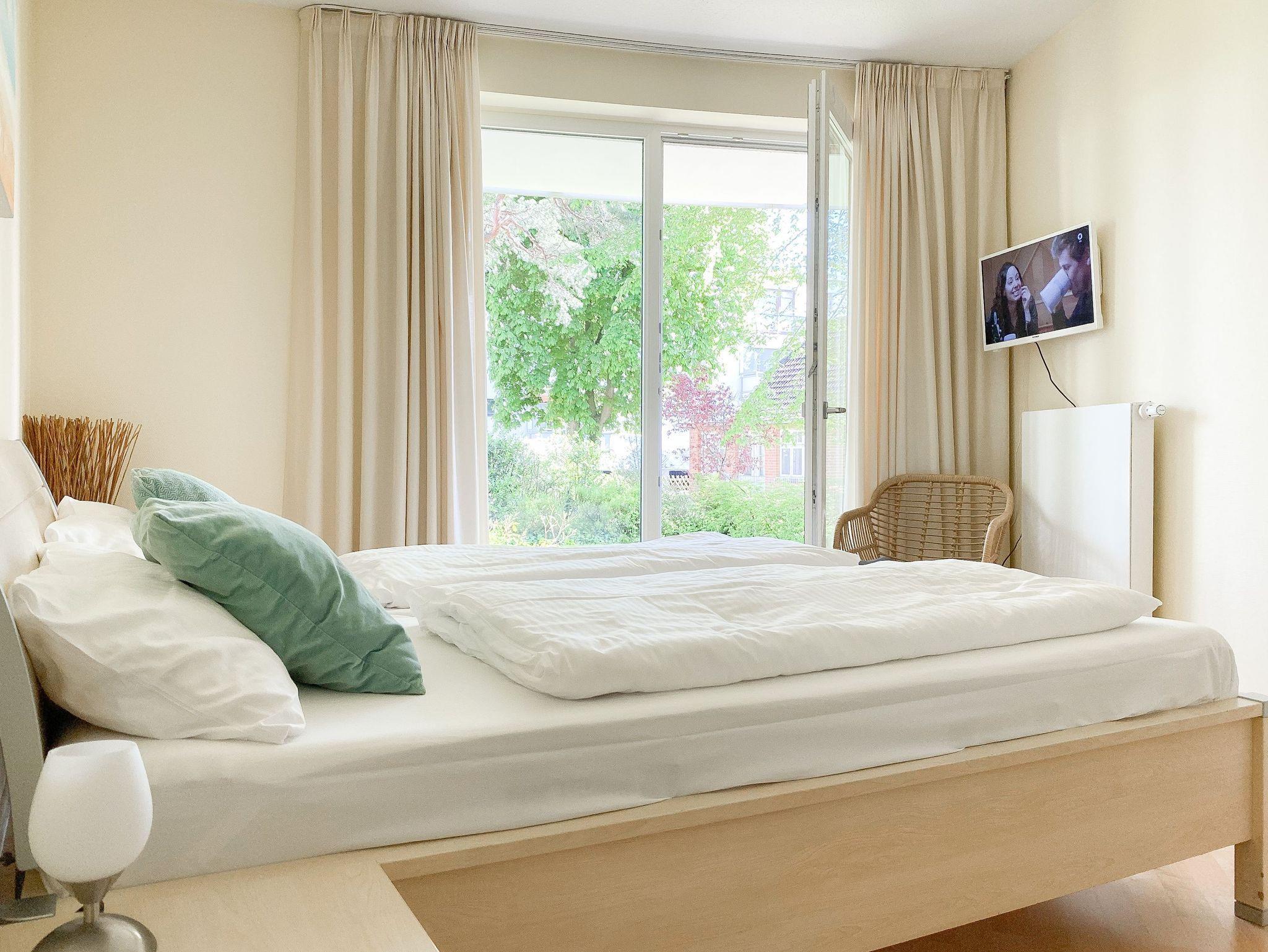 Bodentiefe Fensterflächen sorgen für helle Räumlichkeiten und die geschmackvolle Einrichtung in warmen Farben schafft eine angenehme Wohnatmosphäre. Die überdachte XXL Sonnenterrasse, die sich über die gesamte Breite der Wohnung erstreckt und mit hochwertigen Gartenmöbeln sowie Sonnenliegen ausgestattet ist,[nbsp][nbsp]macht diese Wohnung zu etwas Besonderem. Die angrenzende Rasenfläche kann ebenfalls genutzt werden. Im Wohnbereich erwartet Sie ein hochwertiges Sofa mit Schlaffunktion, TV, Radio und WLAN sowie ein Schreibtisch zur Erledigung wichtiger Korrespondenz. Der integrierte Essbereich ist für 3 Personen eingerichtet und die offene Einbauküche ist mit Backofen, Mikrowelle und Geschirrspüler bestens ausgestattet.[nbsp] Das Schlafzimmer verfügt über ein Doppelbett (180x200), einen geräumigen Schrank und TV.[nbsp] Alle Fenster sind mit Verdunkelungsvorhängen versehen. Das moderne Duschbad ist großzügig angelegt.