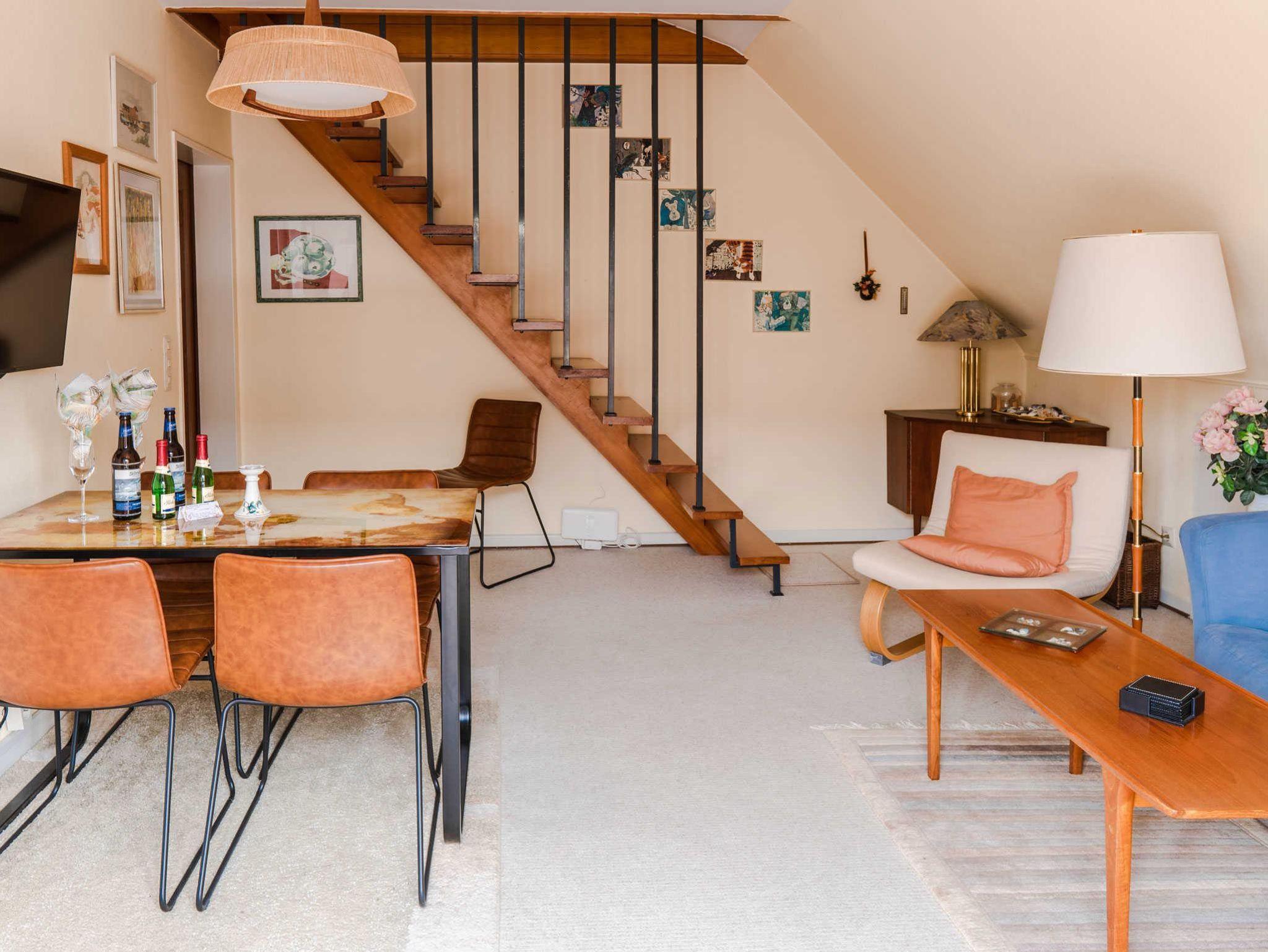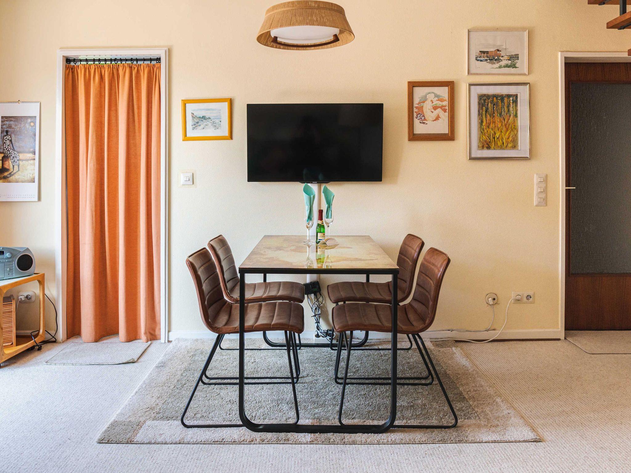 Die Ferienwohnung ist Teil eines gepflegten Gebäudekomplexes mit 16 Wohnungen. In der 2 1/2 Etage befinden sich das Wohnzimmer, ein Schlafzimmer, sowie Bad und Küche. Im ausgebauten Dachgeschoss hat sie ein zweites Schlafzimmer und eine weiteres WC.
