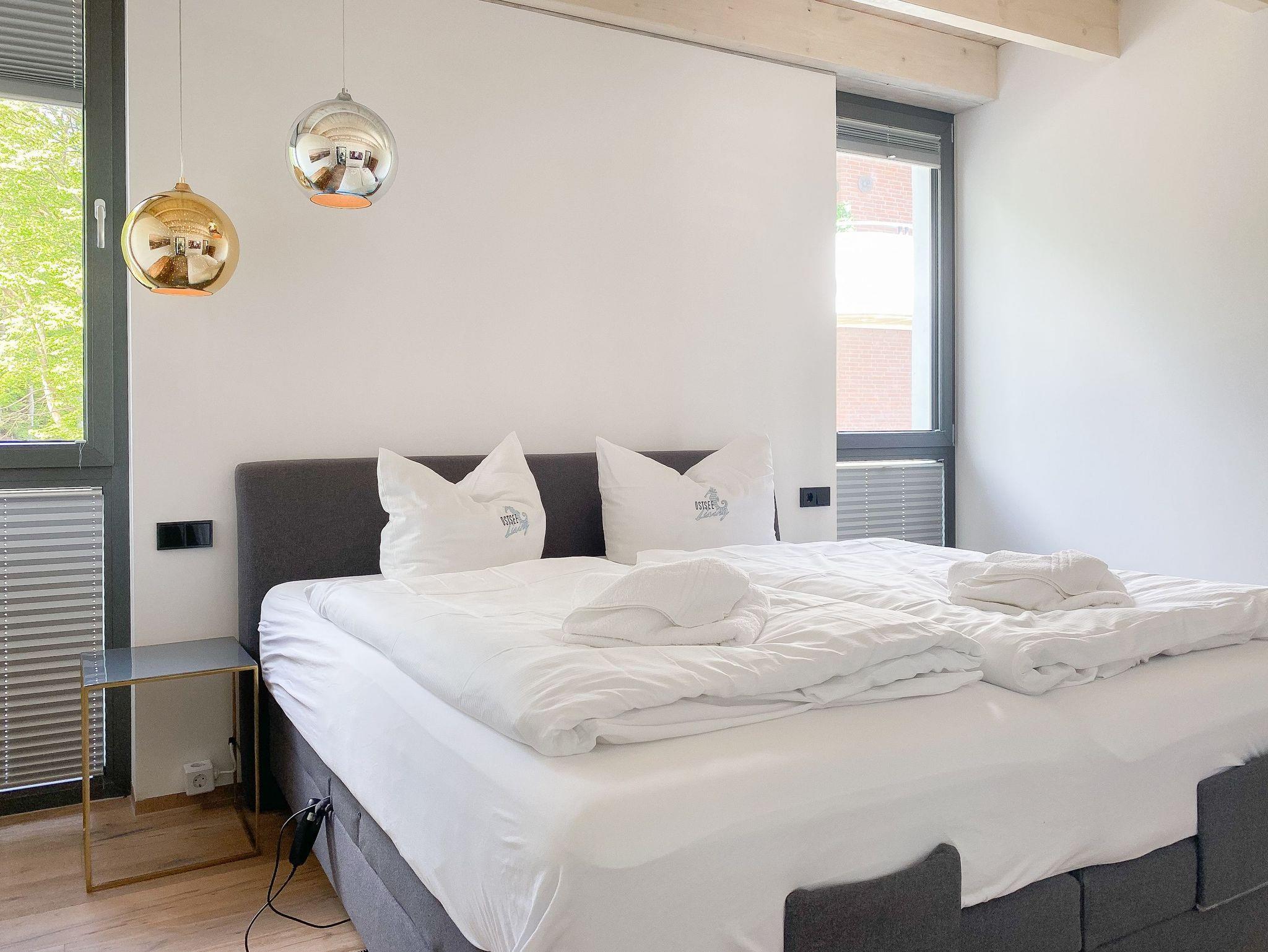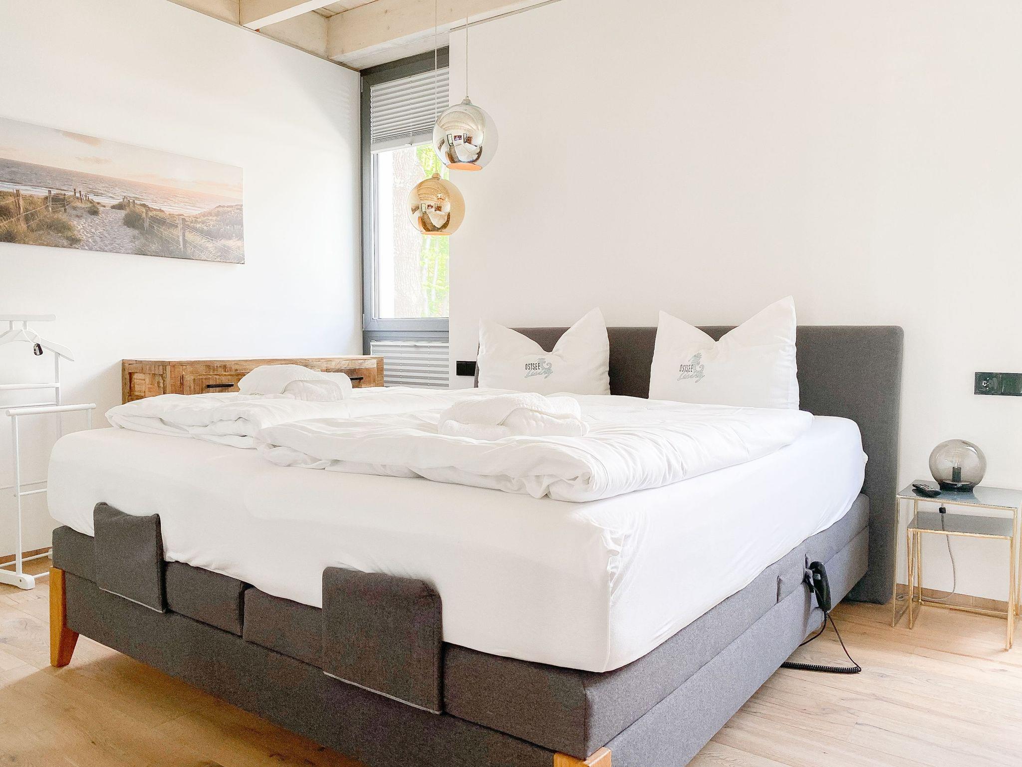 Die Ferienwohnung Meerchenwald 3 befindet sich im 1. Obergeschoss und verfügt über 3 separate Schlafzimmer mit elektromotorisch verstellbaren Boxspringbetten (180x200), Verdunkelungsplissees und TV, zwei moderne Duschbäder en Suite sowie ein zusätzliches Gäste WC im Eingangsbereich. Im Flur bietet ein großer Einbauschrank ausreichend Stauraum für Ihre Urlaubsgarderobe. Bitte beachten Sie, dass im kleinen Schlafzimmer das Bett nur über das Fußende zu erreichen ist. Der großzügige Wohnbereich mit riesigen Glasfronten zum Südbalkon verfügt über 2 hochwertige Sofas, TV, DVD-Player und Surround Anlage. Selbstverständlich steht Ihnen WLAN zur kostenlosen Nutzung zur Verfügung. Der anschließende Essbereich ist für 6 Personen eingerichtet und die perfekt ausgestattete, hochmoderne Wohnküche lässt garantiert keine Wünsche offen.
