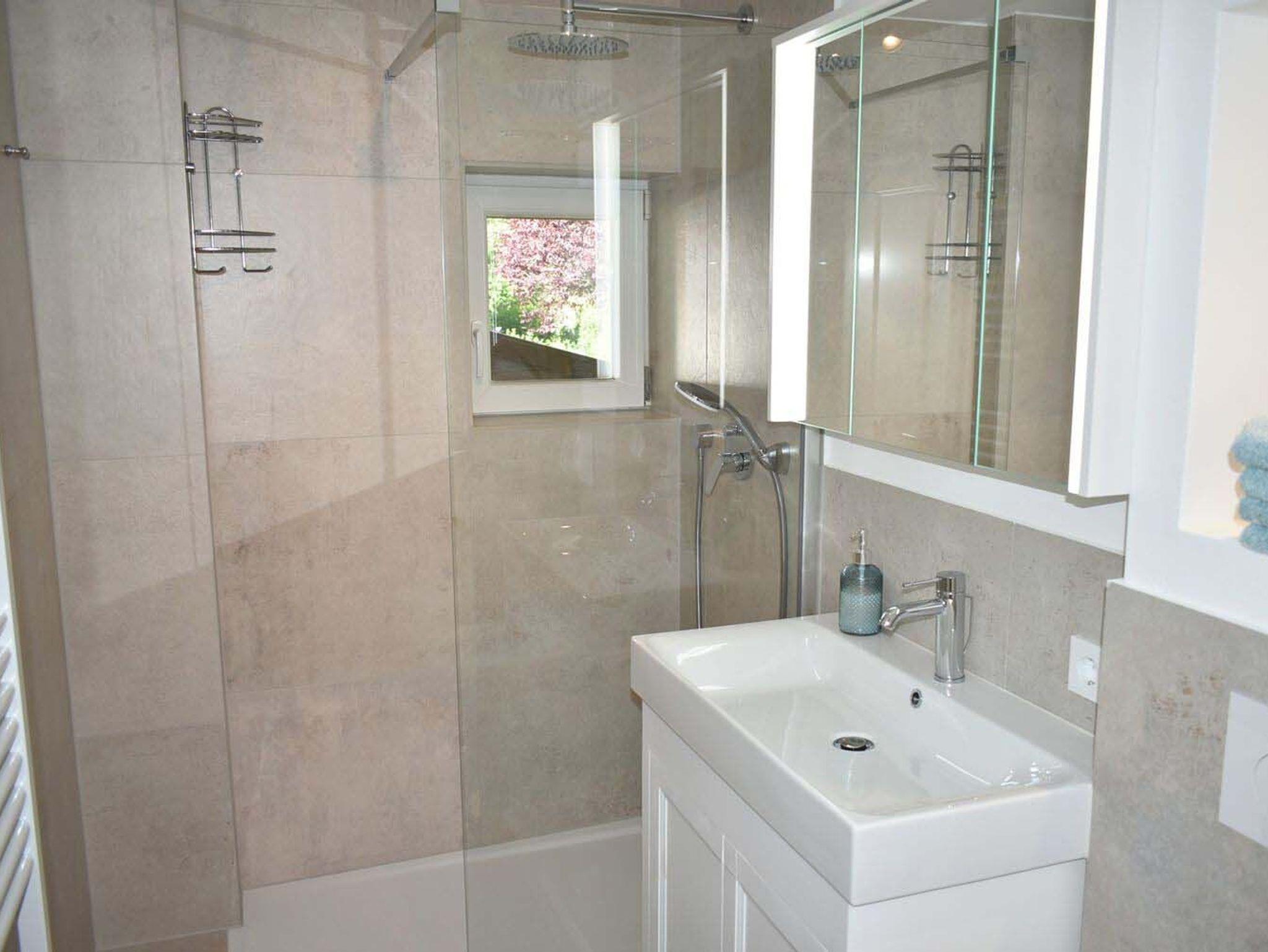 Bad 1: Duschwand, Fön, Regendusche, Spiegelschrank, Waschtisch mit Unterschrank, WC
