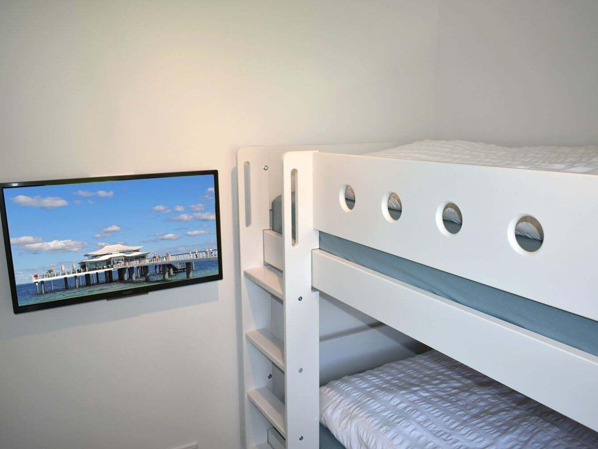 Schlafzimmer 2: 2x Kopfkissen á 0,80 x 0,80 und 2x á 0,80 x 0,40, Etagenbett 2,00 x 0,90 m, Flachbildschirm, Hocker, Kleiderschrank, Sat-TV, Verdunklungsplissee