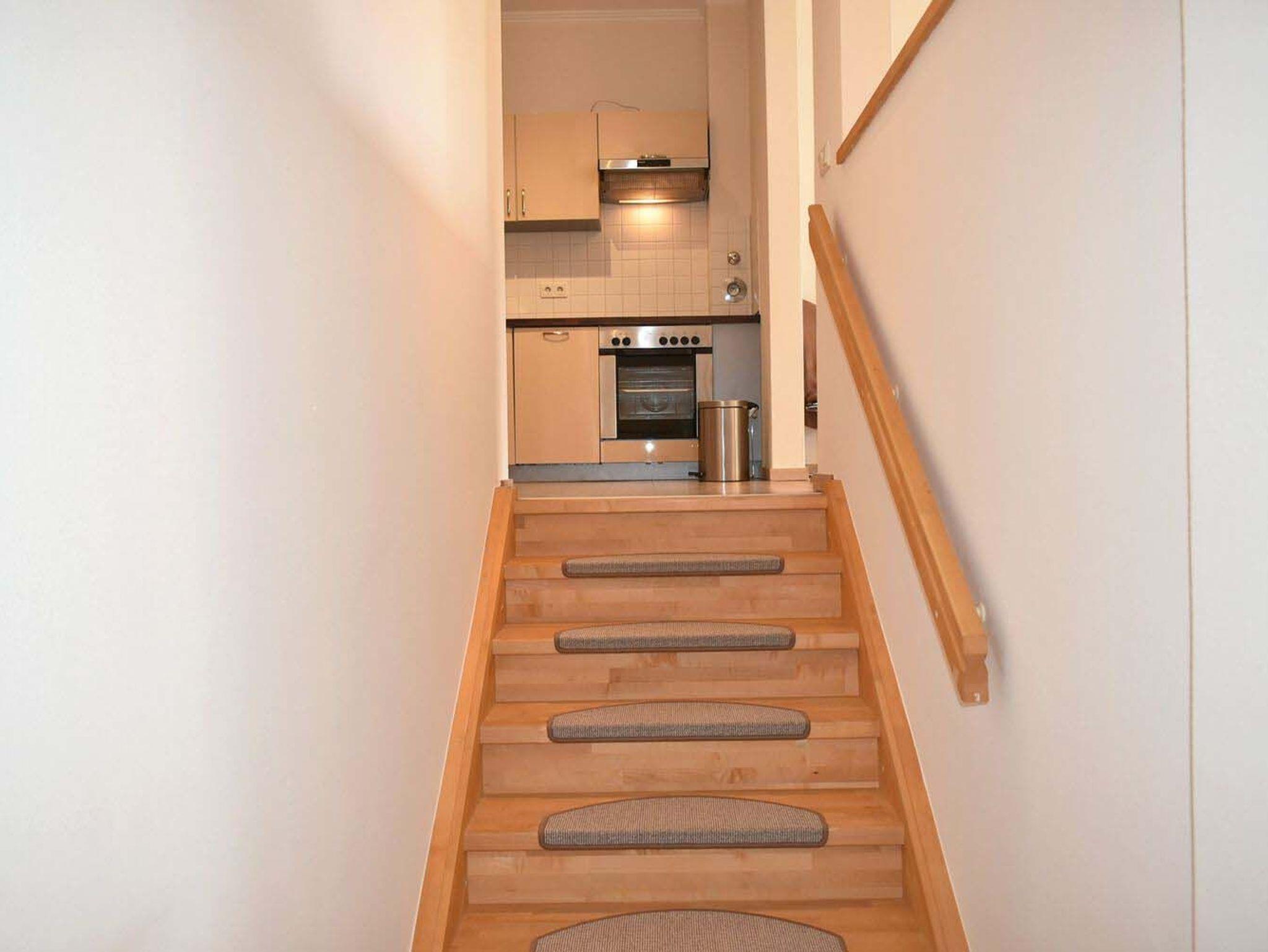 Küche: 4 Plattenherd mit Ceranfeld und Backofen, Dunstabzugshaube, Einbauküche, Geschirr, Kaffeemaschine, Kochtöpfe, Kühlschrank mit Gefrierfach, Mikrowelle, Spülmaschine, Toaster, Treppe nach unten, Wasserkocher