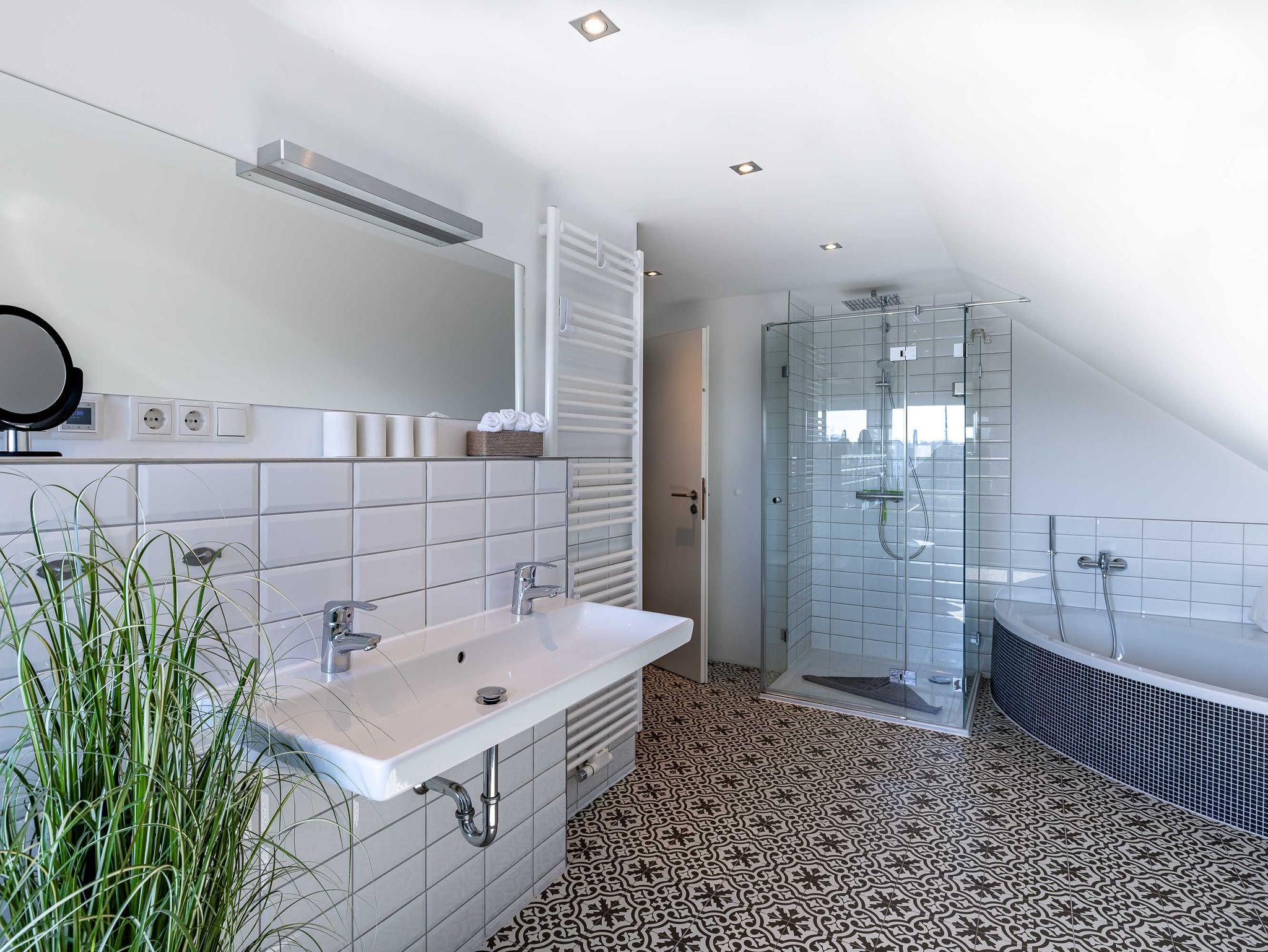 Die Suite ist für Allergiker geeignet und erstklassig ausgestattet. Hier finden Sie alles, was den Urlaub angenehm macht: ein Bad mit Dusche und Badewanne, eine voll ausgestattete Küche mit Kaffeemaschine, Mikrowelle, Wasserkocher und Herd mit Ceranfeld. Für die schnelle Wäsche zwischendurch gibt es eine Waschmaschine mit integriertem Trockner.