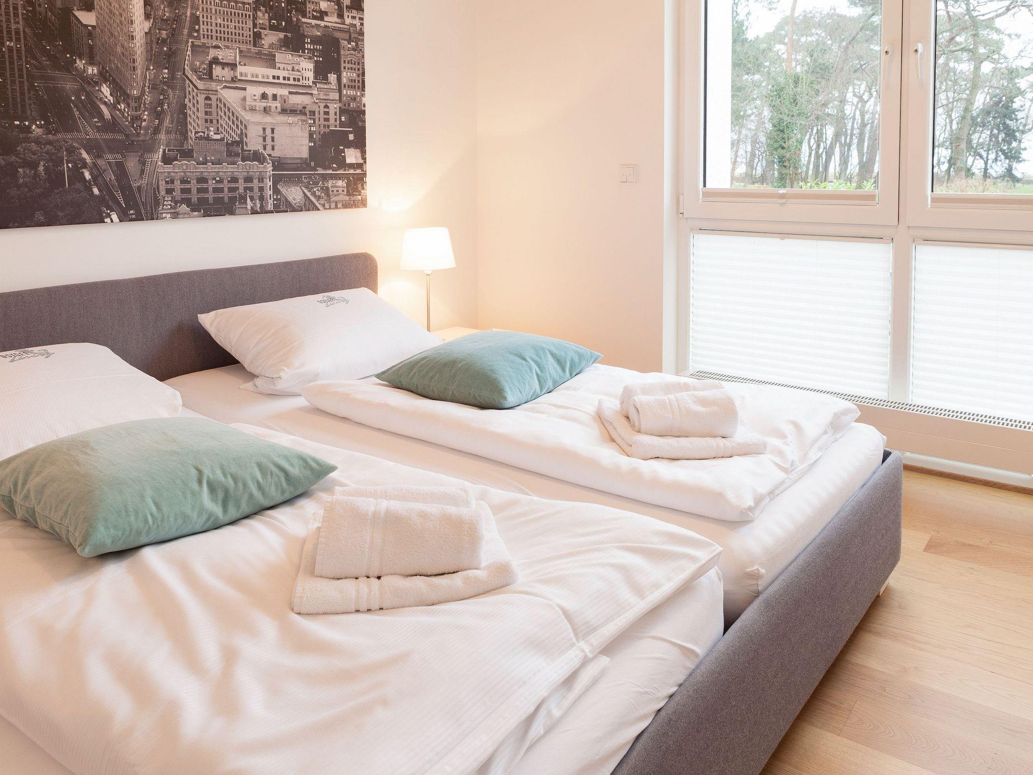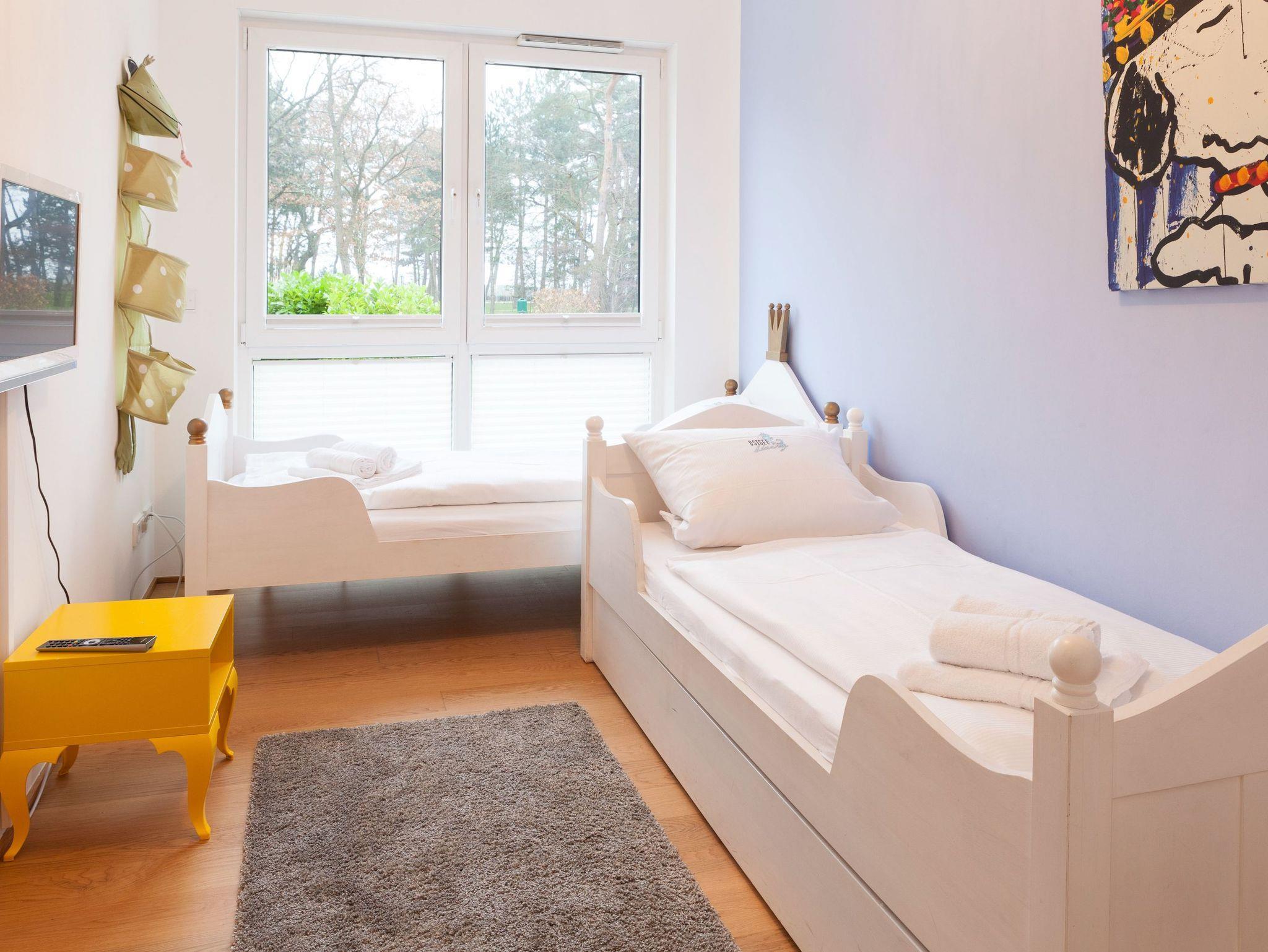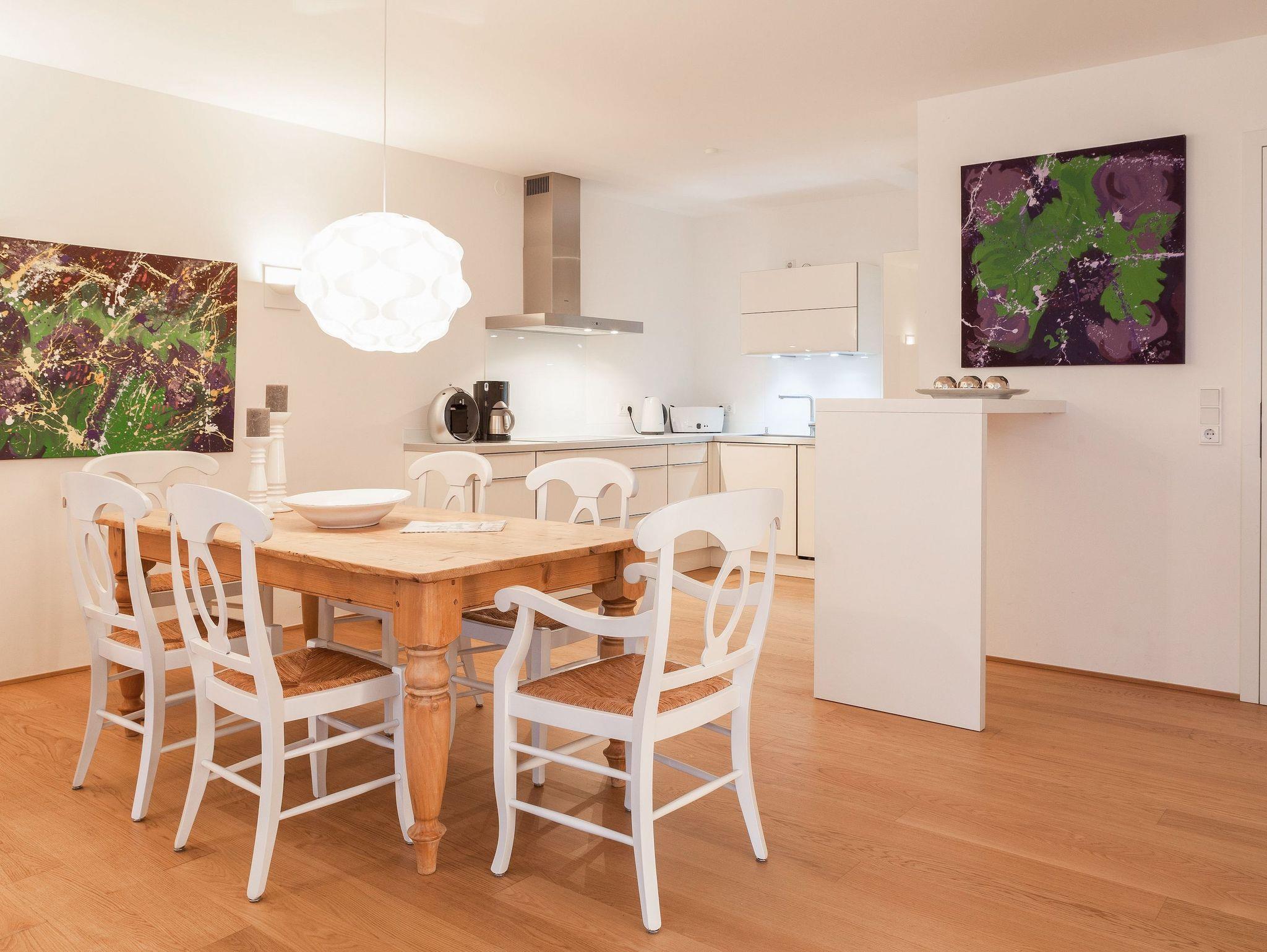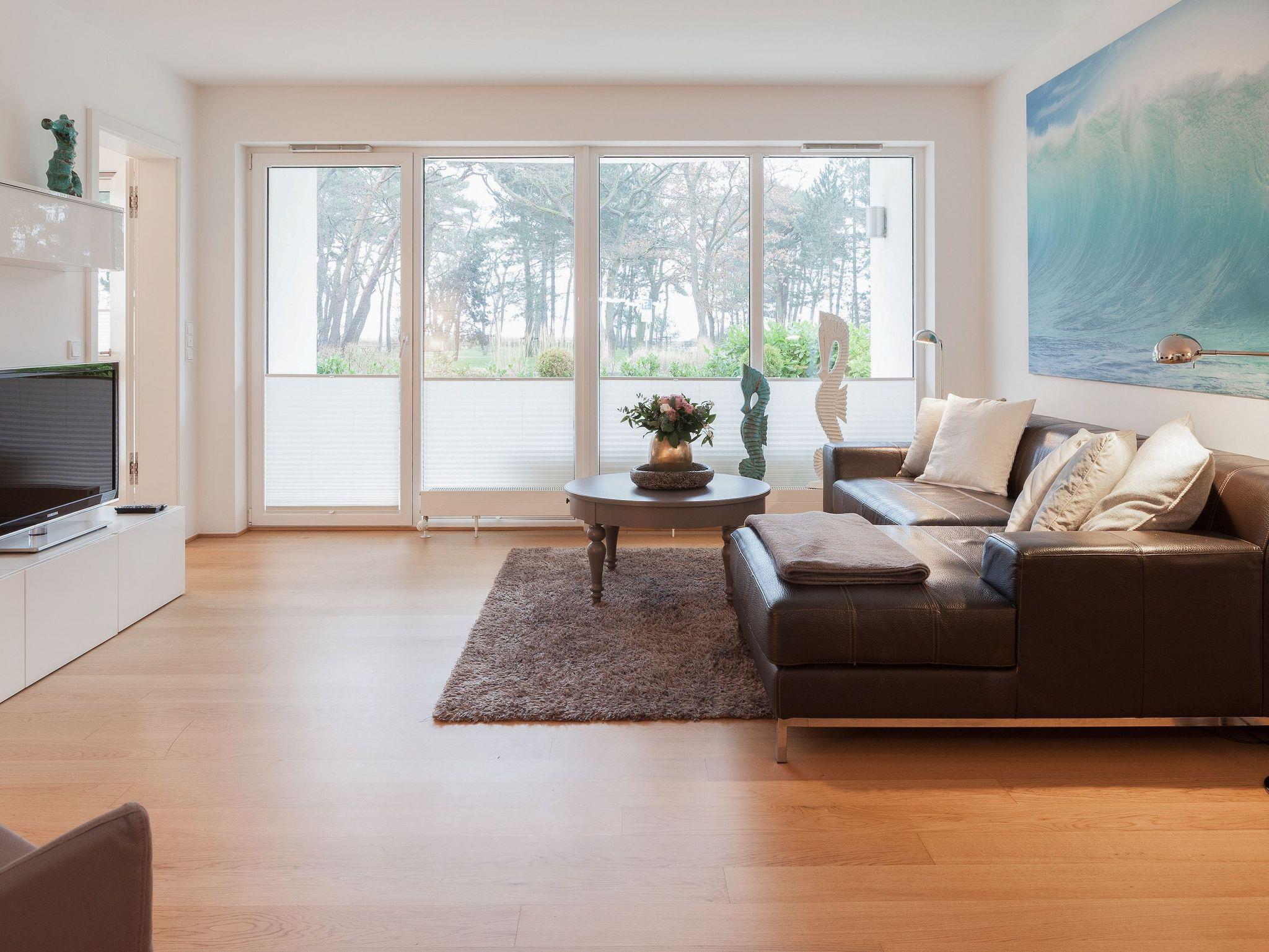 Die moderne, stilvoll eingerichtete Wohnung ist komplett mit Echtholzparkett ausgestattet. Alle Fensterelemente sind bodentief und mit elektrischen Außenjalousien versehen. Es gibt einen großzügigen Wohnraum mit Ethanolkamin, TV, Radio und WLAN[nbsp] und einen tollem Blick bis zur Ostsee. Die offene, moderne Einbauküche mit großzügigem Essbereich genügt höchsten Ansprüchen und verfügt über Mikrowelle, Backofen, Spülmaschine und Induktionskochfeld. Zwei separate Schlafzimmer (ein Doppelbett 200x200 und 2 Einzelbetten 80x200), ein weiterer TV mit integriertem DVD Laufwerk sowie ein modernes Bad mit großem, ebenerdigen Duschbereich und Fußbodenheizung stehen zur Verfügung. Die riesige, 50 qm große Terrasse ist mit Esstisch und Stühlen sowie mit gemütlichen Loungemöbeln ausgestattet, überdacht und windgeschützt. Herrlich zum Entspannen und den schönen Blick auf die Ostsee zu genießen. Das Haus am Meer verfügt über einen Fahrstuhl und eine Tiefgarage (Einfahrstshöhe 2 m), in der ein fester Stellplatz reserviert ist. Ein Fahrradkeller, Münzwaschmaschine und -Trockner sind vorhanden. Für unsere kleinen Gäste befindet sich auf der Gartenseite des Hauses ein Spielplatz.