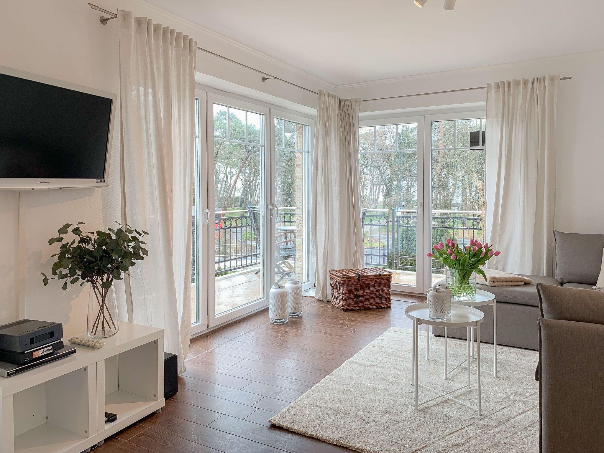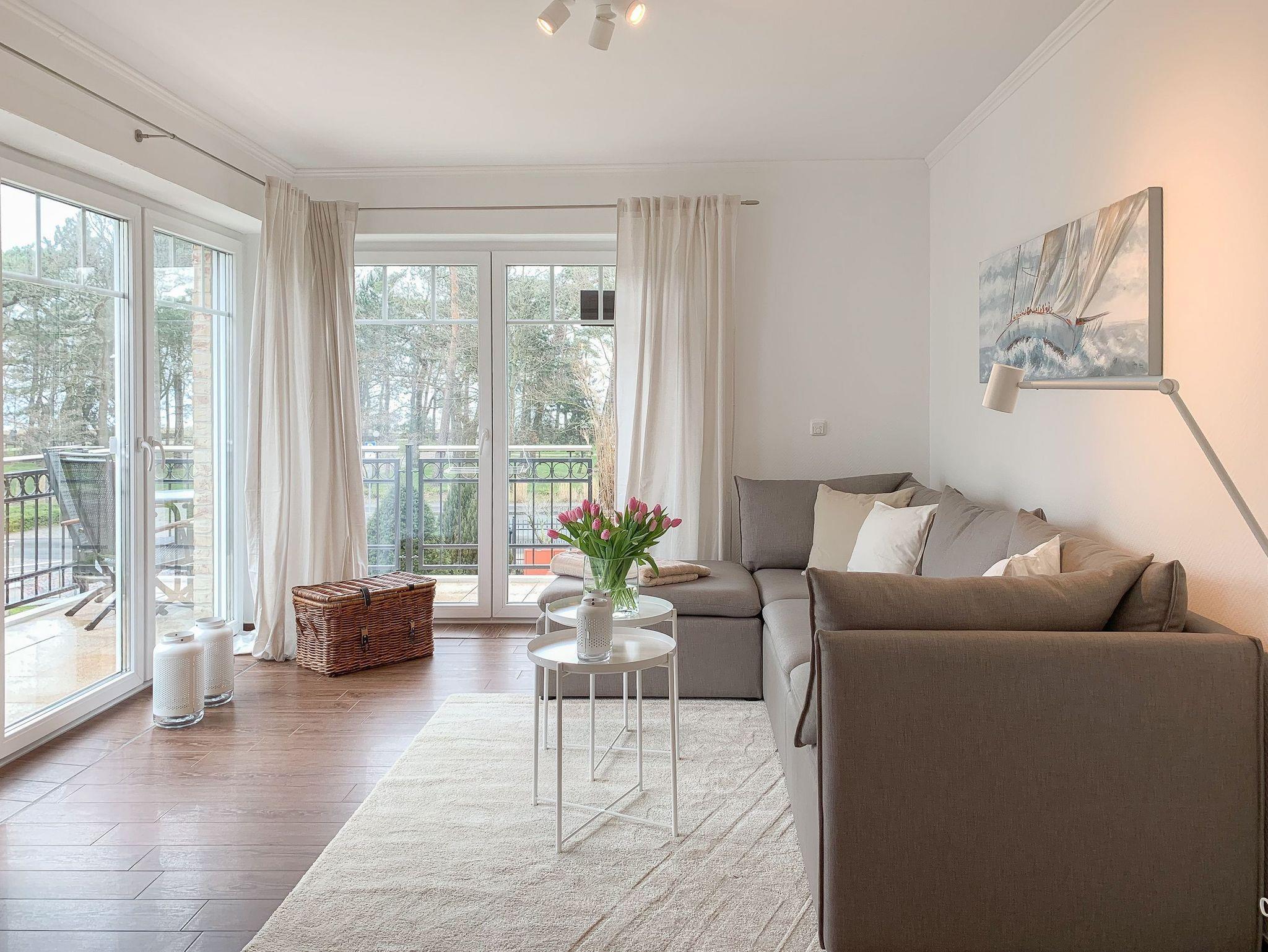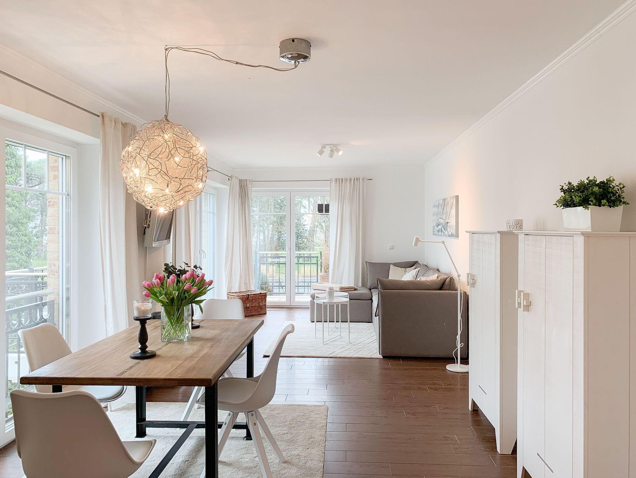 Die hochwertige Wohnung verfügt über einen kombinierten Wohn- Essbereich mit großen, bodentiefen Fensterflächen und Zugang zu dem schönen, umlaufenden Balkon zur Seeseite und in westlicher Ausrichtung mit tollem Blick ins Grün des gegenüberliegenden Parks bis zur Ostsee. Die offene, moderne Einbauküche verfügt über Ceranfeld, Backofen, Mikrowelle und Geschirrspülmaschine. Es gibt ein Schlafzimmer mit Boxspringdoppelbett (160x200)[nbsp] und ein weiteres Schlafzimmer mit einem Einzelbett mit Auszug (160x200) sowie ein modernes Duschbad. Sämtliche Fenster sind mit elektrischen Außenjalousien versehen. Kostenloser Internetzugang über WLAN. Ein Tiefgaragenstellplatz (Einfahrthöhe 2m) Waschmaschine und Trockner sind exklusiv für diese Wohnung vorhanden. Das Objekt verfügt über einen Fahrstuhl und einen Fahrradkeller. Direkt gegenüber am Strand steht ein Strandkorb (saisonbedingt Mitte Mai bis Mitte September) zur kostenlosen Nutzung am Strand bereit.