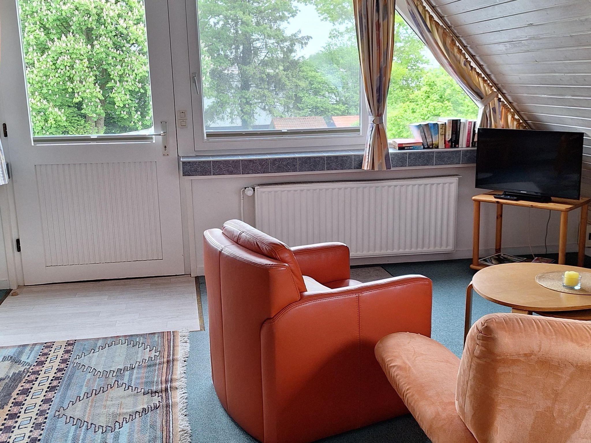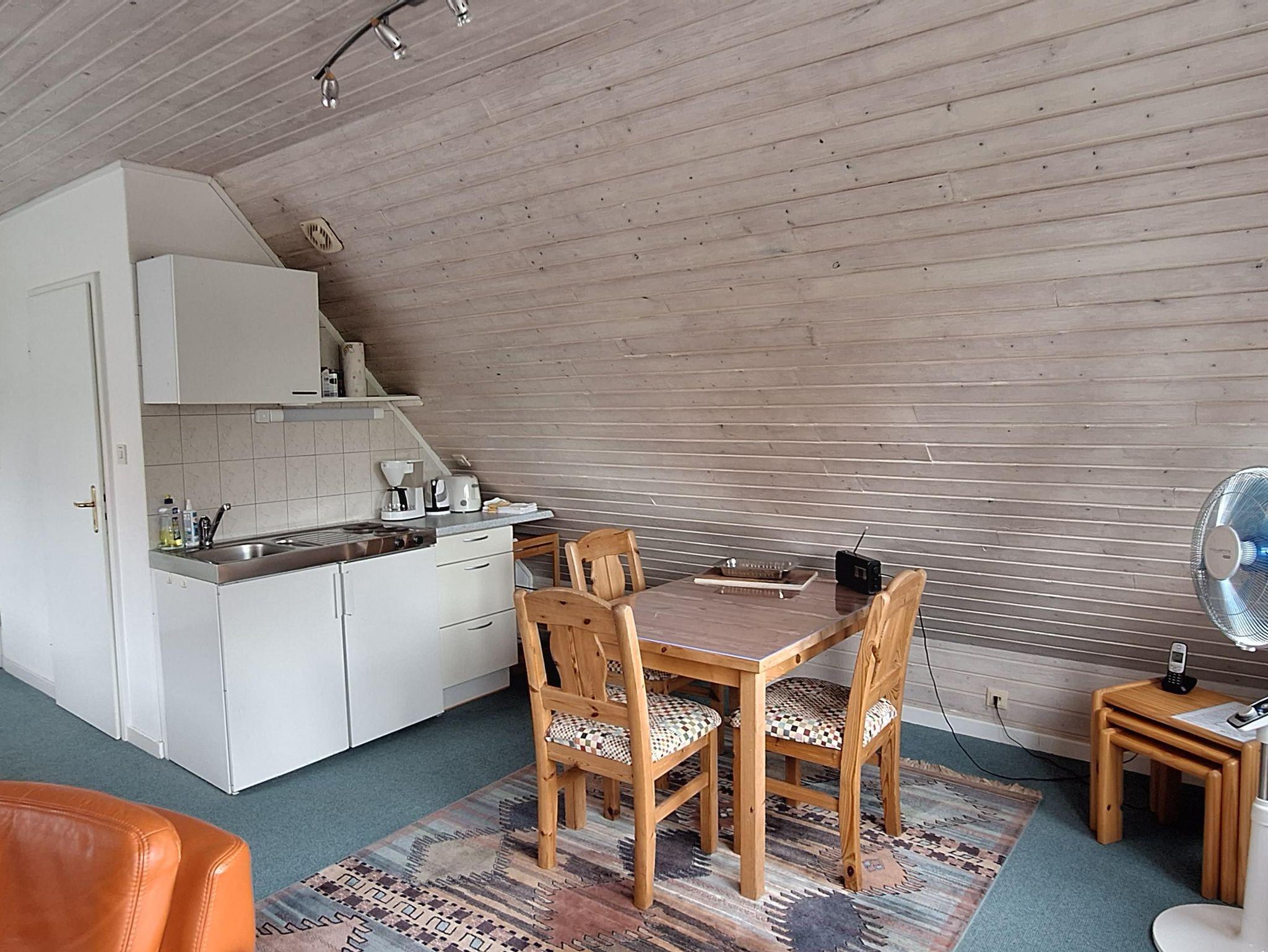 Das 1-Raum-Apartment mit Balkon befindet sich im Dachgeschoss des Hauptauses und liegt zur Gartenseite. Die 35 m2 beherbergen einen behaglich ausgestatteten Wohn-Schlafraum mit Fernsehen und Telefon und integrierter Pantry-Küche sowie ein serepates Duschbad. Bettwäsche und Handtücher sind vorhanden. PKW-Stellplatz und Fahrradunterstand stehen kostenlos zur Verfügung. Maximale Belegung 2 Personen (nur Erwachsene). Keine Haustiere.