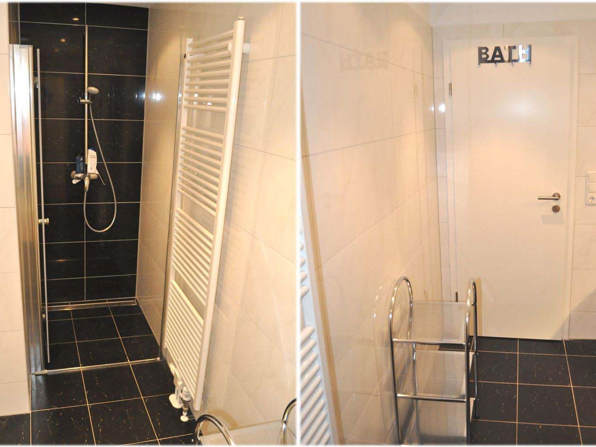 Bad 1: Dusche bodengleich, Duschkabine, Regal, Spiegel, Waschbecken, WC