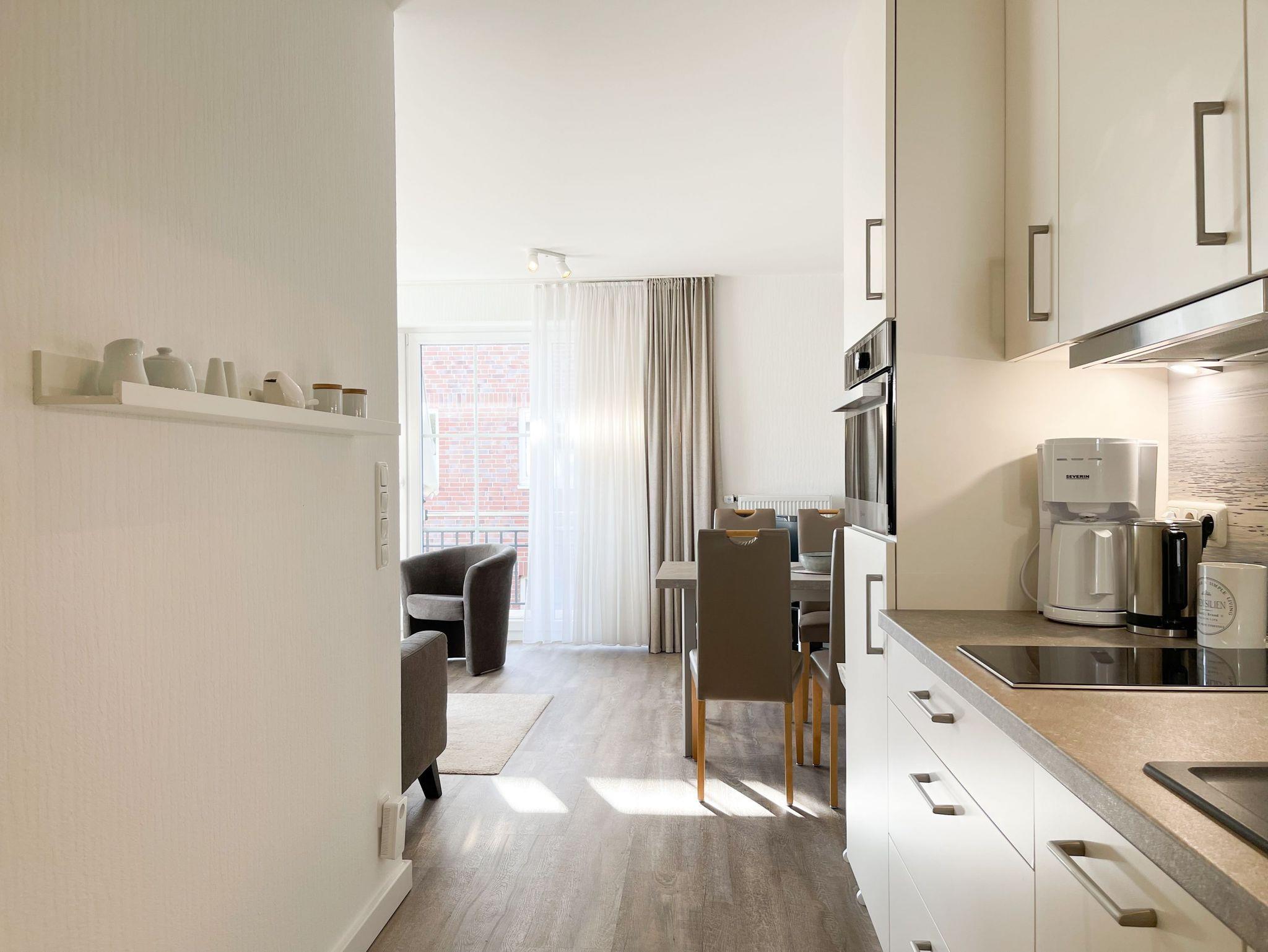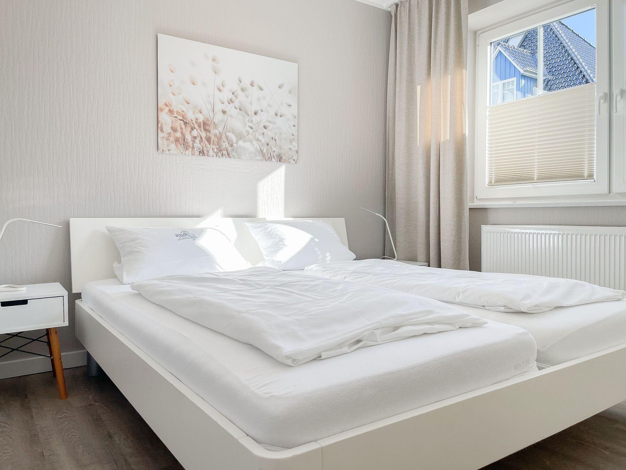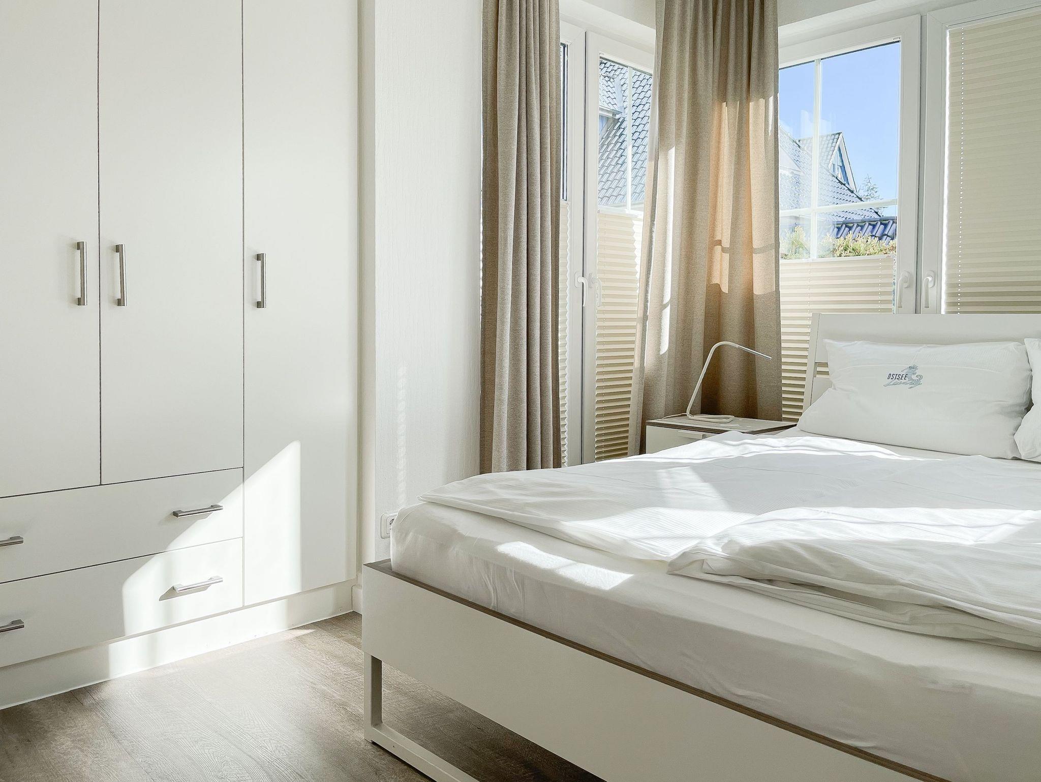 Die komfortable Ferienwohnung bietet mit zwei separaten Schlafzimmern, jeweils ausgestattet mit einem Doppelbett[nbsp] und Verdunkelungsmöglichkeit, ausreichend Platz für einen entspannten Urlaub für 4 Personen. Es erwartet Sie ein sonniger Wohnbereich mit bodentiefen Fensterelementen und umlaufendem Südbalkon sowie eine gut ausgestattete, offene Küche. Der angrenzende Essbereich ist für 4 Personen ausgelegt. TV, WLAN und Hifi Anlage stehen zur Verfügung. Das moderne Bad ist mit Dusche, Fenster, Handtuchwärmer, Föhn und Kosmetikspiegel ausgestattet.