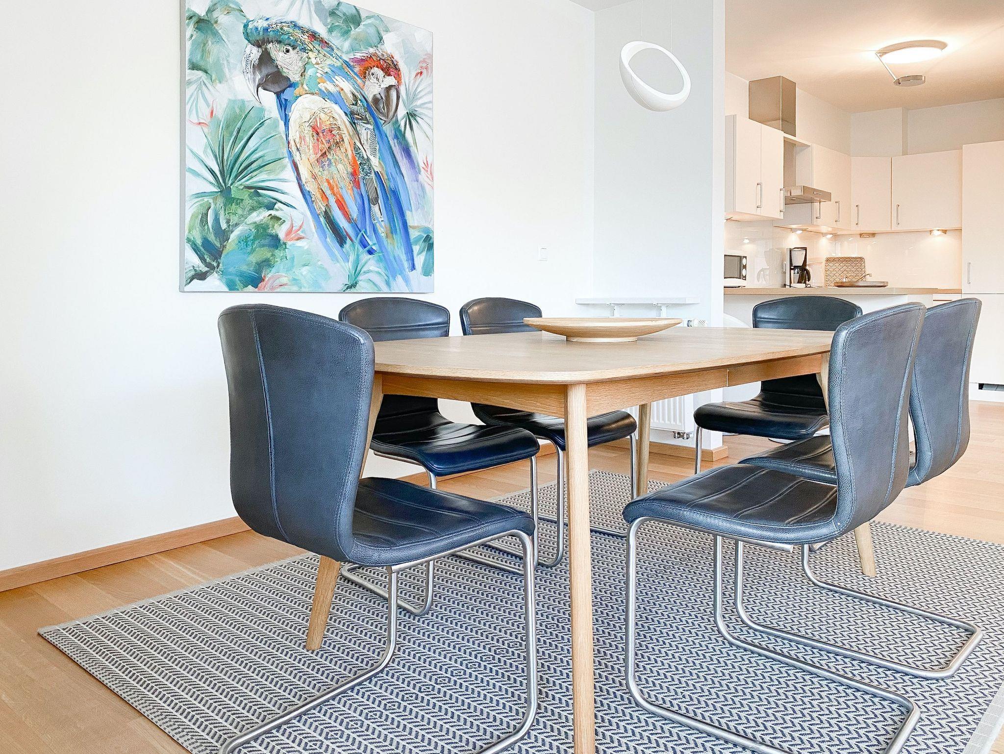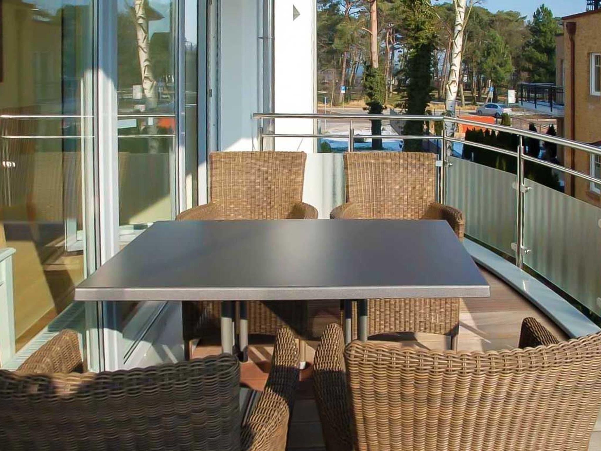 Die 92 qm große Wohnung befindet sich im ersten Obergeschoss und verfügt über zwei separate Schlafzimmer - ausgestattet mit Doppelbett (180x200) und zwei Einzelbetten (80x200) mit TV - [nbsp]ein komfortables Duschbad mit Fußbodenheizung sowie ein separates Gäste WC.[nbsp] Es gibt einen geschmackvollen Wohnbereich mit TV, Radio und WLAN, einen großzügigen Essbereich und eine offene Einbauküche, bestens ausgestattet mit Mikrowelle, Backofen und Spülmaschine.[nbsp] Der großzügige, überdachte Südbalkon bietet in östlicher Richtung einen schönen Blick auf den gegenüberliegenden Park und die Ostsee. Die großen Fensterelemente und das verwendete Echtholzparkett in diesem Objekt sorgen für eine helle, freundliche Wohnatmosphäre. Ankommen und Wohlfühlen!