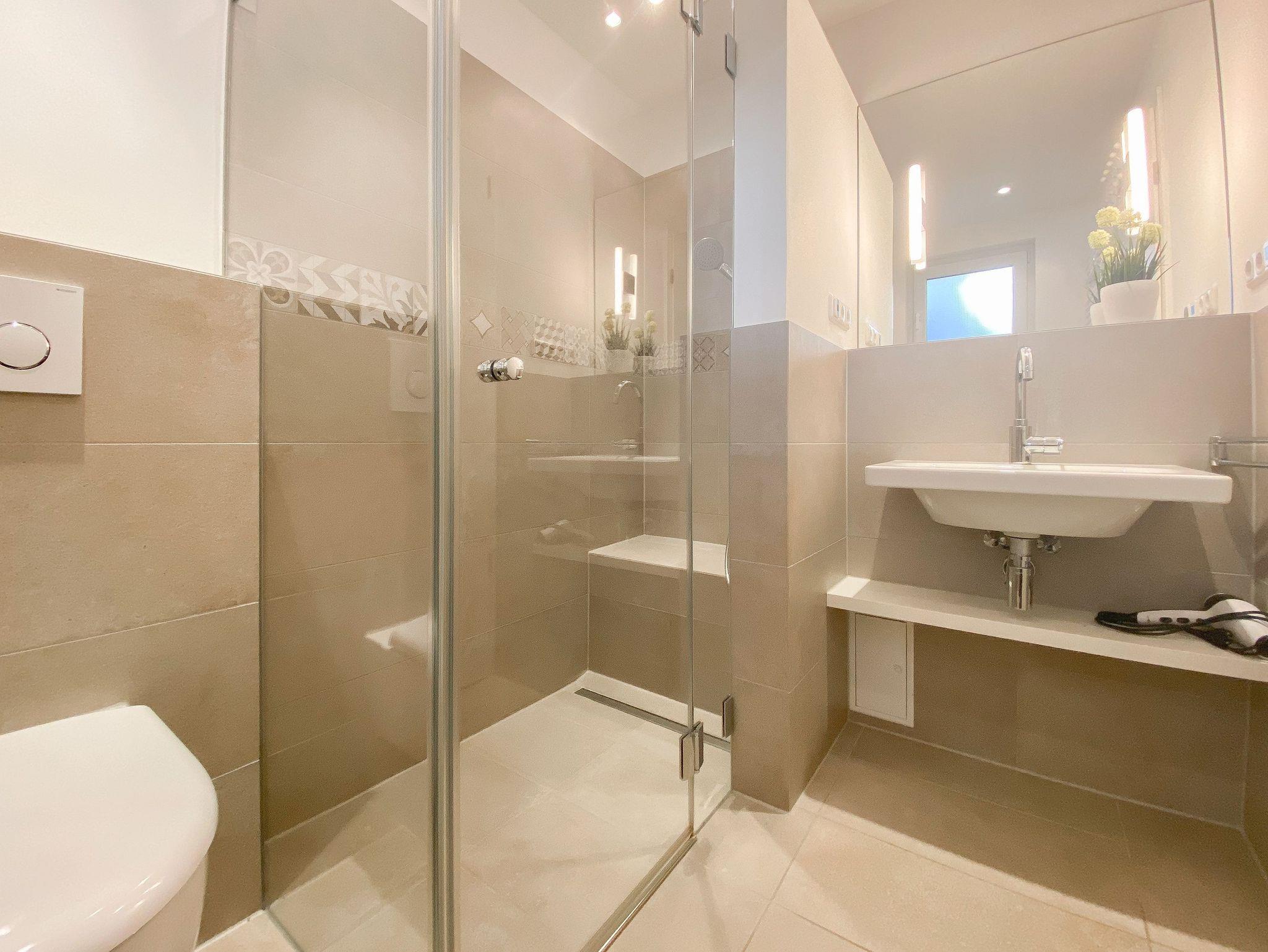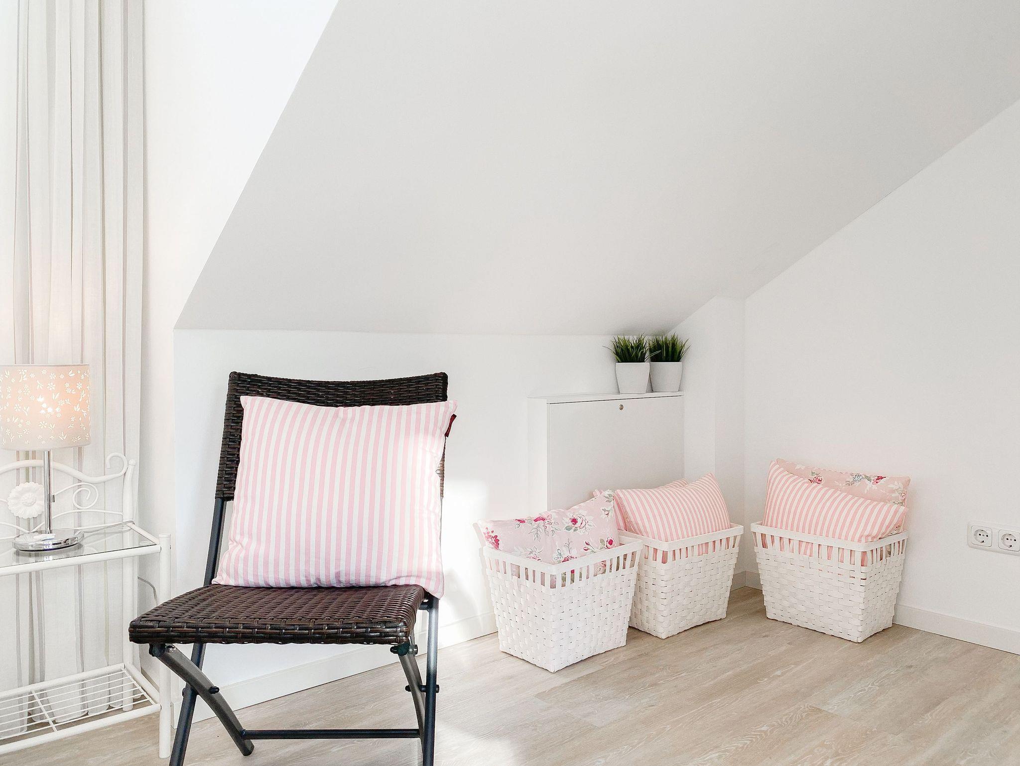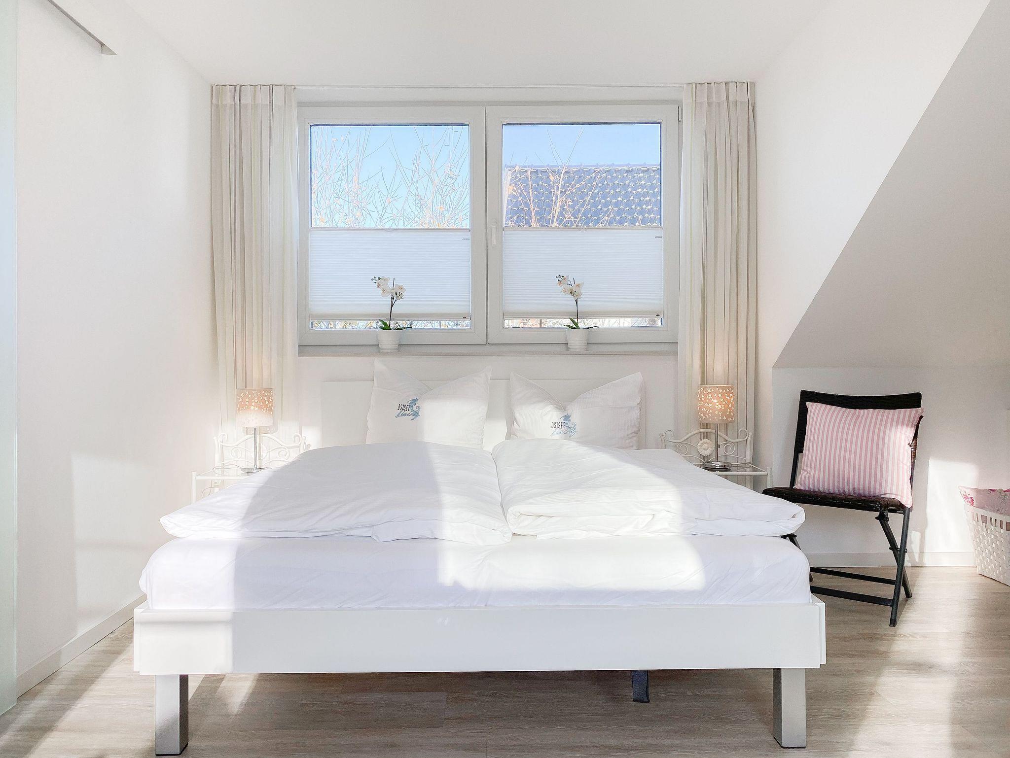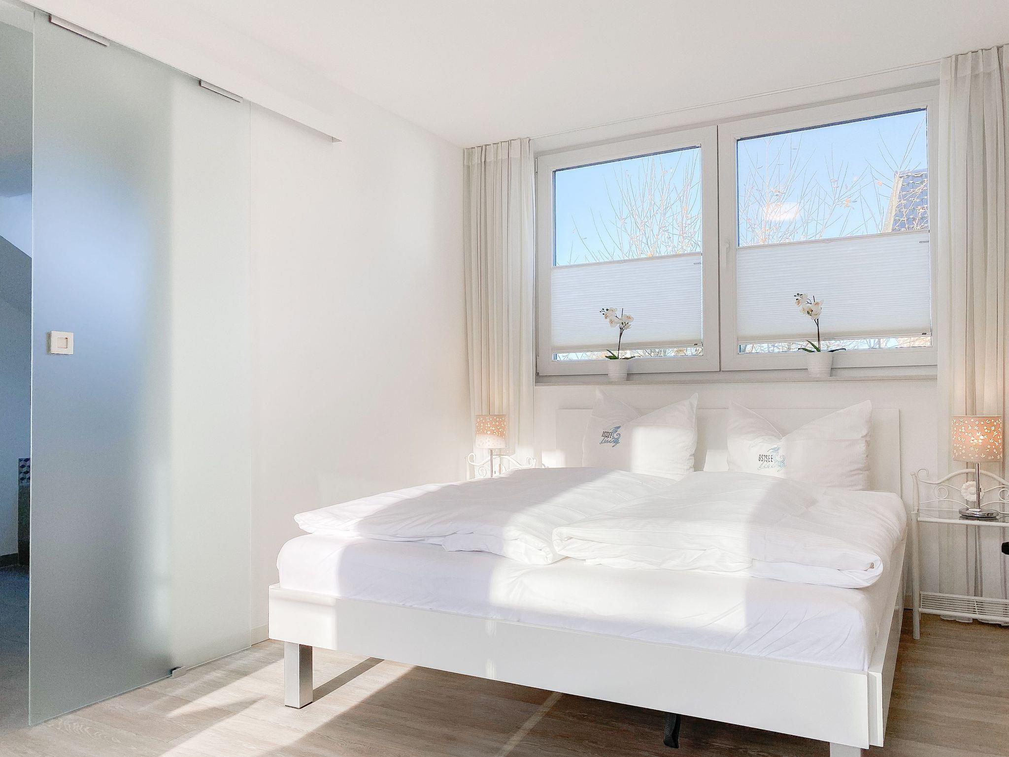Die lichtdurchflutete Maisonette mit zwei separaten Schlafzimmern, zwei Bädern und zwei Balkonen erstreckt sich über zwei Wohnebenen. Fröhliche Farben und ein jugendlich- modernes Innendesign sorgen für gute Laune. In der unteren Etage erwartet Sie ein offener Wohn-Essbereich, an den sich eine voll ausgestattete moderne Küche anschließt. Der möblierte Balkon in Südwest Lage lädt zu Mahlzeiten an der frischen Seeluft ein. Hier können Sie gemütlich die Sonnenstunden am Nachmittag und späten Abend genießen. Das Schlafzimmer ist mit einem hochwertigen und großen Doppelbett (200 x 200) ausgestattet und verspricht erholsame Stunden nach einem ereignisreichen Urlaubstag. Gegenüber befindet sich ein Tageslichtbad mit komfortabler Walk In Dusche. Über eine Holztreppe gelangen Sie zur oberen Wohnebene. Das zweite Schlafzimmer ist ebenfalls mit einem Doppelbett (160 x 200) eingerichtet und verfügt über einen Sitzbereich mit TV. Ein modernes, großzügiges Bad mit Badewanne schließt sich direkt an das Schlafzimmer an und[nbsp] bietet Ihnen entsprechende Privatsphäre. Das Highlight ist der eigene Zugang zur hochwertig möblierten Dachterrasse, ausgestattet mit bequemen Rattansesseln, die in eine Liegeposition verstellbar sind. In jedem Raum ist ein Fenster mit einem Fliegengitter ausgestattet, sodass mückenfreies Lüften gewährleistet ist. Auf Wunsch können alle Wohnräume mit elektrischen Außenjalousien verdunkelt werden. Eine zusätzliche, zentrale Steuerung befindet sich im Eingangsbereich. Die Temperatur der Fußbodenheizung lässt sich für jeden Raum separat regulieren. Zwei TV, ein[nbsp] Radio und kostenloses WLAN gehören zum Entertainment-Paket. Ein Fahrstuhl ist selbstverständlich vorhanden.