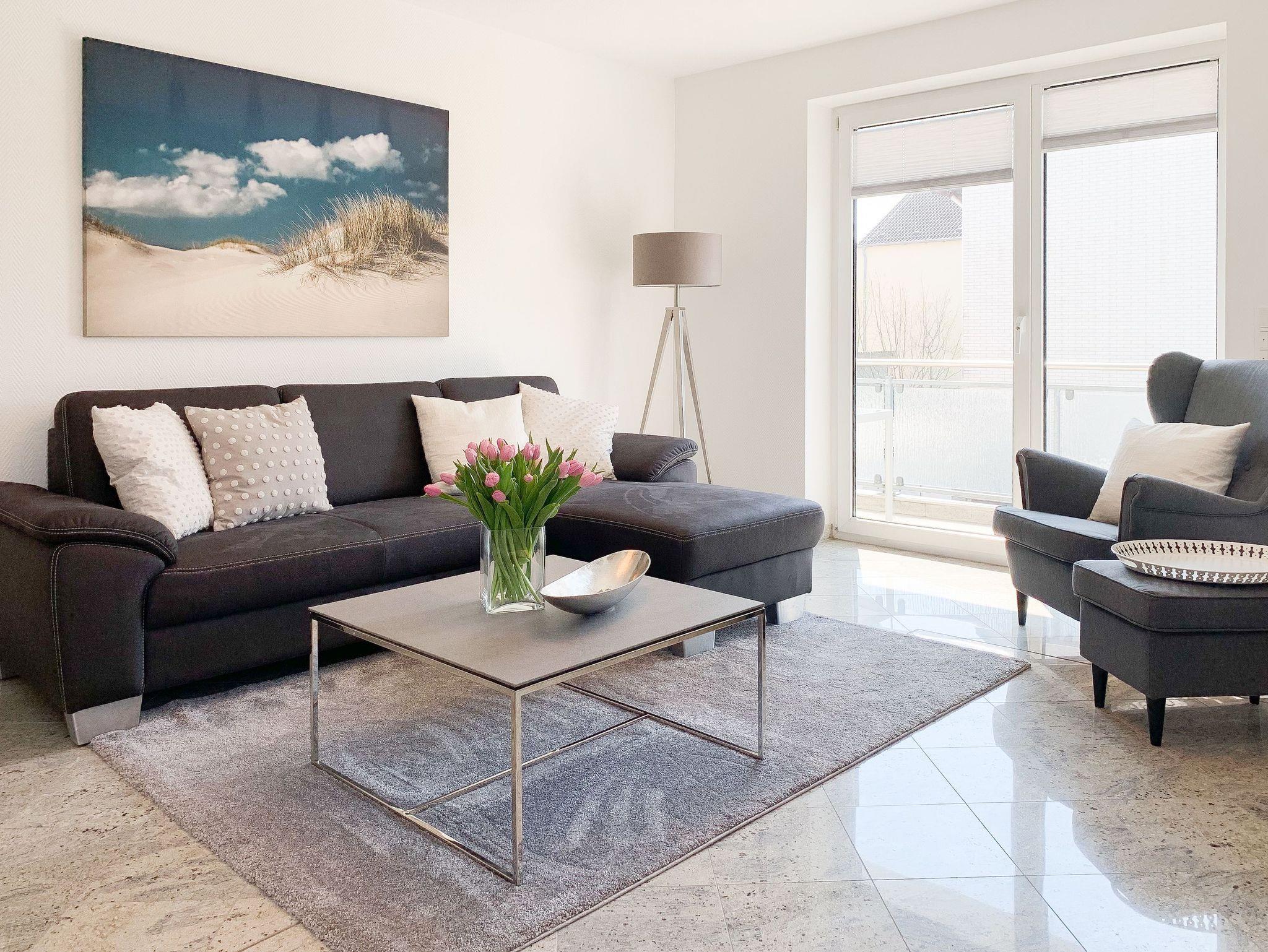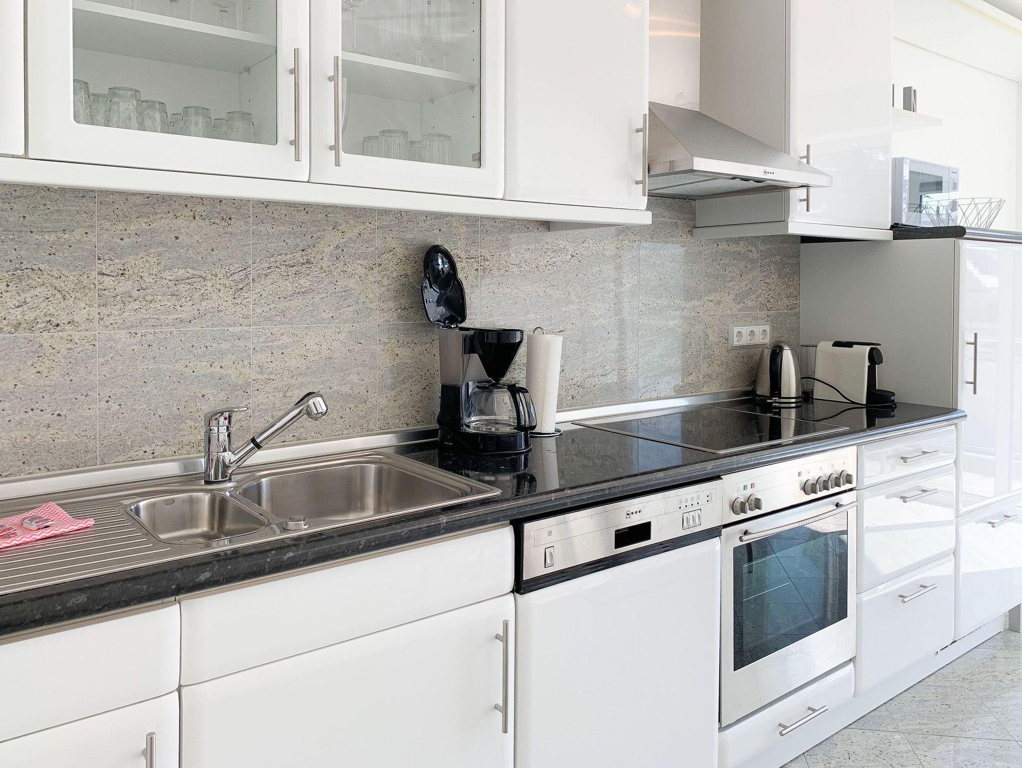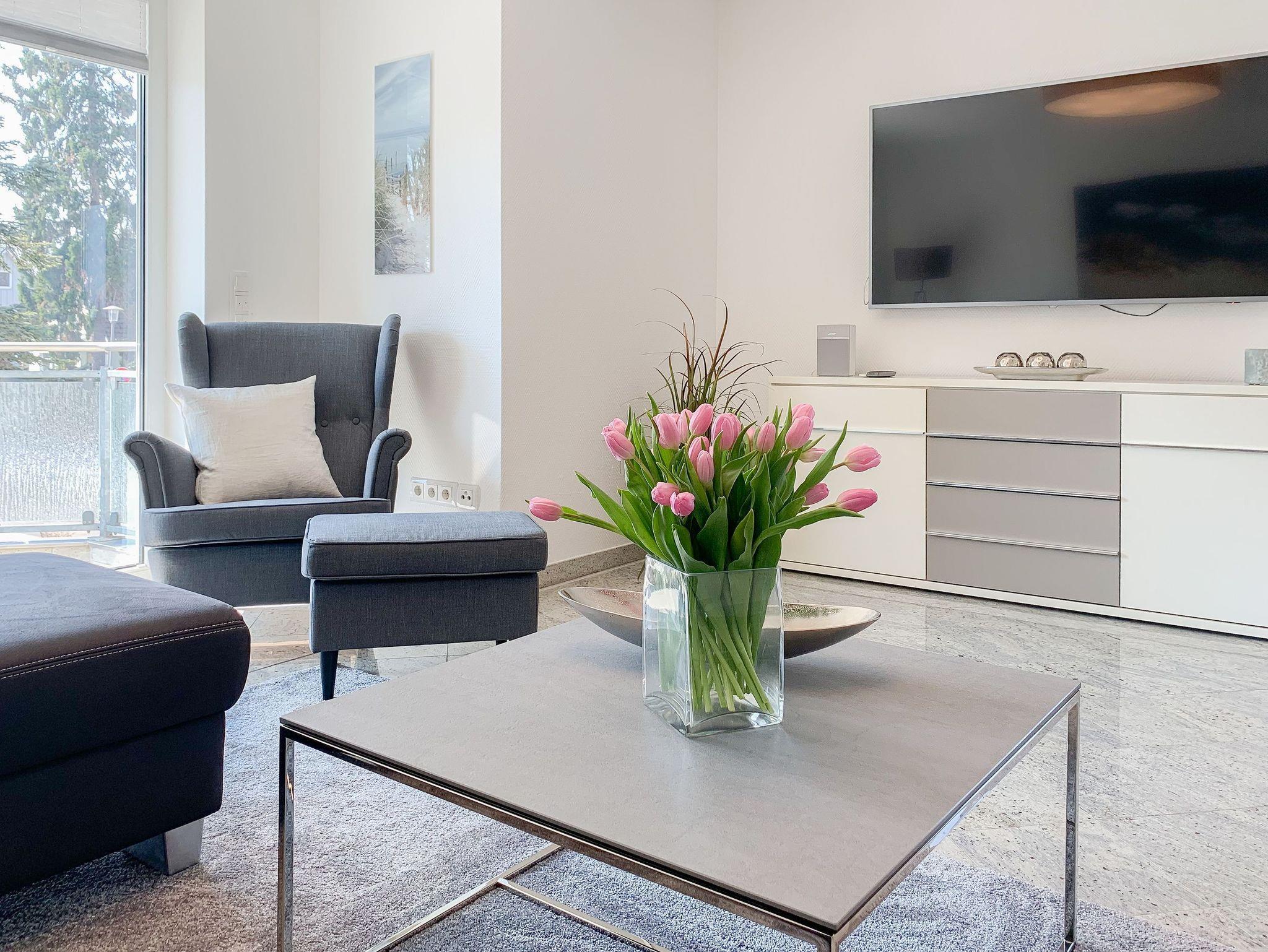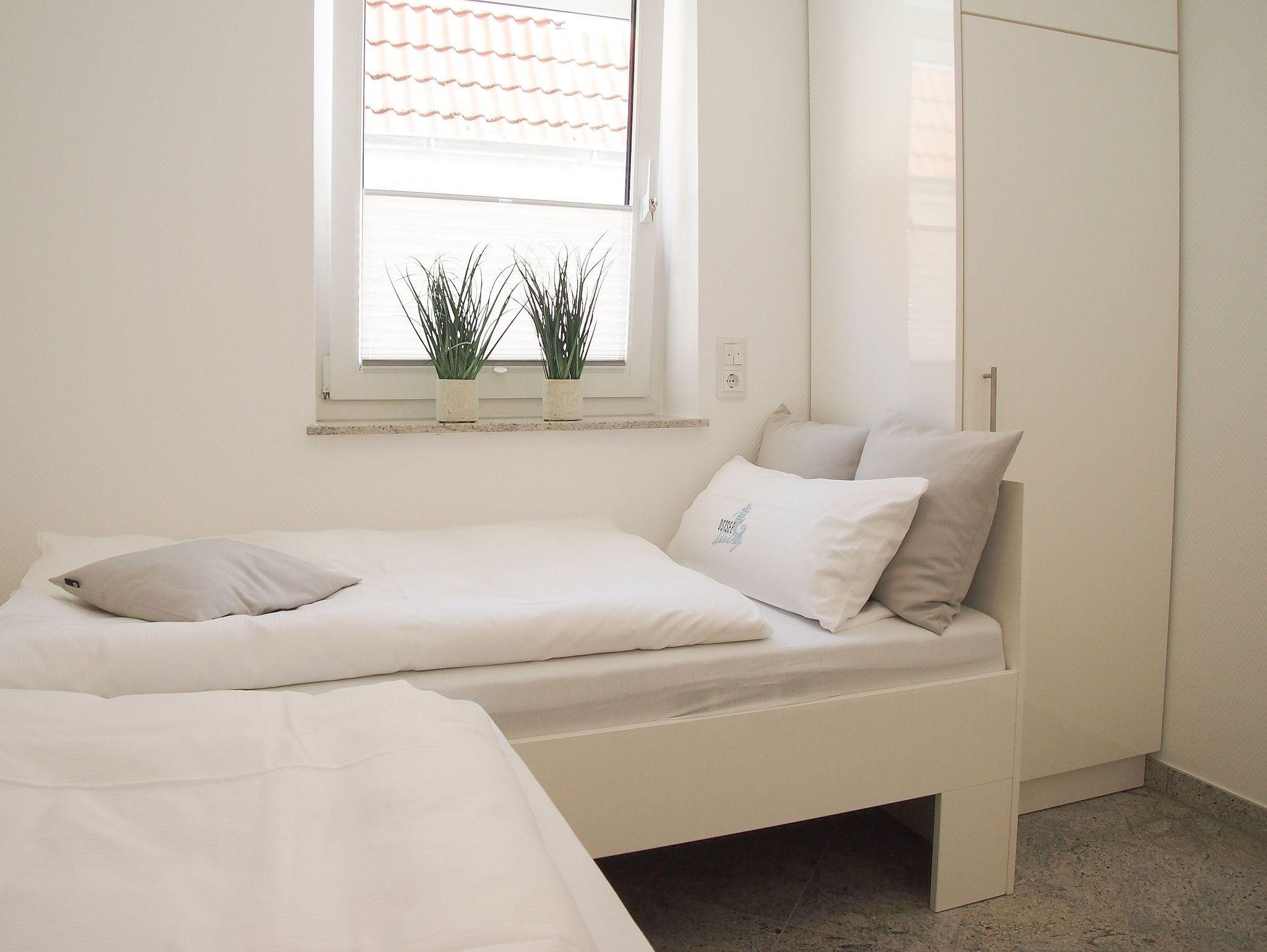 Mittelpunkt der Ferienwohnung ist der großzügige, geschmackvoll gestaltete Wohnbereich mit angrenzendem Essbereich, der 4 Personen ausreichend Platz bietet. TV, Radio, Bose Bluetooth Lautsprecher und kostenloser Internetzugang über WLAN sind selbstverständlich vorhanden. Die moderne, abgeschlossene Küche ist bestens ausgestattet und verfügt über alle technischen Geräte. Ein Bartisch mit zwei Stühlen dient als zusätzlicher Frühstücksbereich oder als Treffpunkt für gemeinsames Kochen. Zwei separate Schlafzimmer liegen[nbsp] ruhig zur straßenabgewandten Seite. Sie sind mit[nbsp] maßgefertigten Einbauschränken und elektrischen Außenjalousien ausgestattet. Das eine Schlafzimmer verfügt über zwei Einzelbetten (90x200), das andere über ein Doppelbett (180x200) und einen zusätzlichen TV. Das Bad ist mit einem weiteren Bluetooth Lautsprecher, Dusche, Waschtisch, WC, Handtuchwärmer und einer Waschmaschine ausgestattet.