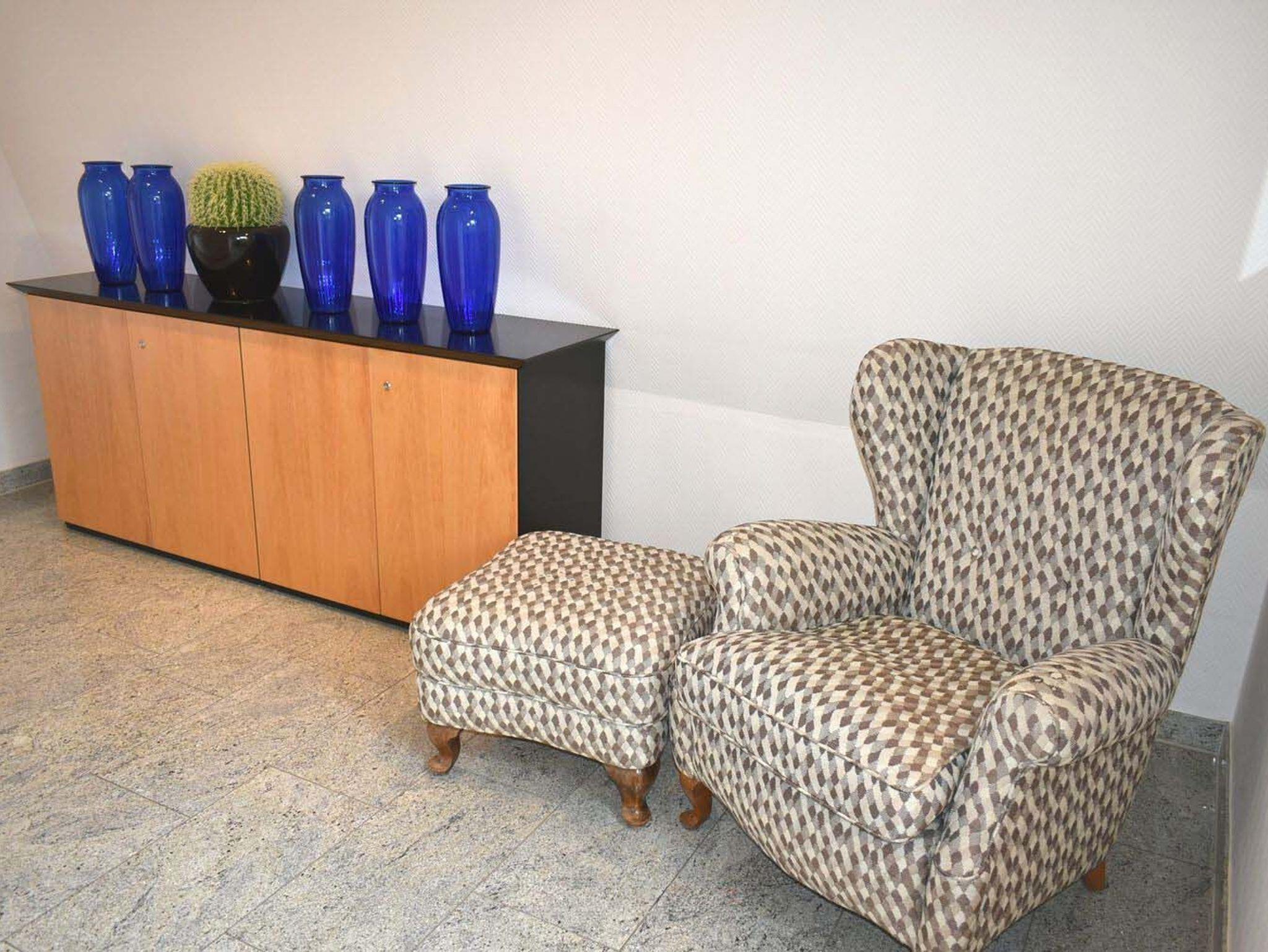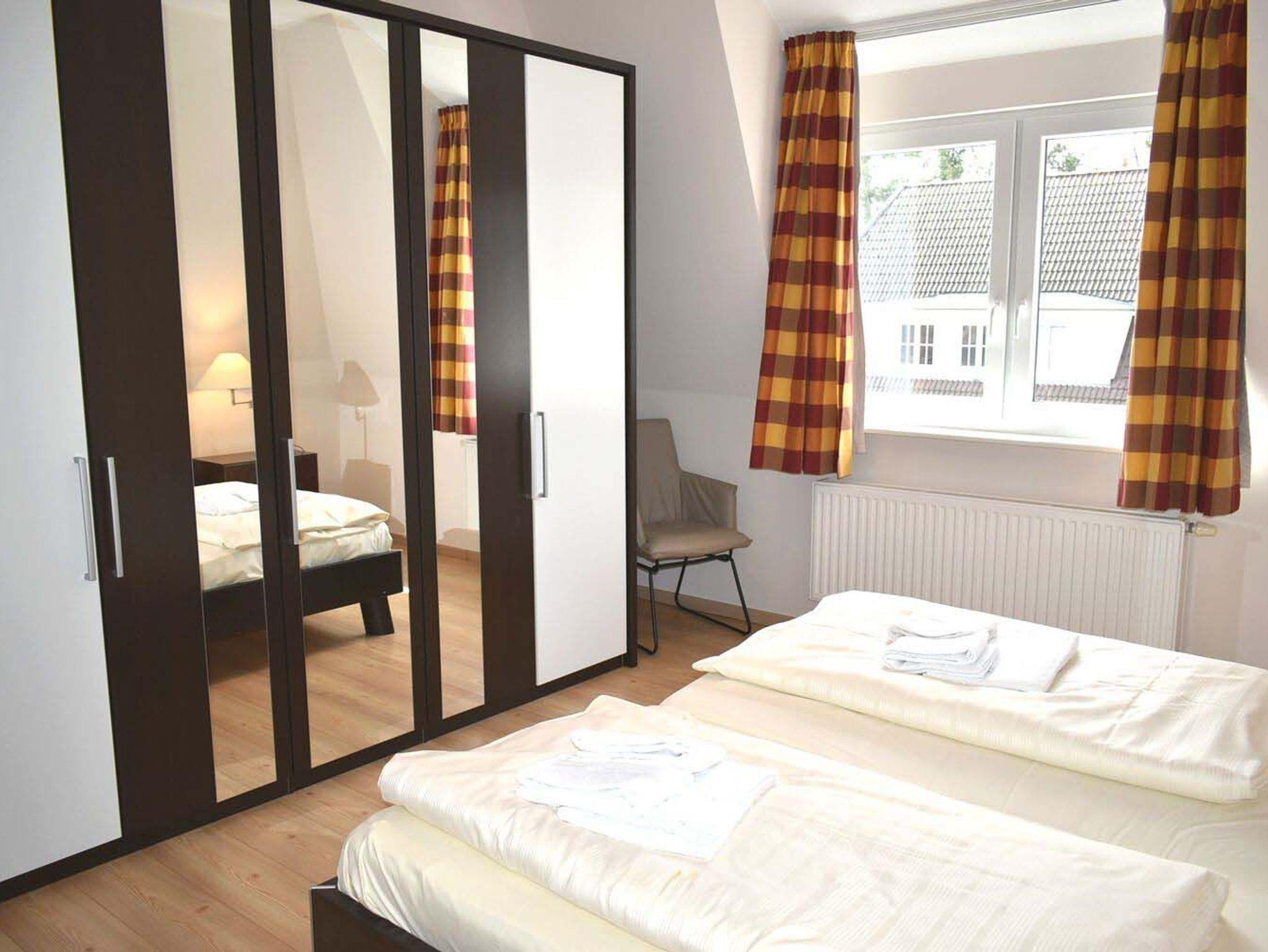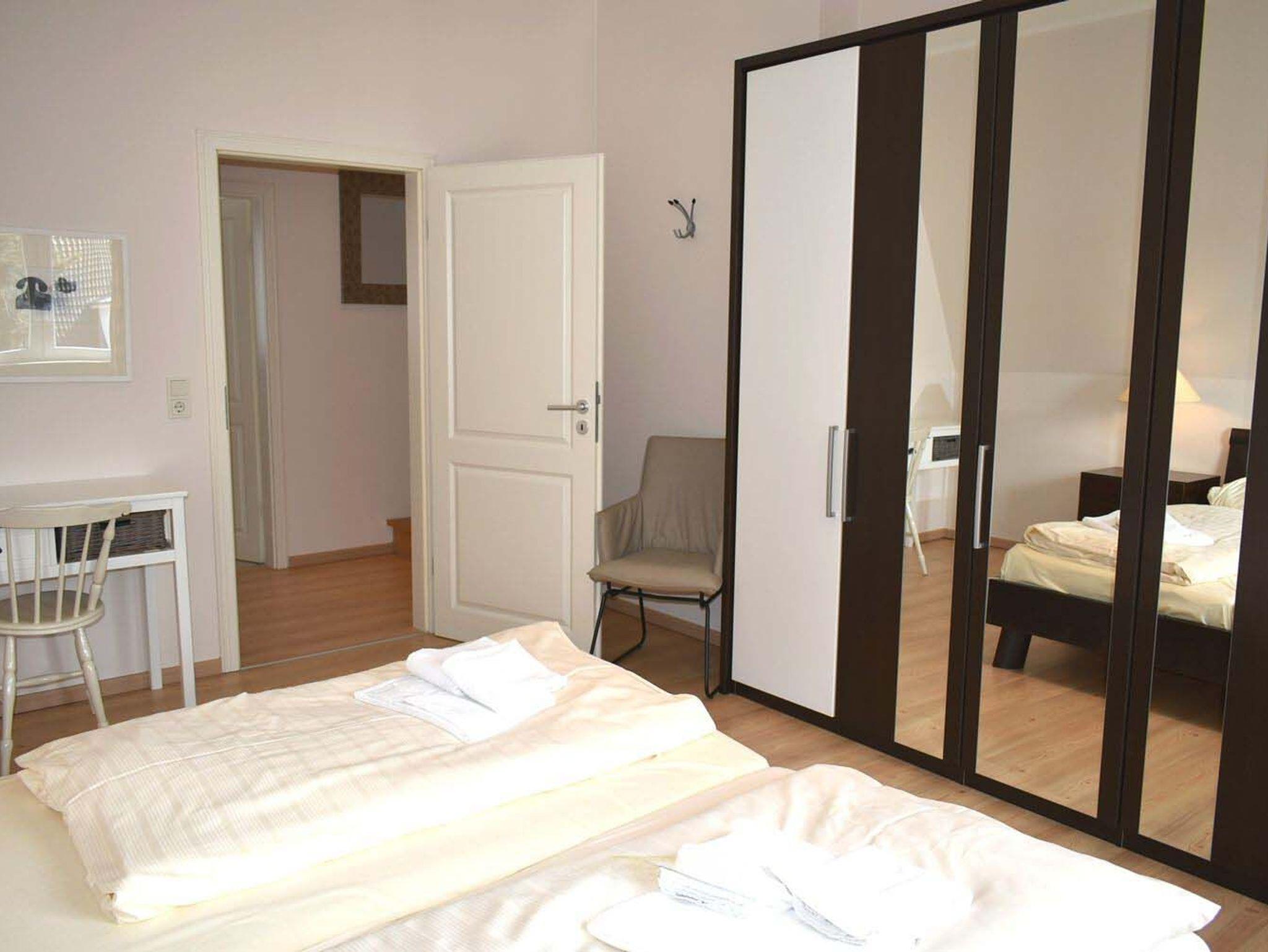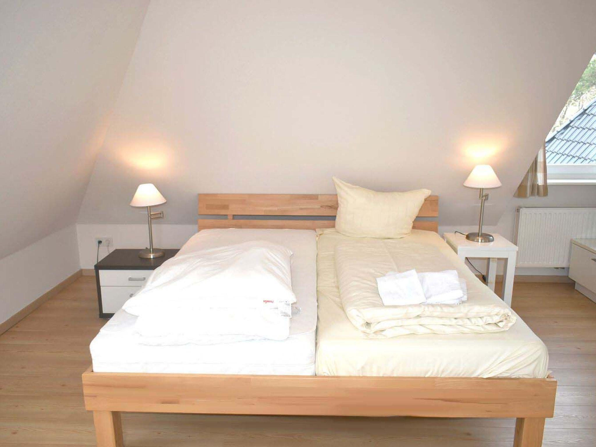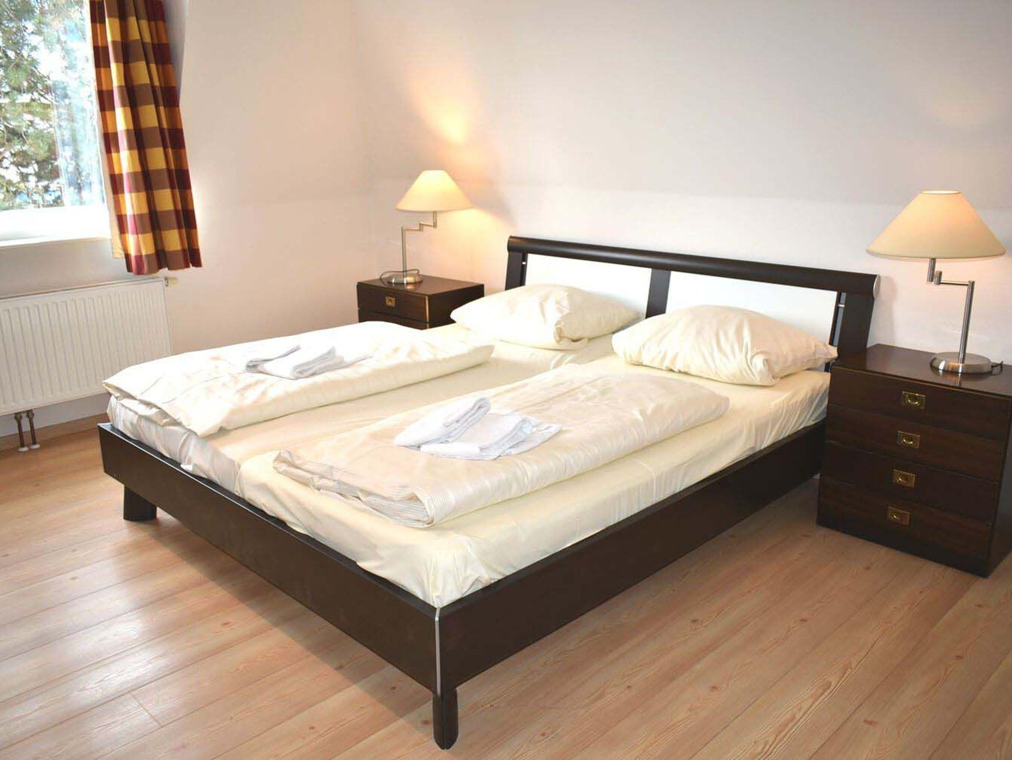 Schlafzimmer 1: 2 Matratzen, 2 Sessel, 3 Nachttische, Doppelbett 2,00 x 1,80 m, Kleiderschrank, Radiowecker, Spiegel, Verdunklungsstores