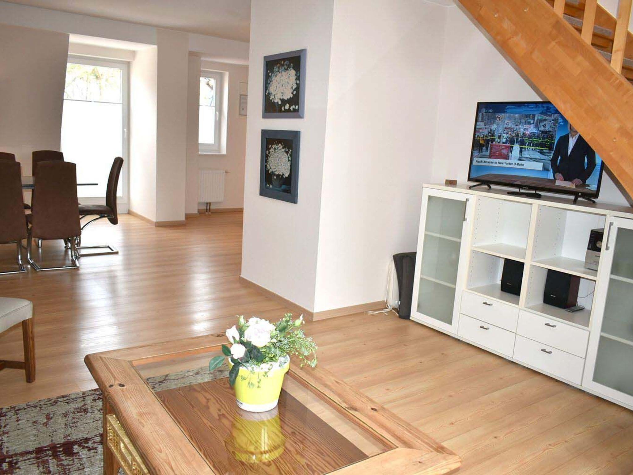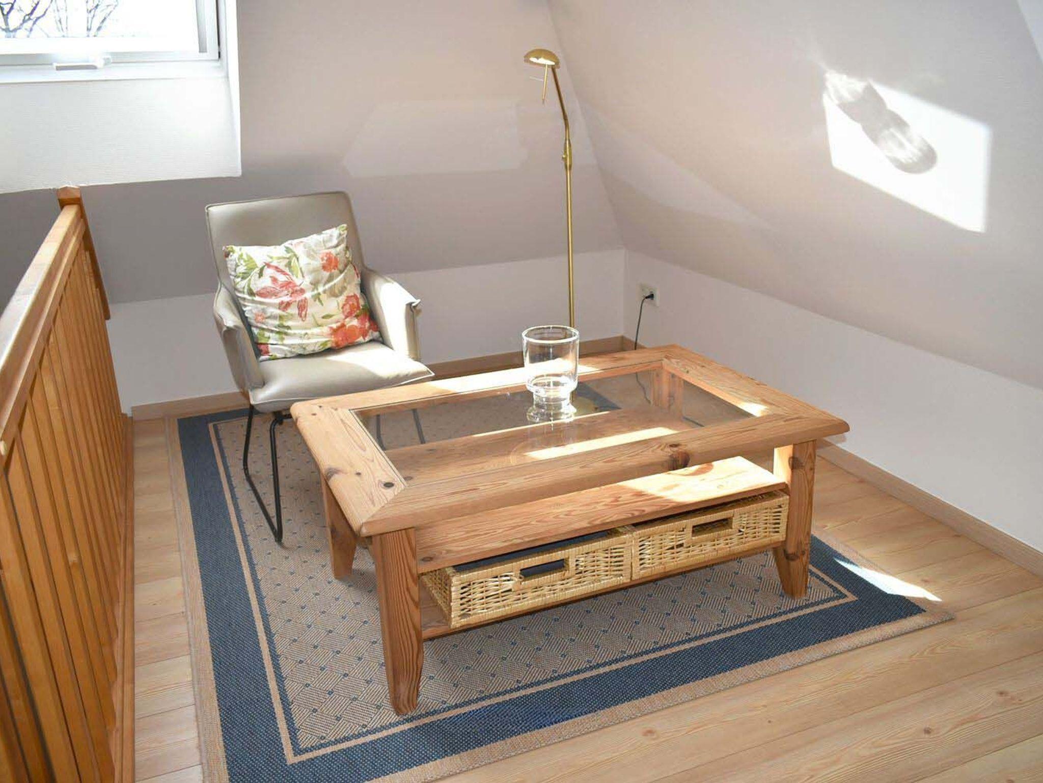 Wohnzimmer: 2 Beistelltische, 2 Sessel, 4 Plattenherd mit Ceranfeld und Backofen, 6 Stühle, Anrichte, Couchtisch, Dunstabzugshaube, Esstisch, Flachbildschirm, Geschirr, Kabel-TV, Kaffeemaschine, kleiner Meerblick durch die Bäume, Kochtöpfe, Küchenzeile, Kühlschrank mit Gefrierfach, Mikrowelle, Regal, Schlafcouch 2,00 x 1,60 m, Spiegel, Spülmaschine, Stehlampe, Stereoanlage mit CD-Player, Teewagen, Tischlampe, Toaster, Treppe nach oben, Wasserkocher