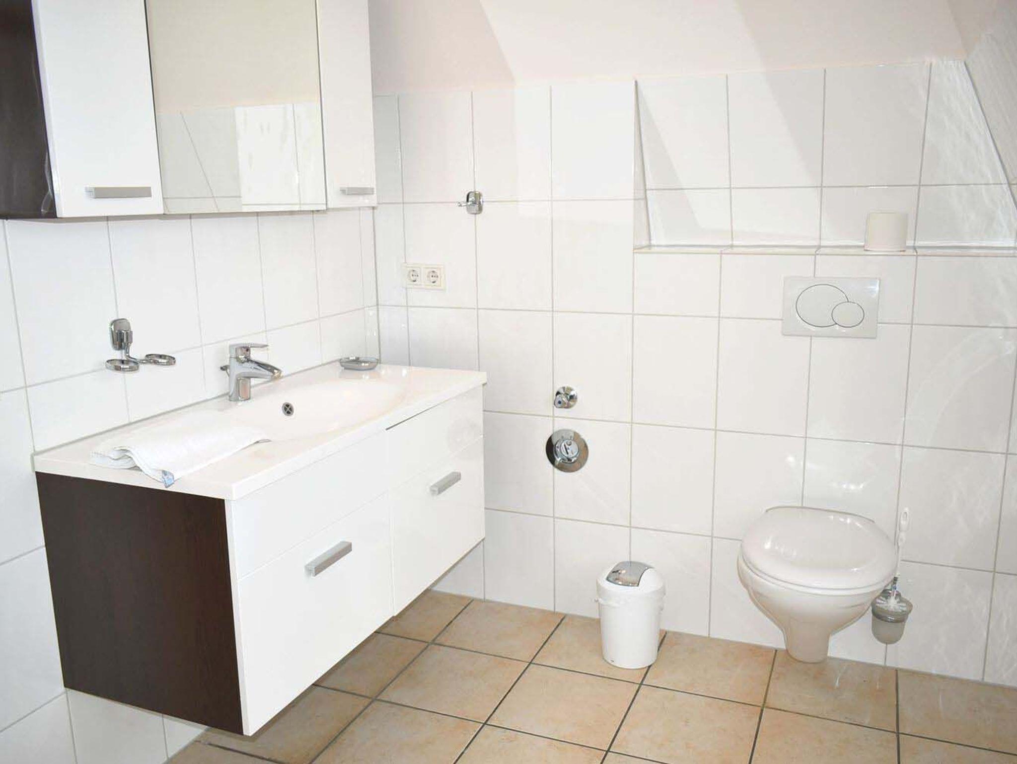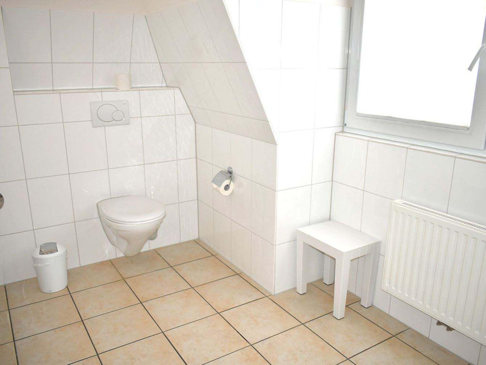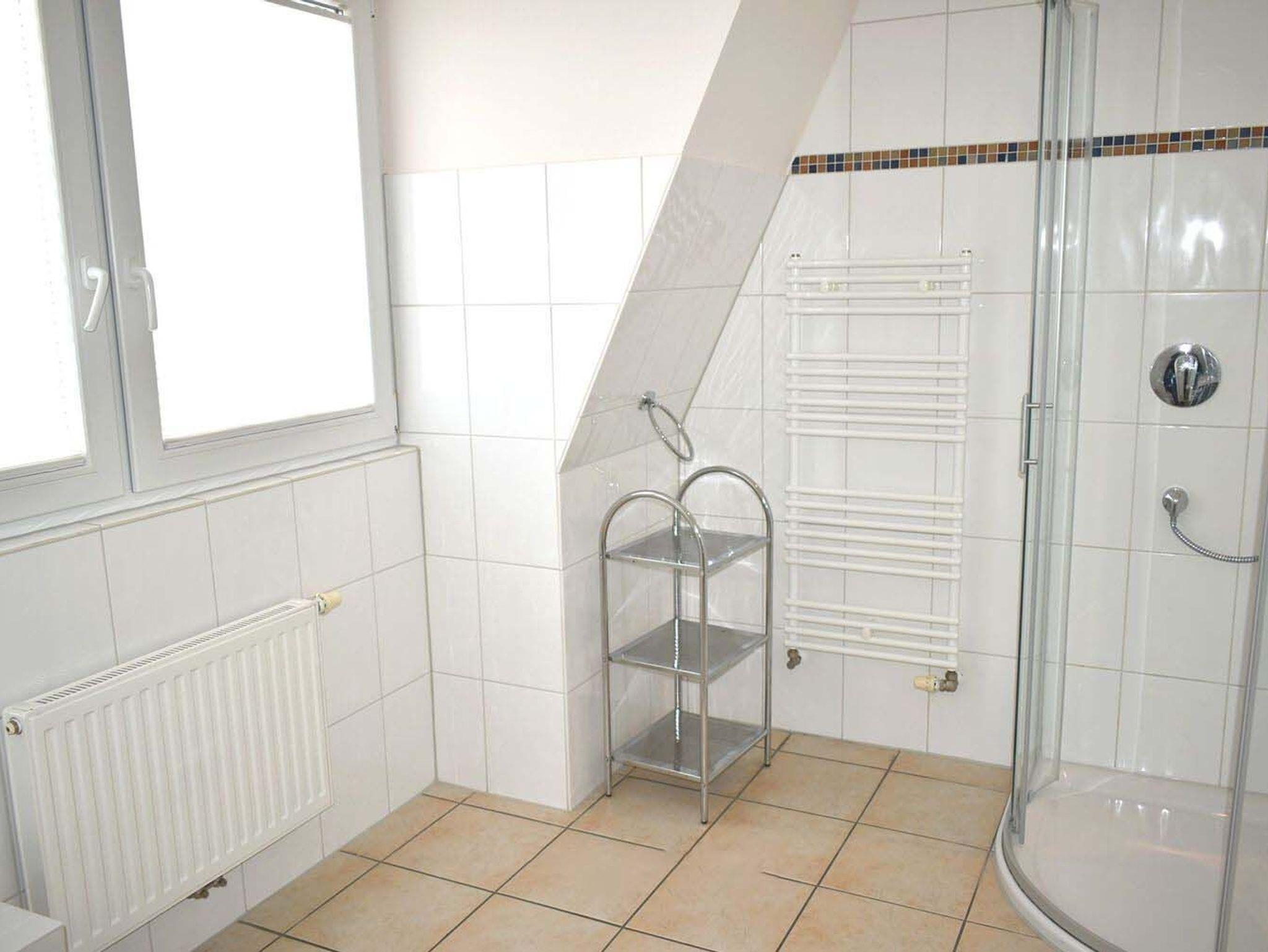 Bad 1: Dusche, Duschkabine, Fön, Hocker, Regal, Spiegelschrank, Waschtisch, WC