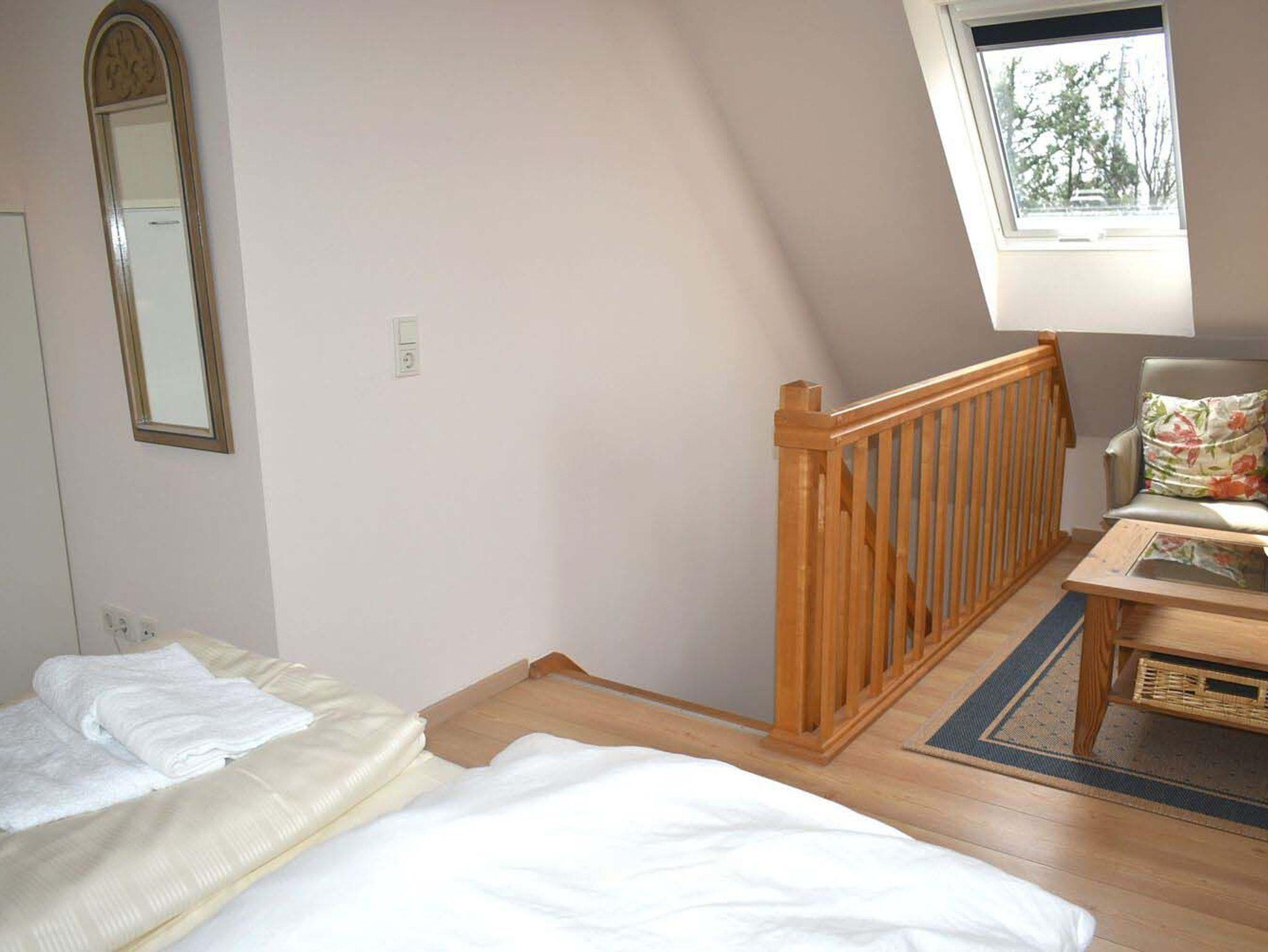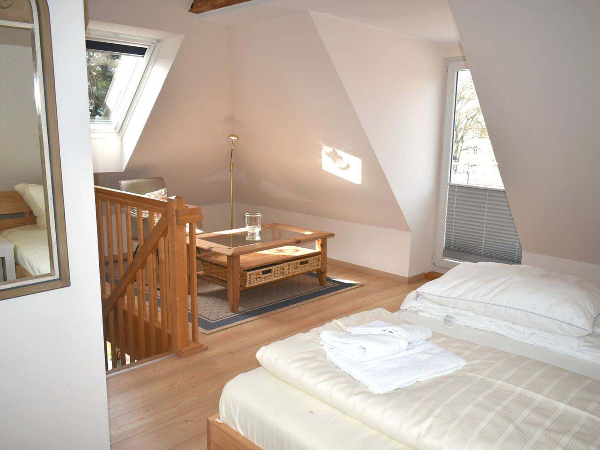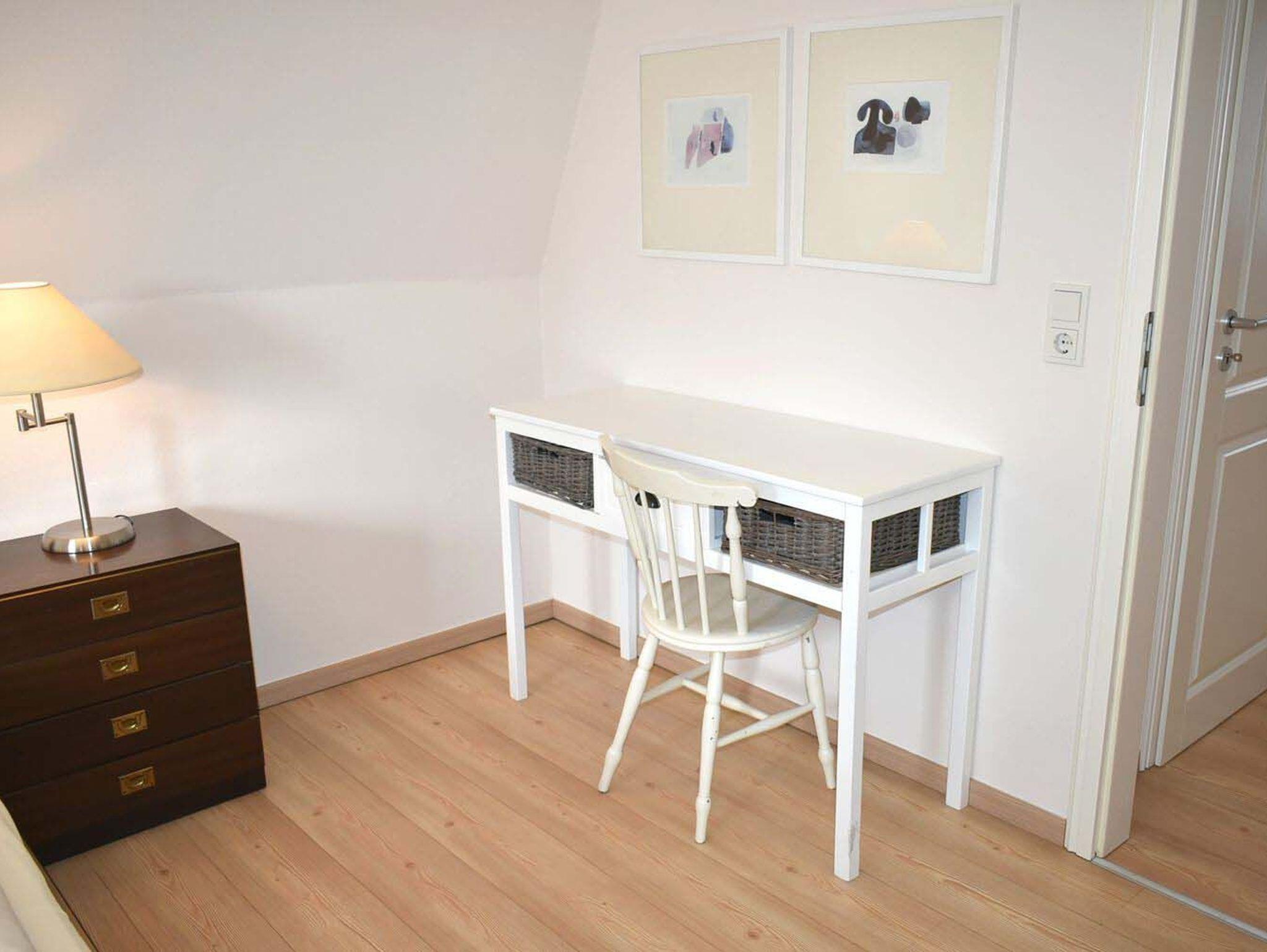 Schlafzimmer 2: 2 Schubladenschränke, 2 Sessel, Couchtisch, Doppelbett 2,00 x 1,80 m, Flachbildschirm, Hocker, Kabel-TV, Kleiderschrank, kleiner Meerblick durch die Bäume, Nachttisch, Spiegel, Stehlampe, Tisch, Tischlampe, Treppe nach unten