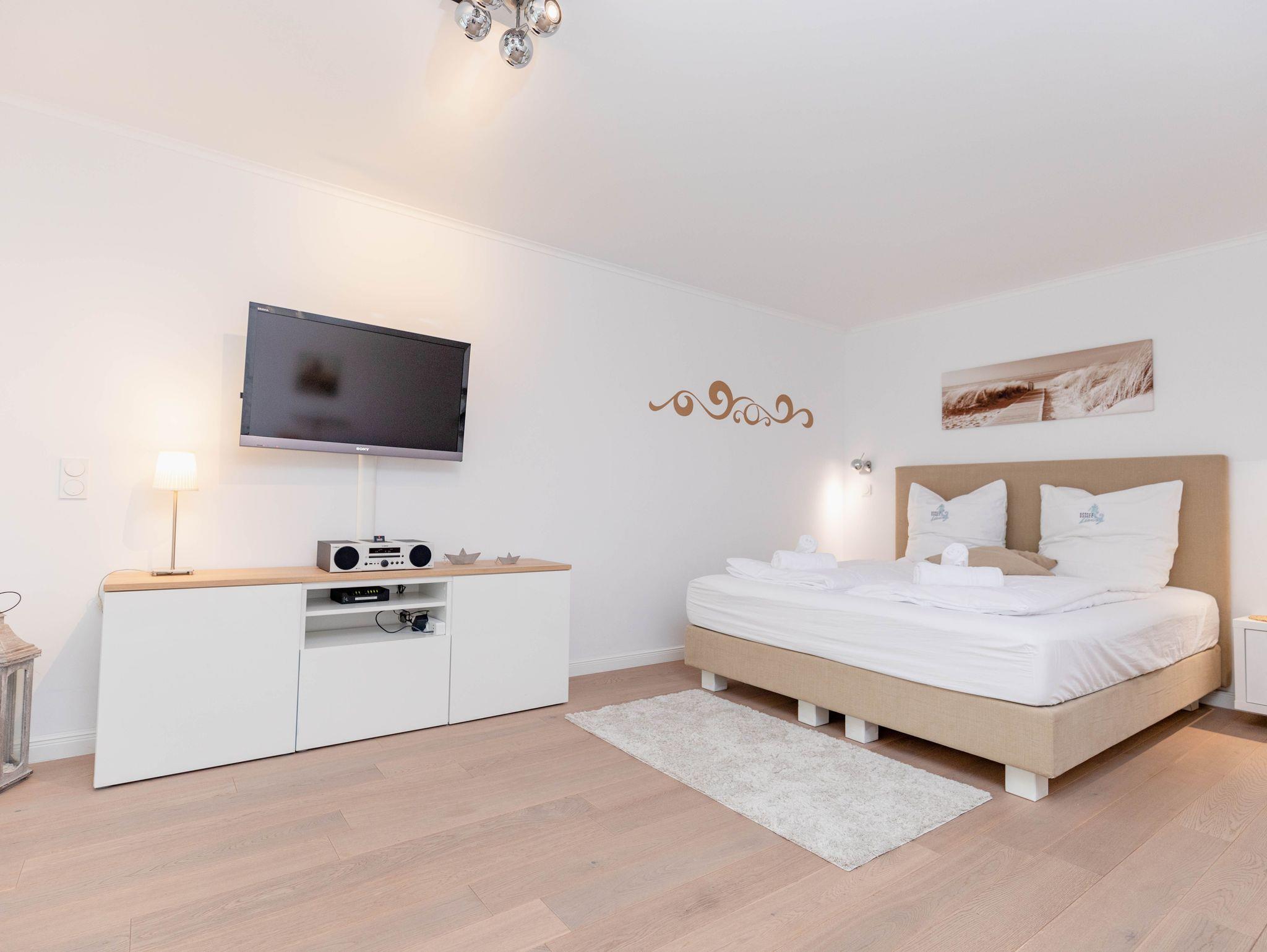 Bodentiefe Fensterelemente, Echtholzparkett und die hochwertige Einrichtung schaffen eine helle und freundliche Wohnatmosphäre. Die 42 qm wurden optimal genutzt und bieten ausreichend Platz für 2 Personen. Es steht ein geschmackvoller, großzügiger Wohn- Schlafbereich mit einem bequemen Sofa[nbsp][nbsp]und ein Essbereich für 2 Personen zur Verfügung. Das hochwertige Luxusbett aus der Bettenmanufaktur Sleep[&]Dream superior in Hotelqualität (180x200) ist besonders hervorzuheben und Garant für einen erholsamen Schlaf. Unterhaltung bieten der Sony TV 50 Zoll (127 cm) schwenkbar mit USB Anschluß, Blue-Ray Player, Hifi-Anlage mit Bluetooth und kostenloser Internetzugang über WLAN. Die moderne individuell eingerichtete Küchenzeile ist bestens ausgestattet und verfügt über Geschirrspülmaschine und Mikrowelle mit Backfunktion.[nbsp] Das moderne, geräumige Bad verfügt über eine Dusche, Waschtisch, WC, Handtuchwärmer und Fön. Tiefgaragenstellplatz (Einfahrtshöhe 1,75 m), Aufzug, Fahrradkeller (eine Platzgarantie für Ihre Fahrräder besteht nicht) sowie Waschmaschine und Trockner (Münzgeräte) sind vorhanden.