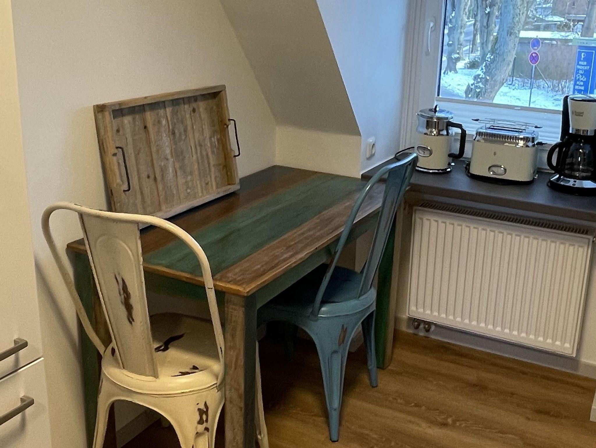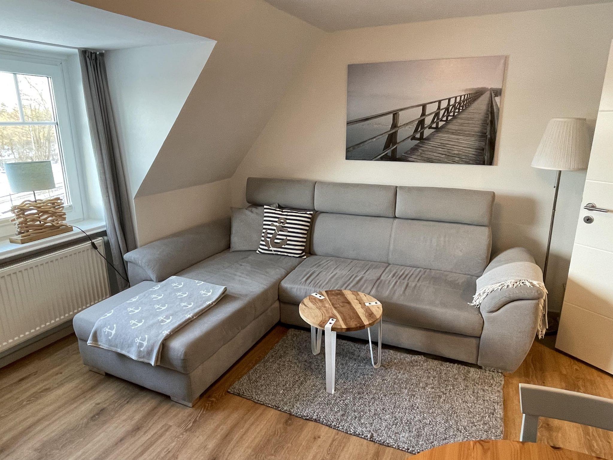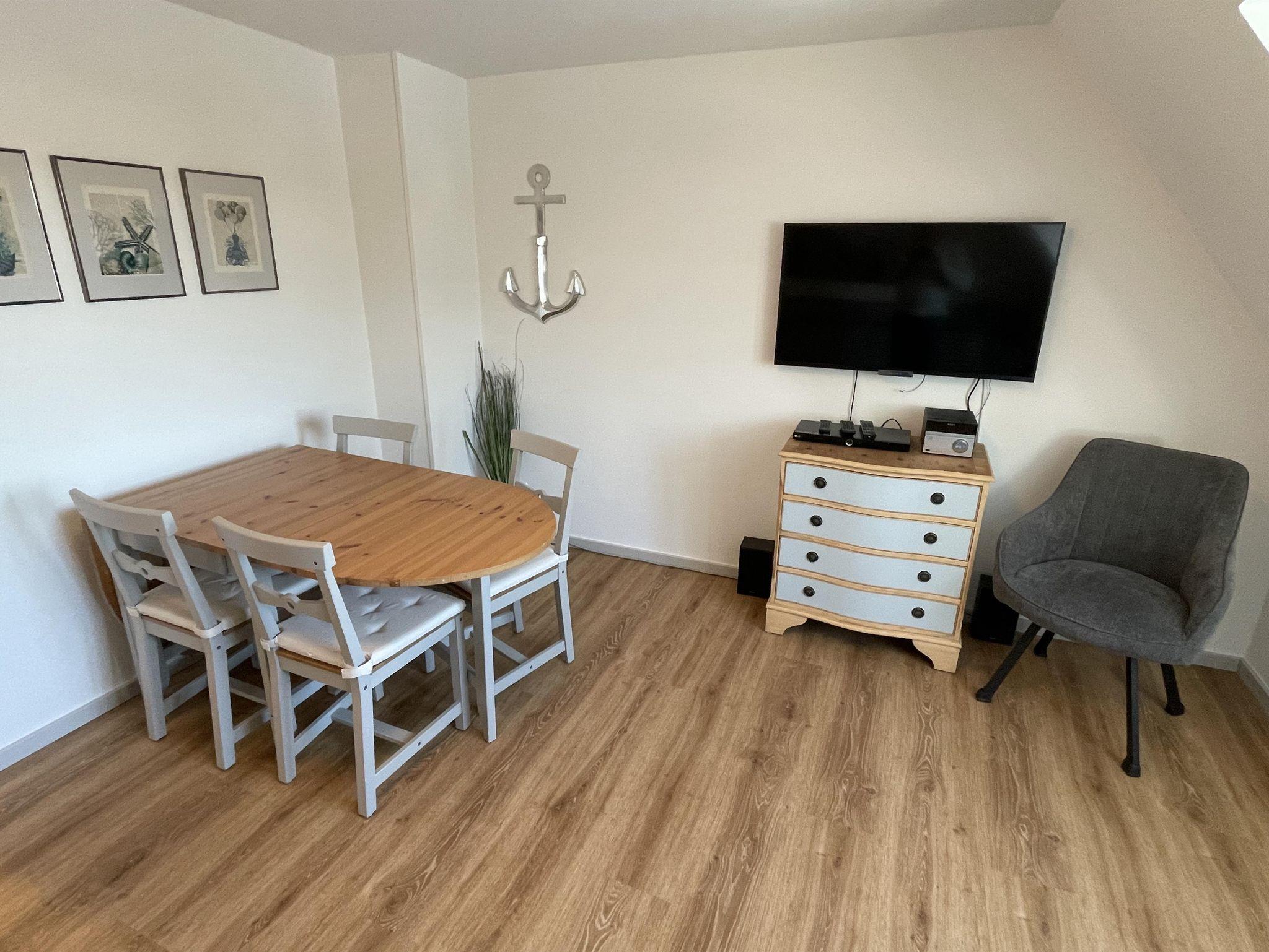 Das Wohnzimmer verfügt über ein Ecksofa und einen ausziehbaren Esstisch mit 4 Stühlen. Im Apartment finden Sie Flat-TV, BlueRay-Player und HiFi-Anlage. Das Ecksofa kann bei Bedarf zu einer Schlafgelegenheit für zwei Personen umgewandelt werden. WLAN steht kostenfrei zur Verfügung.