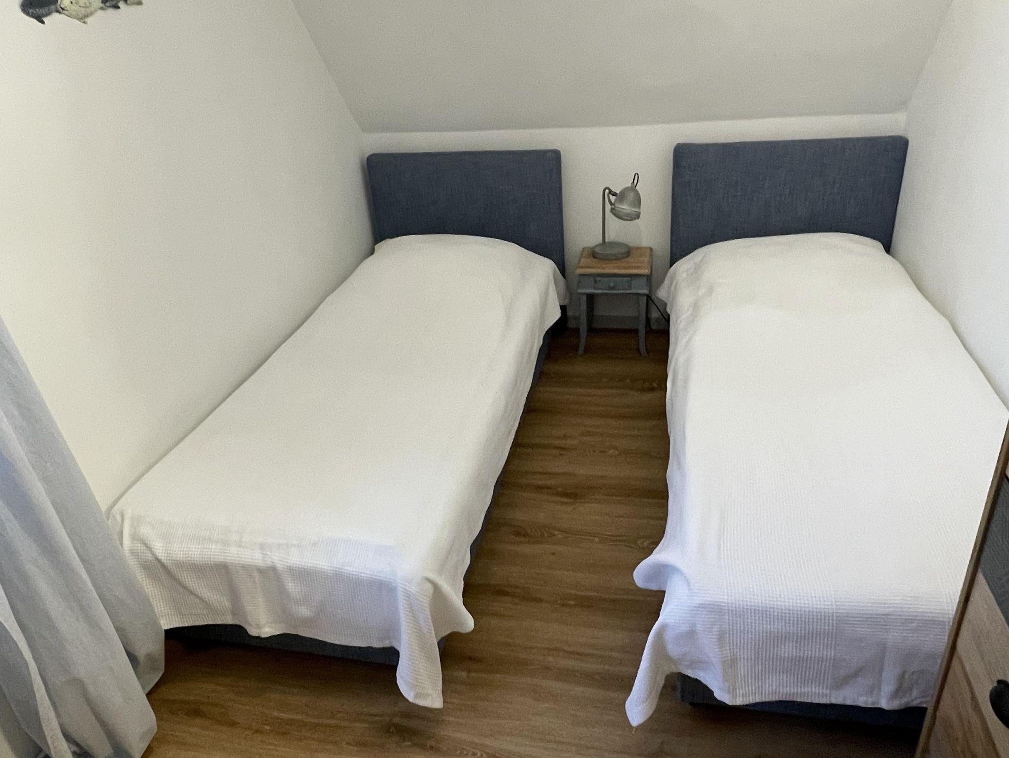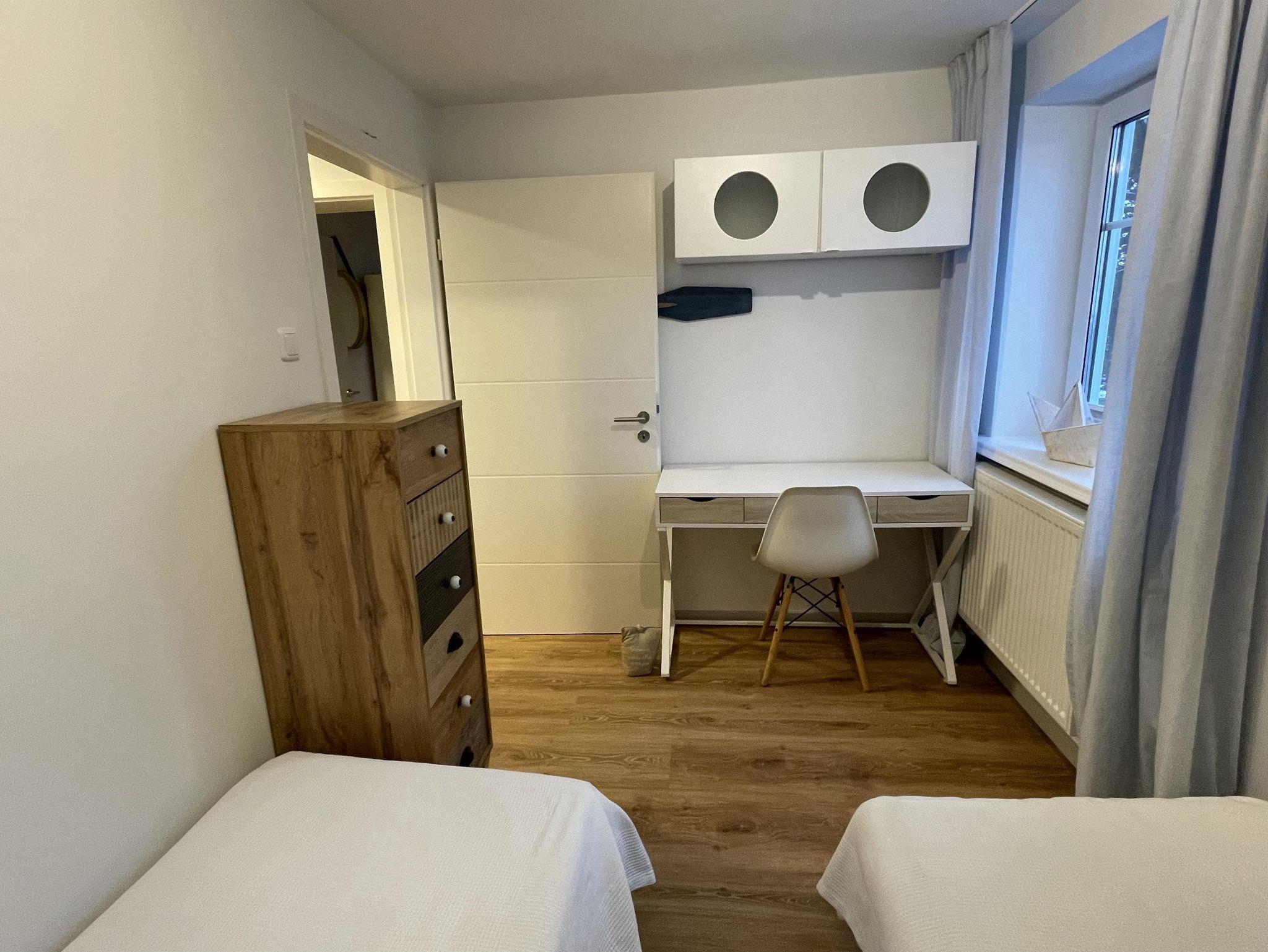 Das zweite Schlafzimmer ist mit 2 Einzelbetten ausgestattet, die bei Bedarf in ein kleines Doppelbett verwandelt werden können, sowie einen Schreibtisch. Für Ihre Kinder halten wir Spiele, Hochstuhl oder Babybett vor.