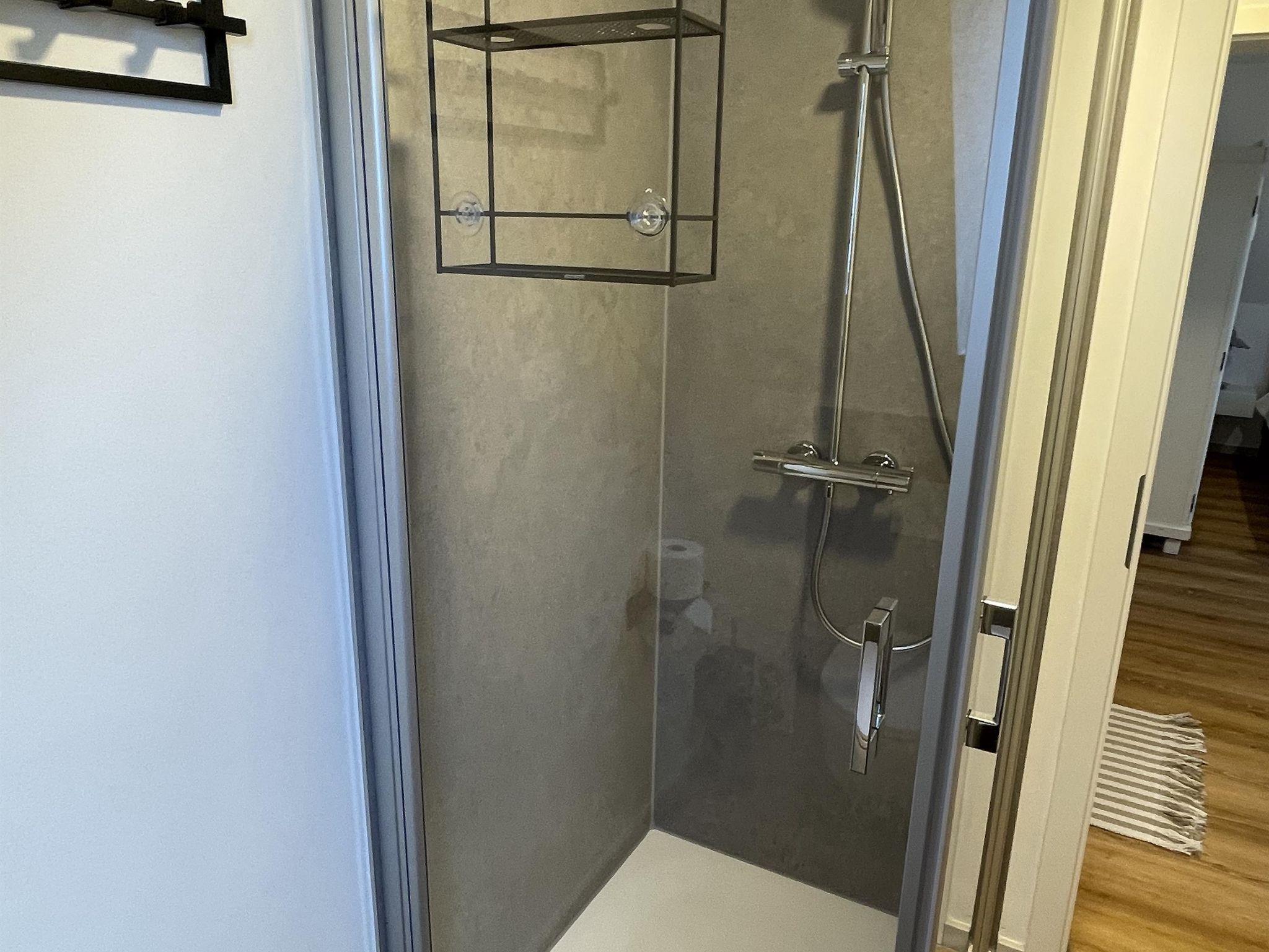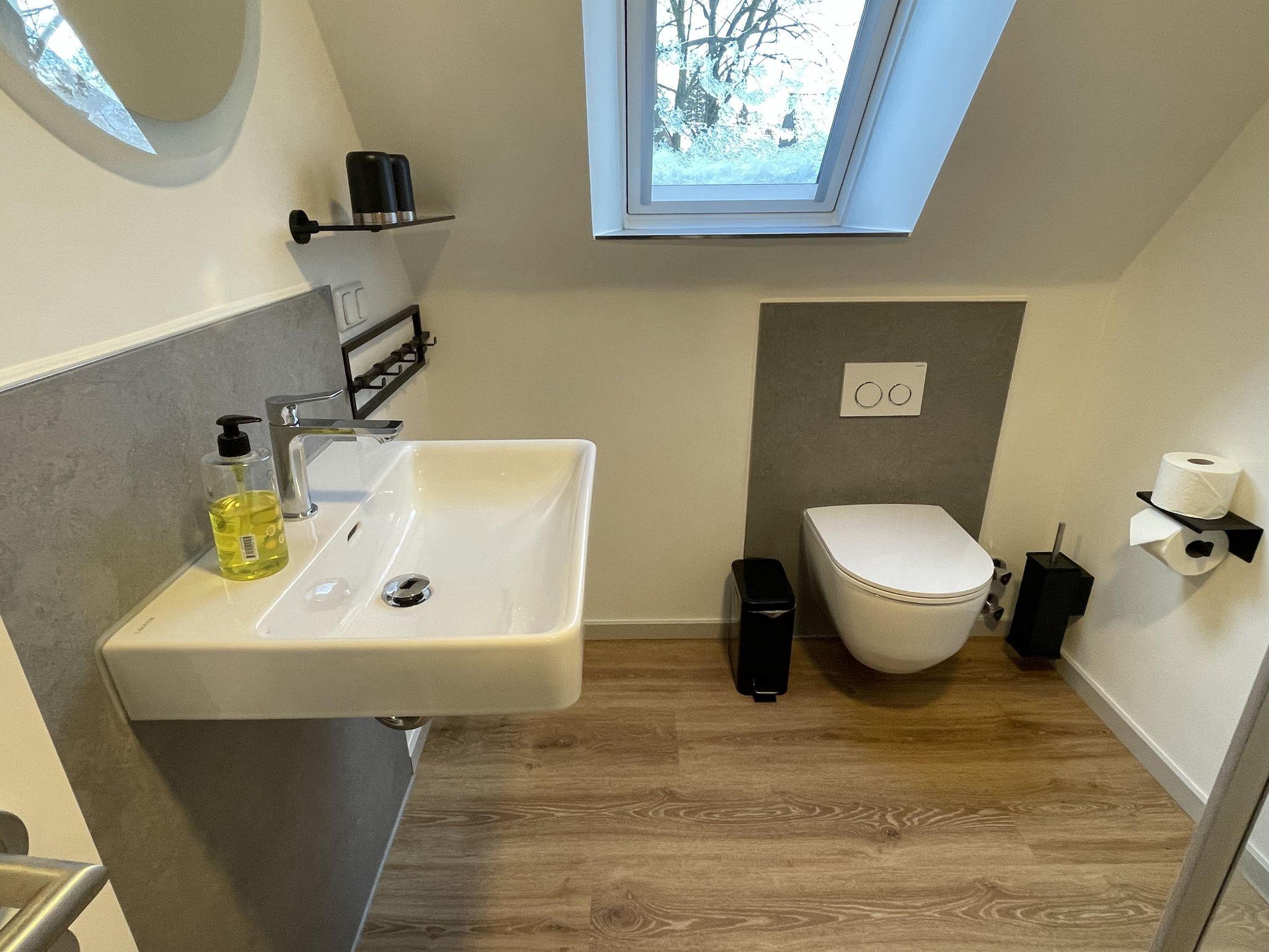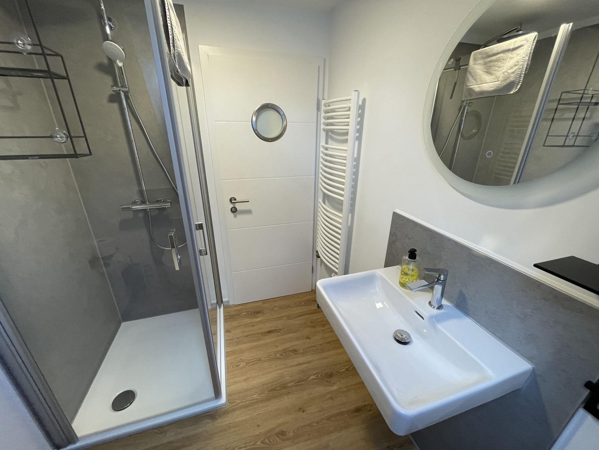 Das Duschbad ist mit Dusche, Waschtisch, Handtuchheizkörper, WC und Fön ausgestattet.