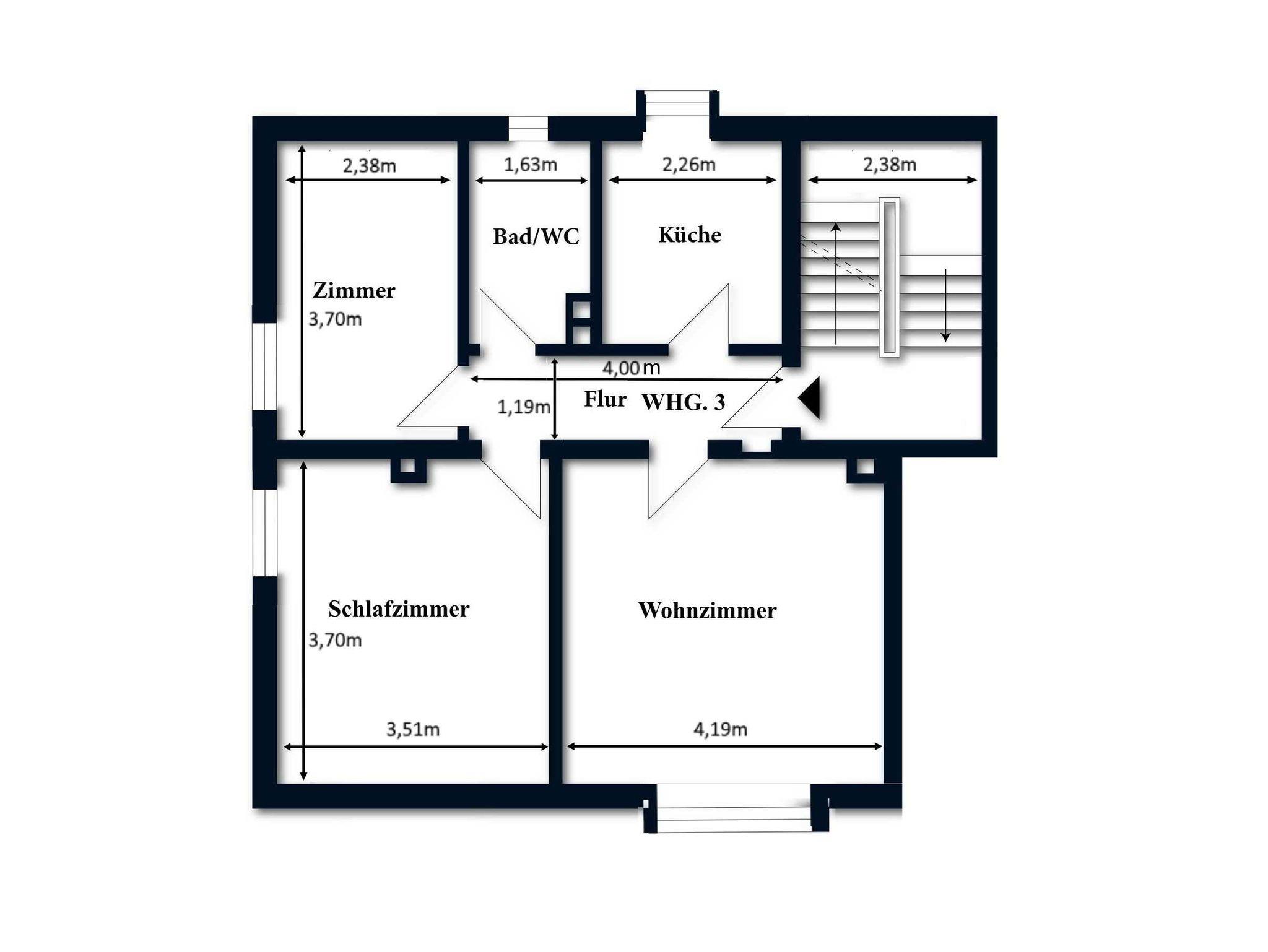 Die Wohnung verfügt über 1 Wohnzimmer, 2 Schlafzimmer sowie Küche und Duschbad.