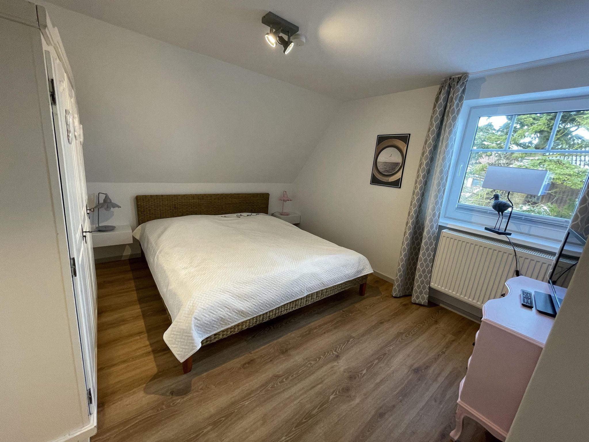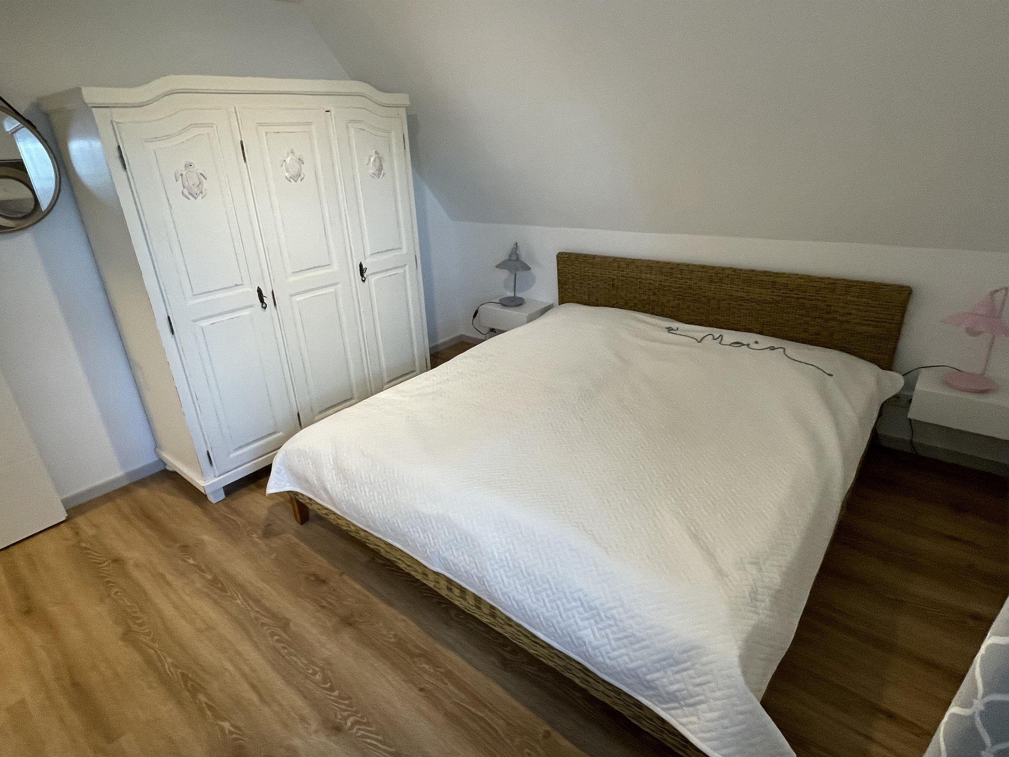 Im Masterschlafzimmer befinden sich ein Kleiderschrank und eine Kommode. Das Bett (180x200 cm) ist mit Markenmatratzen und Lattenrosten versehen.