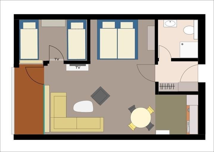 Das Appartement verfügt über ein Wohnzimmer mit angrenzender Einbauküche. Diese ist ausgestattet mit Geschirrspüler, Backofen, kleinem Ceranfeld, Kühlschrank und allem Geschirr und Geräten, die man in der Küche benötigt. Außerdem findet sich dort ein kleiner Essplatz mit 4 Sitzplätzen. Die separate Schlafnische im Wohnzimmer verfügt über ein Doppelbett mit einer Größe von 180 x 200 cm und einen Kleiderschrank. Wäschepaket gegen Aufpreis zubuchbar. Vom Wohnzimmer geht ein kleines weiteres Schlafzimmer ab, das mit zwei Einzelbetten ausgestattet ist. Zudem findet sich dort ein TV mit DVD-Player und einer Auswahl an Kinder DVDs. Vom Wohnzimmer aus geht es auch auf den etwa 5m² großen Sonnenbalkon. Vom kleinen Flur, in dem dem sich die Garderobe samt großem Einbauschrank befindet, gelangt man in das Badezimmer. Dieses verfügt neben Waschbecken, WC und Dusche über einen Fön, Kosmetikspiegel und Handtuchheizkörper. Ein Flügelwäschetrockner ist in der Wohnung vorhanden, des weiteren kann ein Gemeinschaftstrockner und -Waschmaschine im Keller benutzt werden.