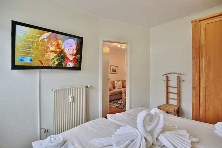 Das Schlafzimmer ist ein separates Zimmer und mit einem Doppelbett in der Größe 180x200 Meter, einem Kleiderschrank und einem Flachbild TV ausgestattet. Platz für ein Babybett ist hier leider nicht. Der Wohnbereich und ein Nische auf dem Flur bieten jedoch genügend Platz, wo Sie gerne ein Babybett aufstellen können.