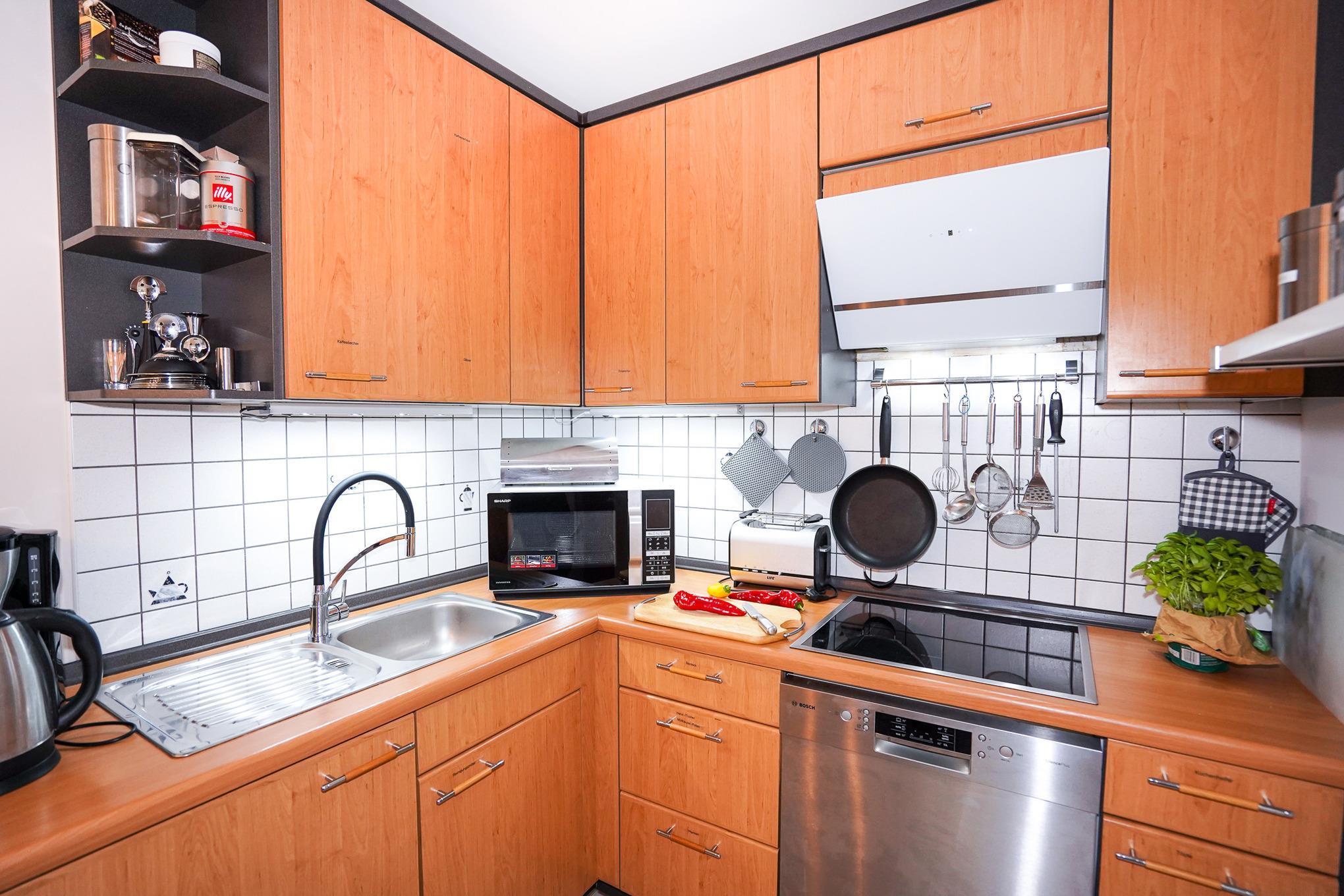Techn. Highlights: Stereoanlage (Blu-ray- und Streaming-Player mit Bluetooth und Internetradio), 3xAlexa Echo Dot, 50"- und 32"-Flatscreen, Amazon Fire TV, Induktionskochplatte, Multifunktionsofen (Mikrowelle, Heißluft, Konvektomat), Kaffeevollautomat, Geschirrspüler, etc.