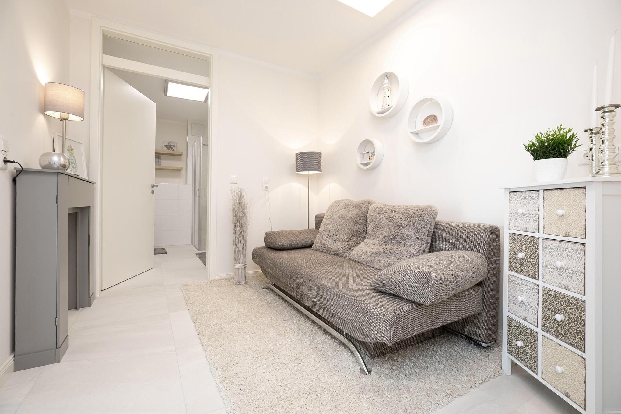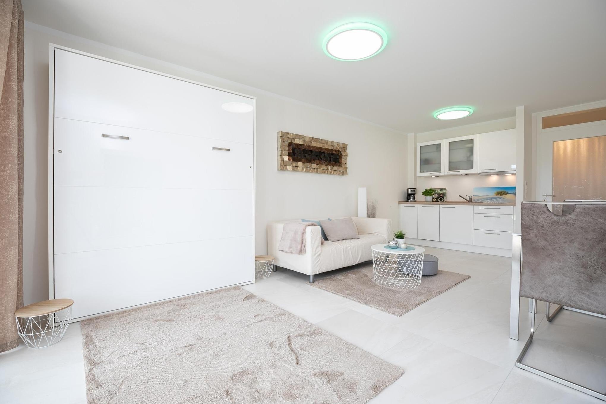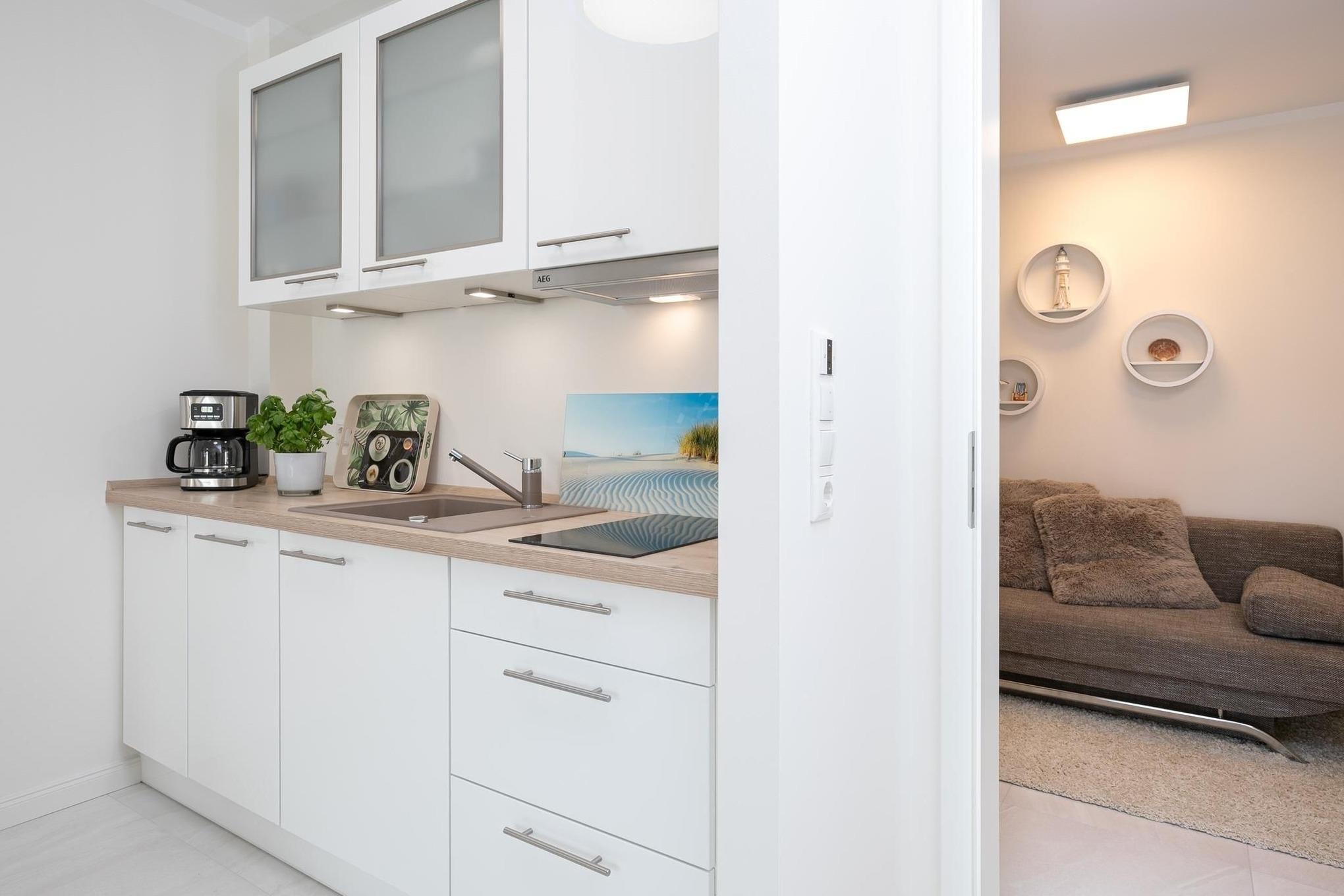 Der offen gestaltete Wohnraum geht harmonisch ineinander über. Hier erwartet Sie ein geschmackvoll eingerichteter Wohnbereich mit komfortabler Couchgarnitur und Flatscreen-TV. Angrenzend befindet sich ein kleiner Essbereich mit offener und voll ausgestatteter Küche, die modern und unter anderem mit 2-Platten-Induktionskochfeld, praktischer Spülmaschine und Kühlschrank ausgestattet ist. Für einwandfreien Schlafkomfort sorgt das Schrankbett (160x200 cm), welches sich mit wenigen Handgriffen zum platzsparenden Schrank oder komfortablem Bett umbauen lässt. Die 3. Schlafmöglichkeit ist mit einem Schlafsofa (150x190 cm) raffiniert im Flur untergebraucht, so bietet dieses 1 Zimmer-Appartement Privatsphäre für jeden. Verdunkelnde Außenrollläden gehören hier zur Grundausstattung. Die angrenzende teilüberdachte Terrasse mit Strandkorb lädt Sie ein, den Tag bei einem kühlen Getränk in Ruhe Revue passieren zu lassen. Gern dürfen Sie den Garten mitbenutzen. Abgerundet wird dieses schöne Feriendomizil mit einem Badezimmer mit bodentiefer Dusche, Handtuchheizung und Fön. Für warme Füße sorgt die komfortable Fußbodenheizung. Freuen Sie sich auf einen entspannten Urlaub an der Ostsee.