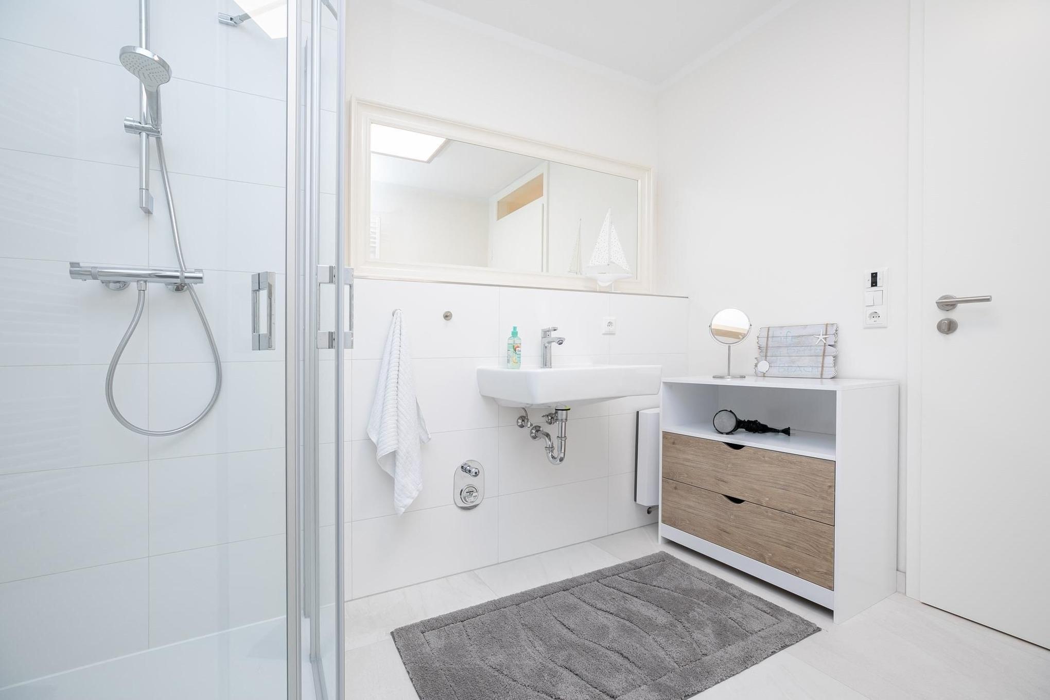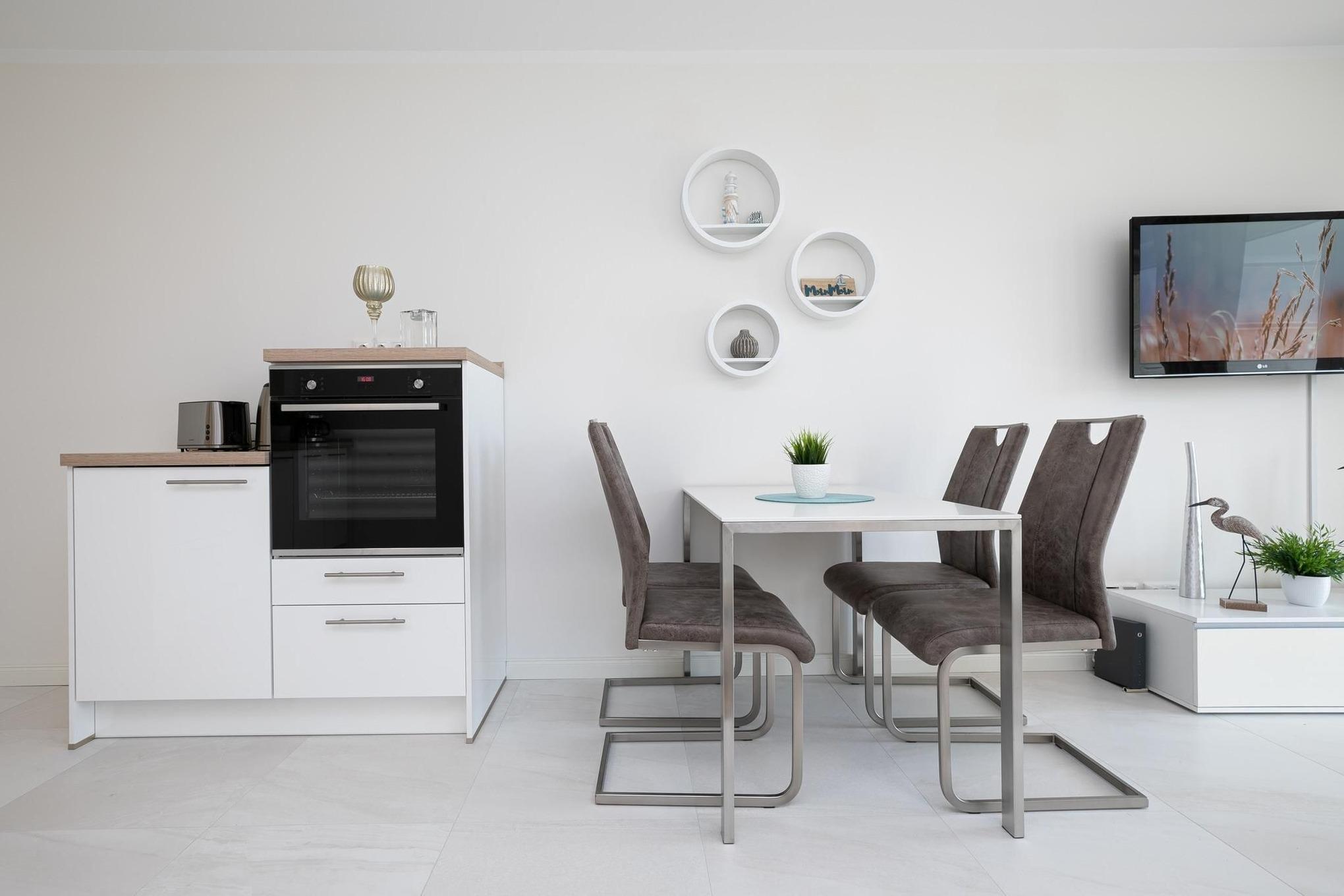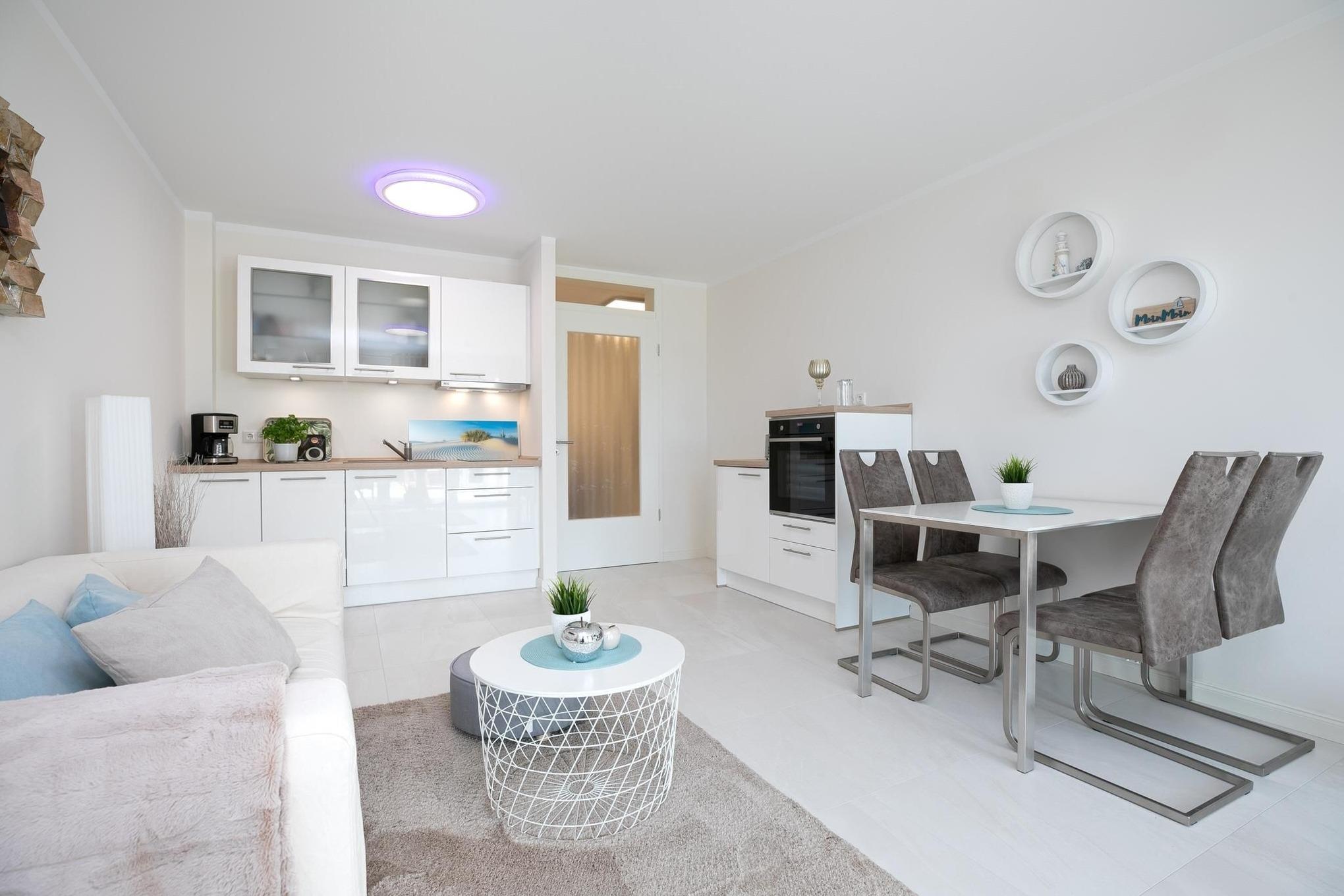 Der offen gestaltete Wohnraum geht harmonisch ineinander über. Hier erwartet Sie ein geschmackvoll eingerichteter Wohnbereich mit komfortabler Couchgarnitur und Flatscreen-TV. Angrenzend befindet sich ein kleiner Essbereich mit offener und voll ausgestatteter Küche, die modern und unter anderem mit 2-Platten-Induktionskochfeld, praktischer Spülmaschine und Kühlschrank ausgestattet ist. Für einwandfreien Schlafkomfort sorgt das Schrankbett (160x200 cm), welches sich mit wenigen Handgriffen zum platzsparenden Schrank oder komfortablem Bett umbauen lässt. Die 3. Schlafmöglichkeit ist mit einem Schlafsofa (150x190 cm) raffiniert im Flur untergebraucht, so bietet dieses 1 Zimmer-Appartement Privatsphäre für jeden. Verdunkelnde Außenrollläden gehören hier zur Grundausstattung. Die angrenzende teilüberdachte Terrasse mit Strandkorb lädt Sie ein, den Tag bei einem kühlen Getränk in Ruhe Revue passieren zu lassen. Gern dürfen Sie den Garten mitbenutzen. Abgerundet wird dieses schöne Feriendomizil mit einem Badezimmer mit bodentiefer Dusche, Handtuchheizung und Fön. Für warme Füße sorgt die komfortable Fußbodenheizung. Freuen Sie sich auf einen entspannten Urlaub an der Ostsee.
