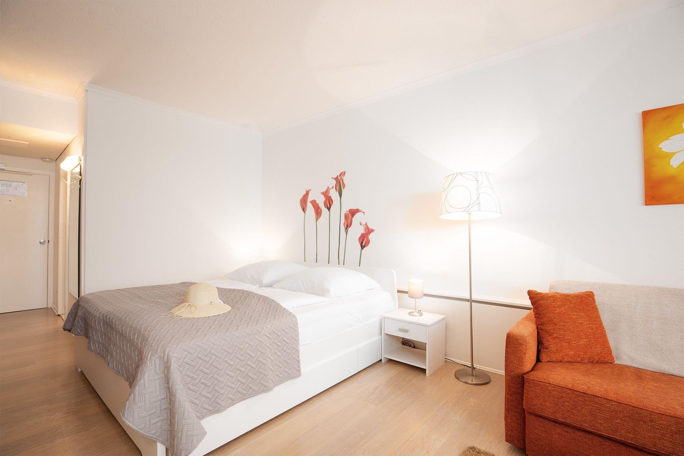 Wohnzimmer: Doppelbett mit offenem Fußende (180x200cm), TV, Verdunkelung über Vorhänge