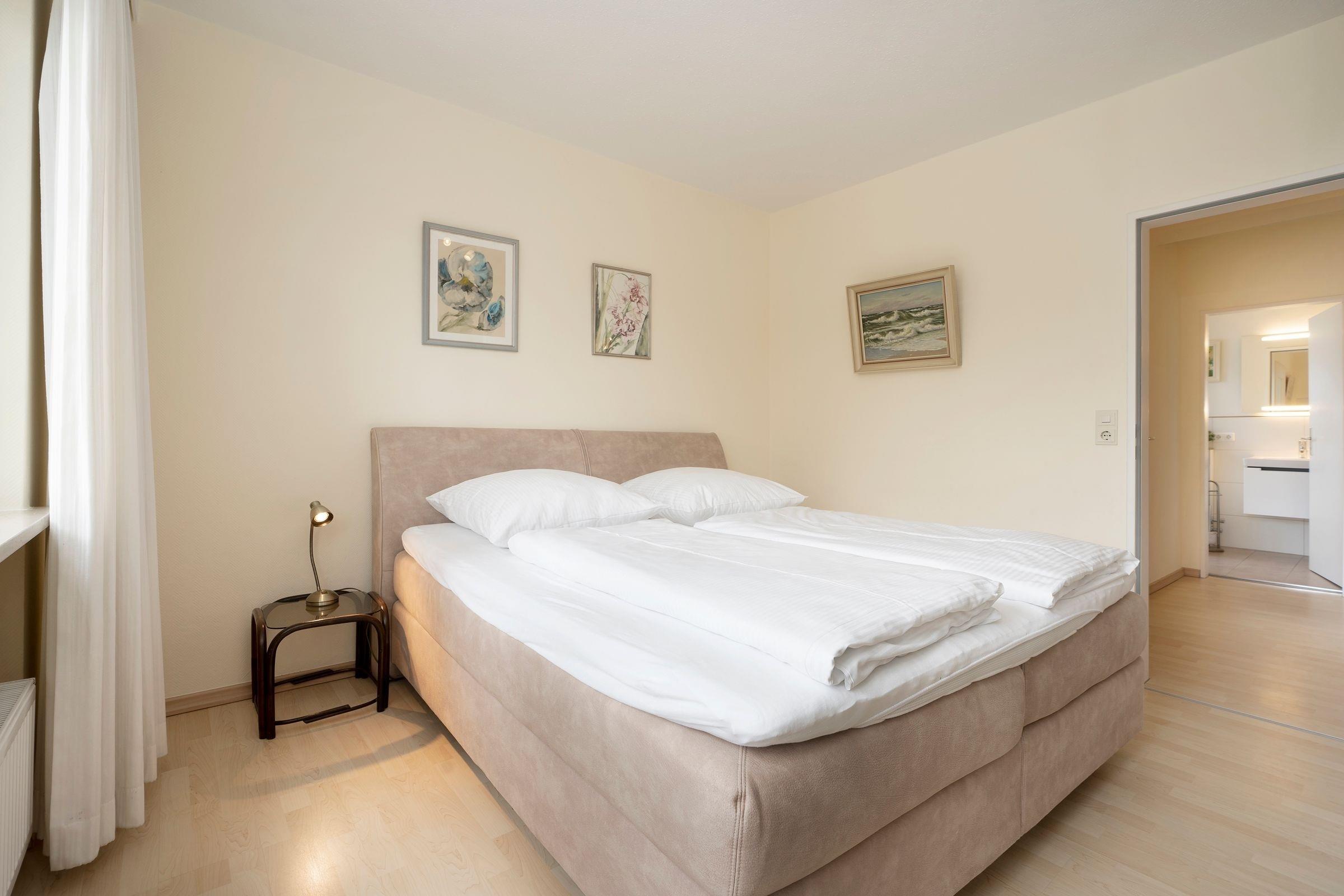 Schlafzimmer: Boxspringbett (180x200 cm), Kleiderschrank, Platz für Kinderreisebett vorhanden, Sichtschutz (Gardinen)