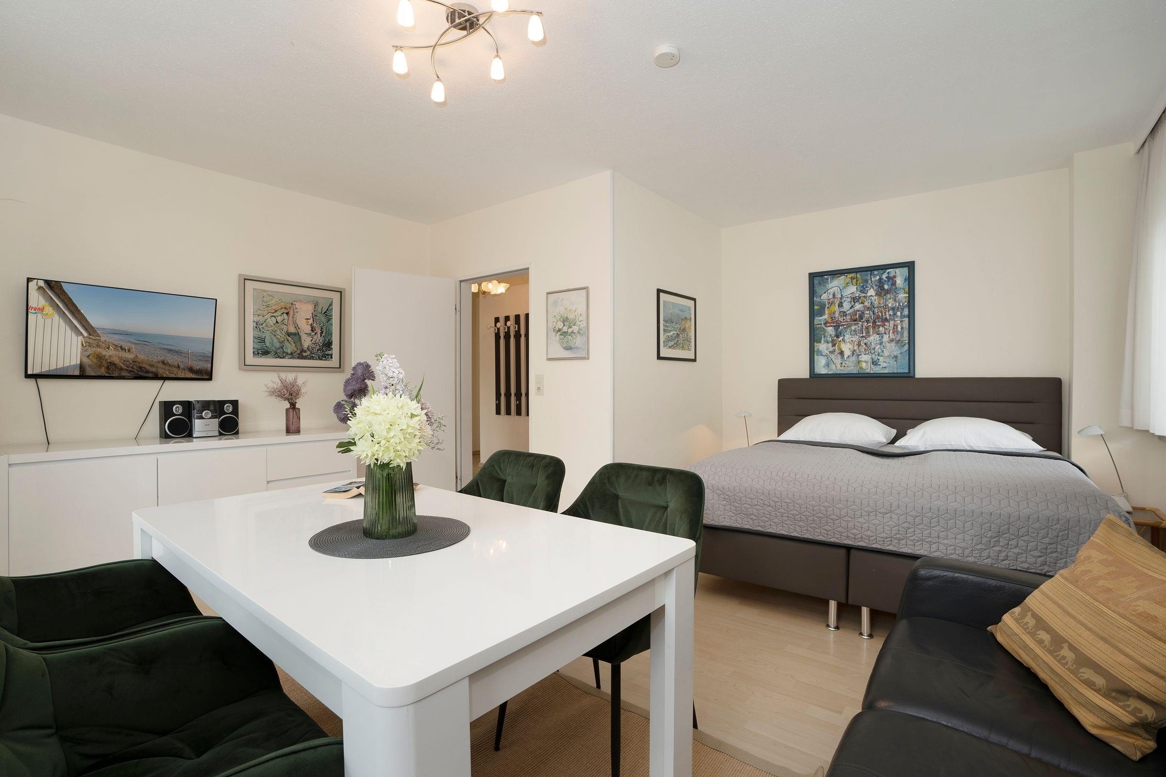 Wohnzimmer: Boxspringbett (180x200 cm), Sichtschutz (Gardinen), TV