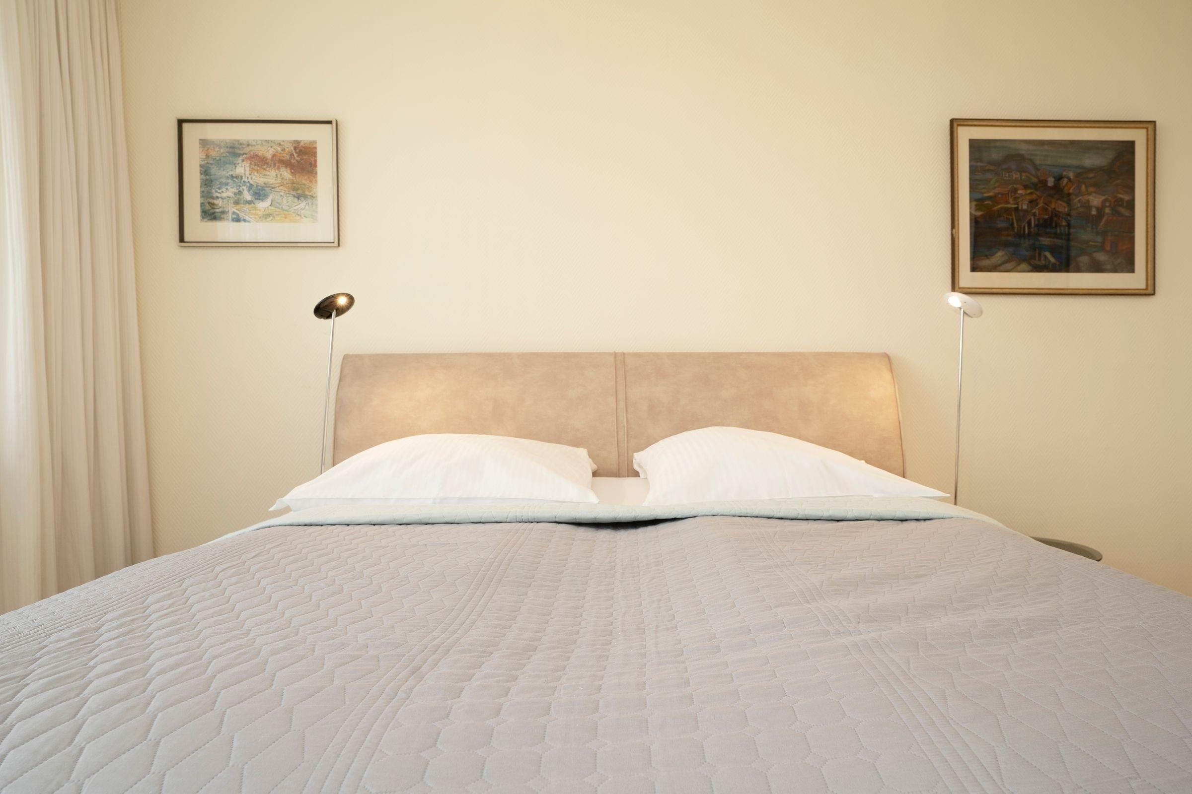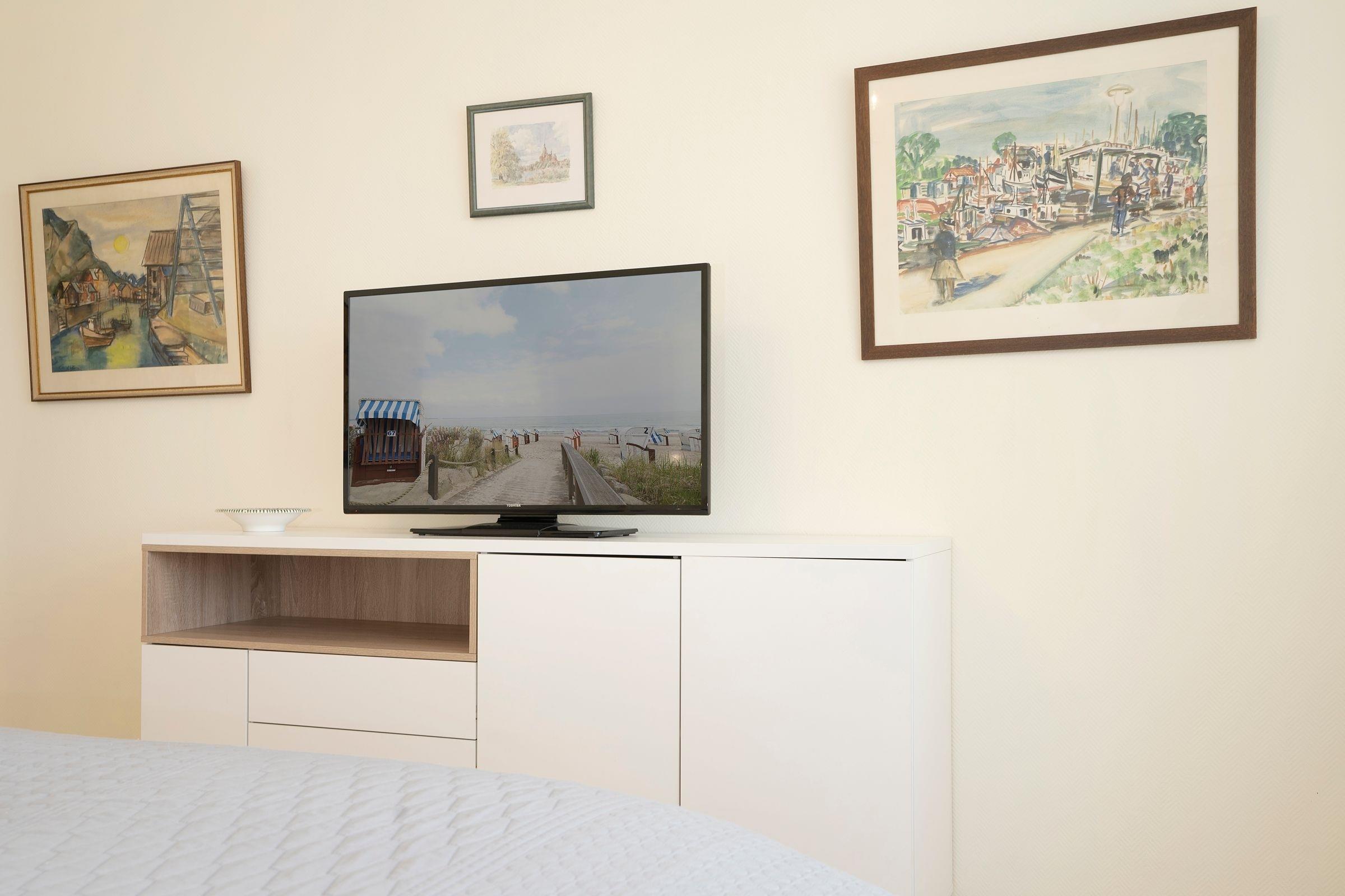 Schlafzimmer: 1 Boxspringbett (180x200 cm), Kleiderschrank im Flur, Platz für Kinderreisebett vorhanden, Sichtschutz (Gardinen), Smart-TV
