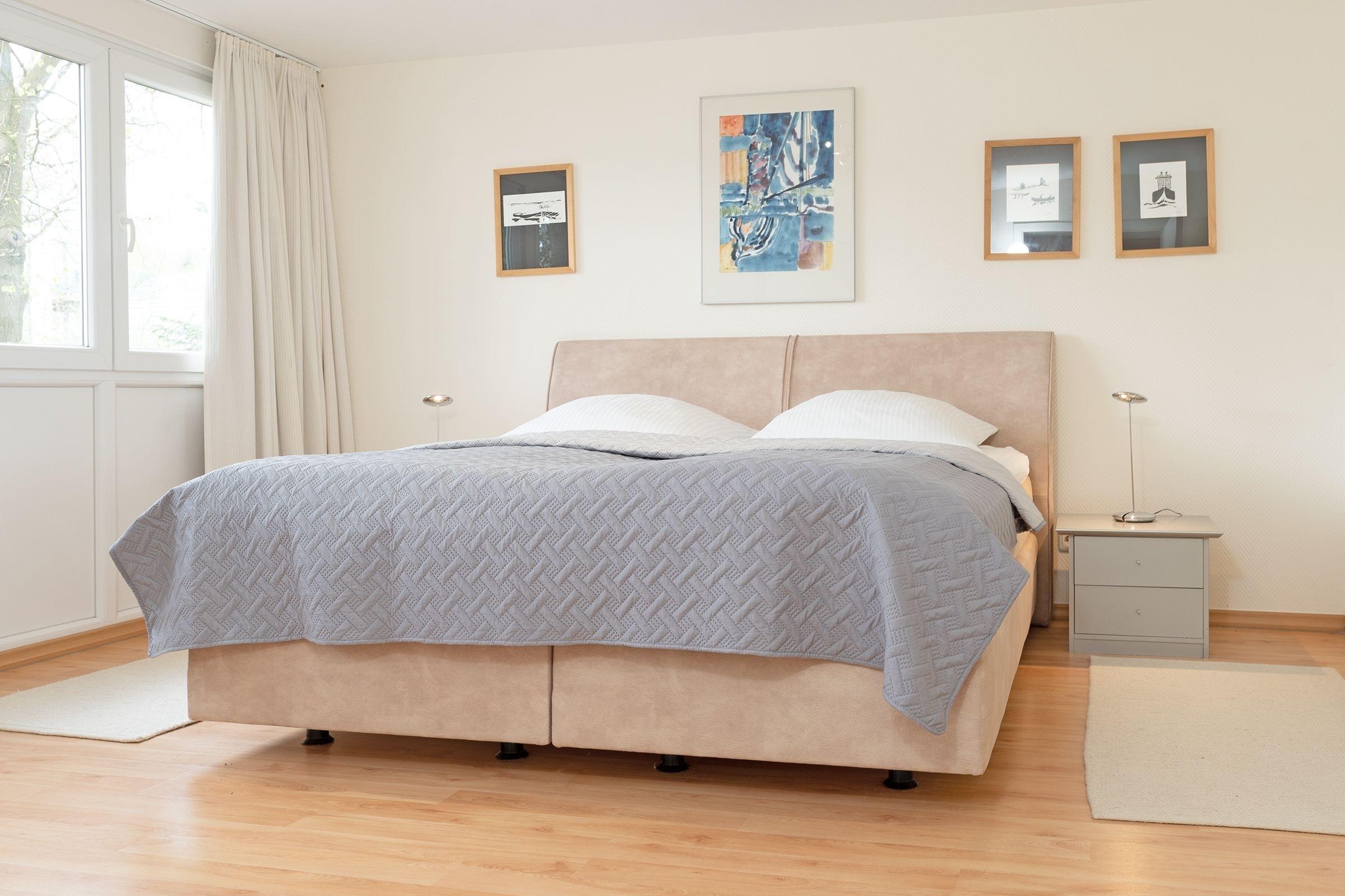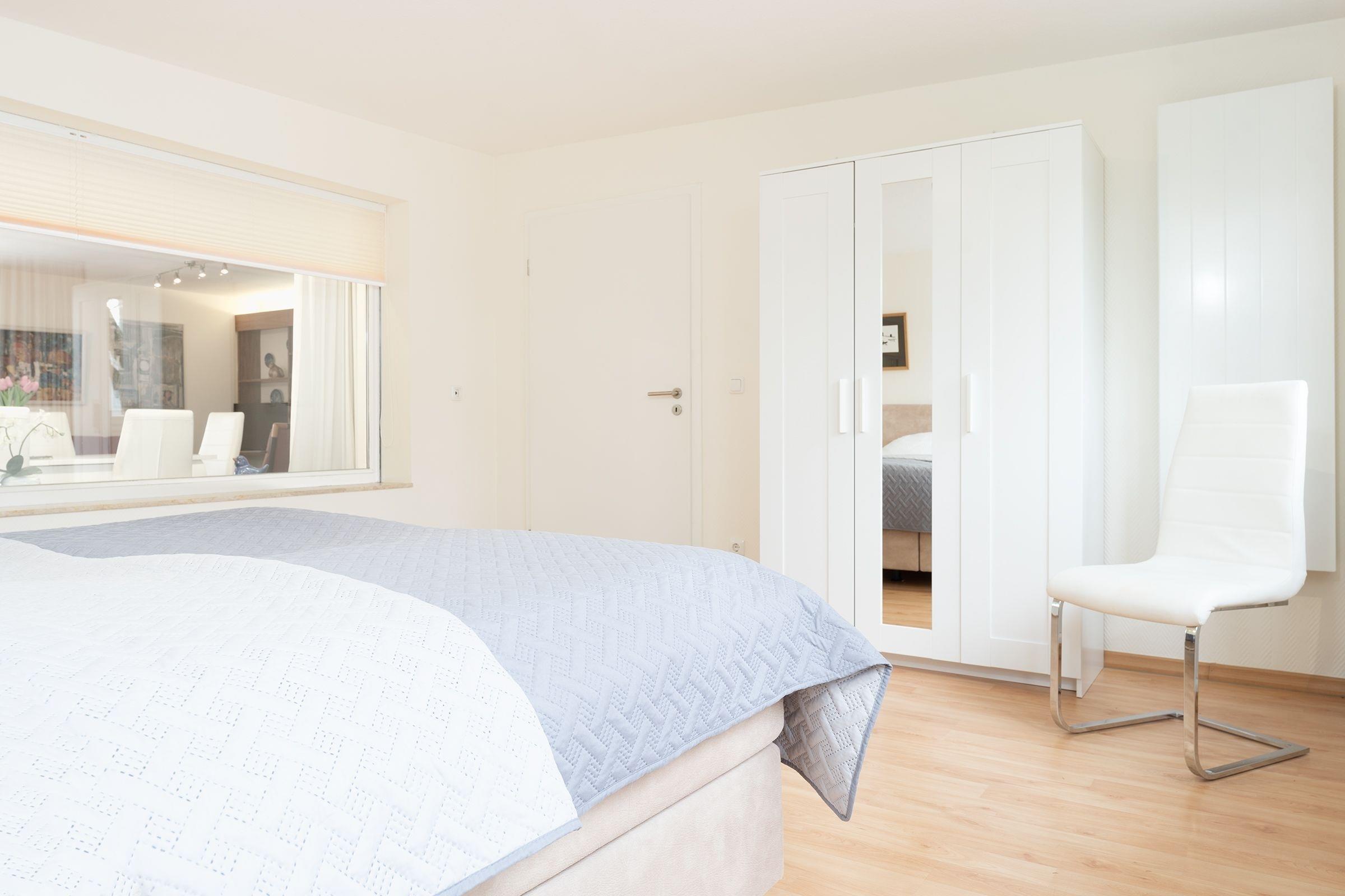 Schlafzimmer 1: 1 Boxspringbett (180x200 cm), Sichtschutz (Gardine), Kleiderschrank, Platz für Kinderreisebett vorhanden, Durchgangszimmer