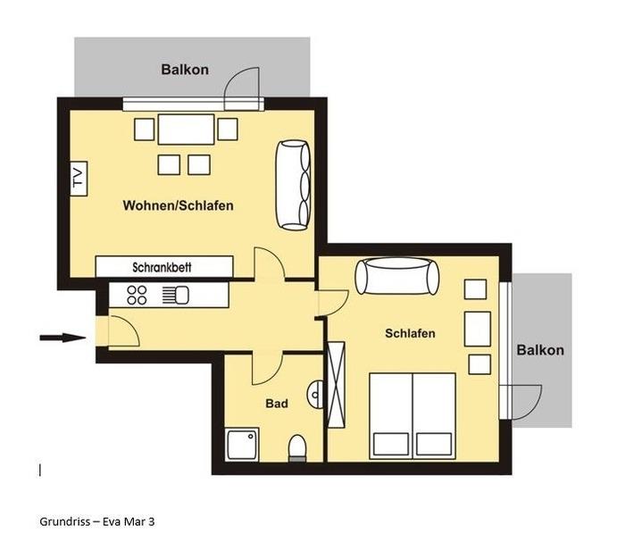 Träumen Sie davon, nur rund 20 Meter vom Ostseestrand entfernt Ihren Urlaub zu verbringen? Dann sind Sie in dieser schicken Ferienwohnung in der Wohnanlage Haus Eva Mar am Meer genau richtig. Hier können Sie jederzeit die Ostsee genießen – aber auch die Ferienwohnung selbst hat einiges zu bieten: Im großzügigen Flur befindet sich links die offene, gut ausgestattete Küchenzeile mit Geschirrspülmaschine. Hier lassen sich sämtliche Urlaubsspeisen mühelos zubereiten. Hinter der Küche links betreten Sie das Wohnzimmer mit gemütlicher Sitz-Ecke, Ess-Ecke und TV-Gerät. Hier haben Sie auch Zugang auf den großen, möblierten, überdachten Südwest-Balkon. Auch wenn das Wetter mal nicht so mitspielt, sitzen Sie hier geschützt und gemütlich. Im Wohnzimmer steht zudem ein Boxspringbett (180x200 cm) für eine wunderbare Nachtruhe. Träumen Sie hier von Ihren Erlebnissen an der schönen Ostseeküste. Erholsamen Schlaf verspricht auch das Boxspringbett (180x200 cm) im separaten Schlafzimmer. Das Besondere: Auch hier befindet sich ein möblierter, überdachter Balkon, in Nordwest-Richtung. Wie wäre es hier abends mit einem Glas Wein? In das großzügig geschnittene Duschbad fällt ausreichend Tageslicht durch das Oberlicht (nicht zu öffnen).