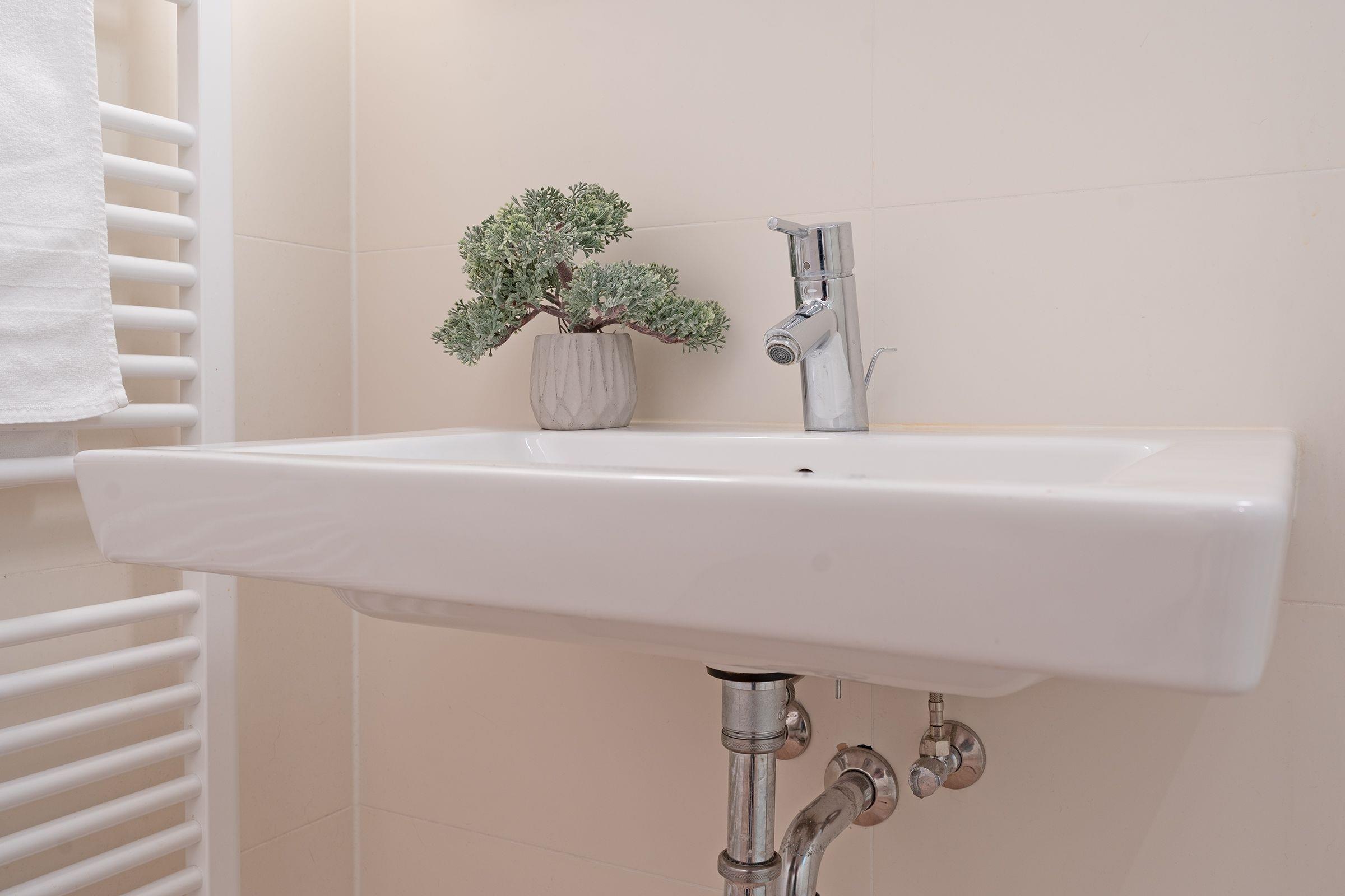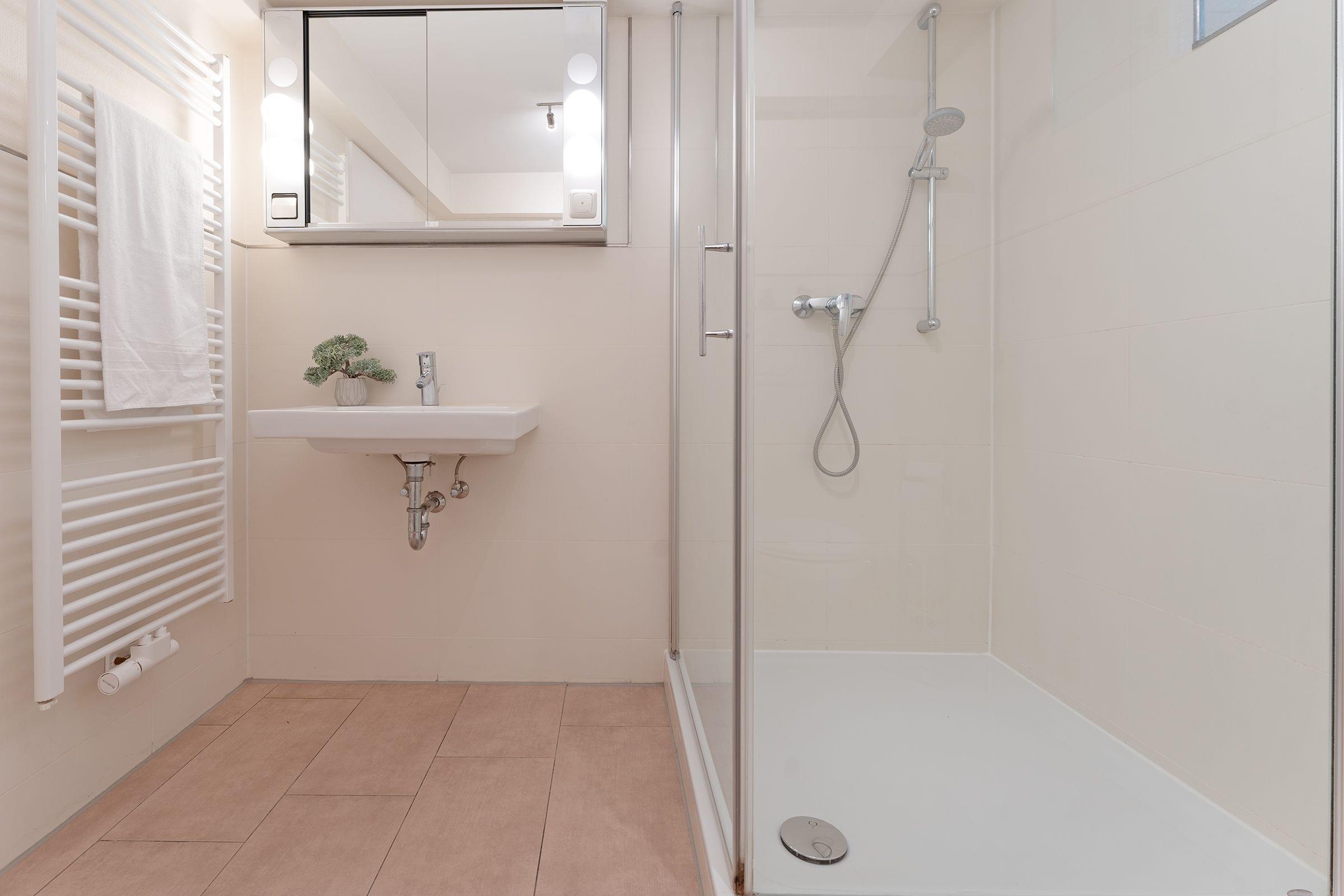 Das gepflegte Duschbad punktet mit einem Handtuchwärmer.