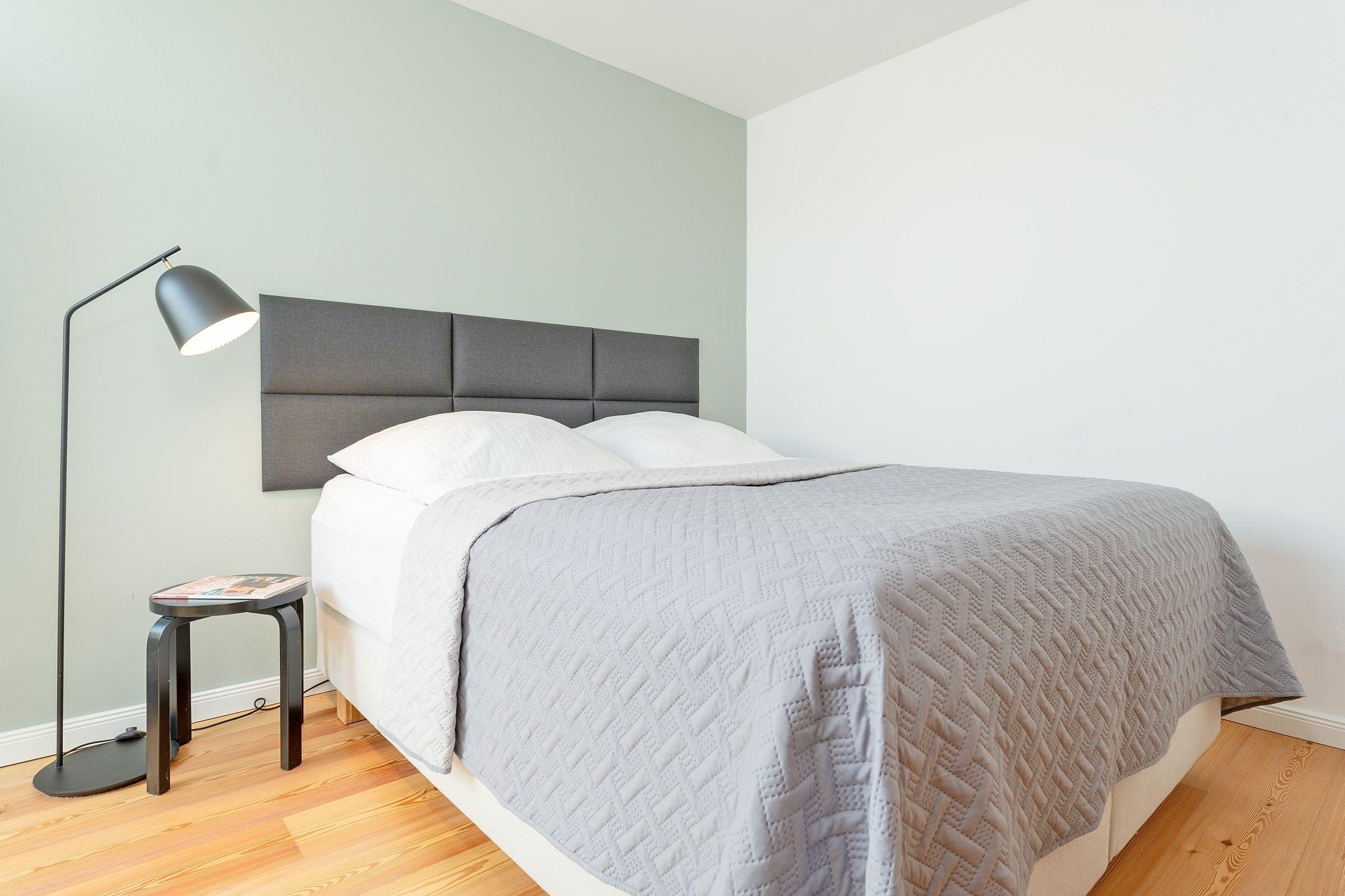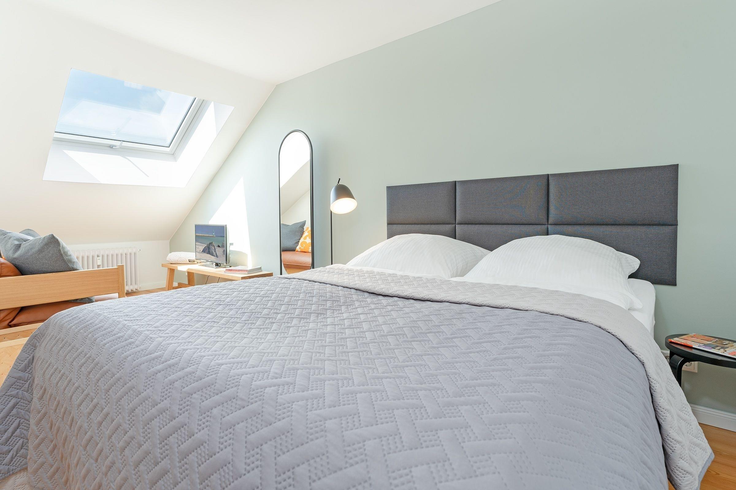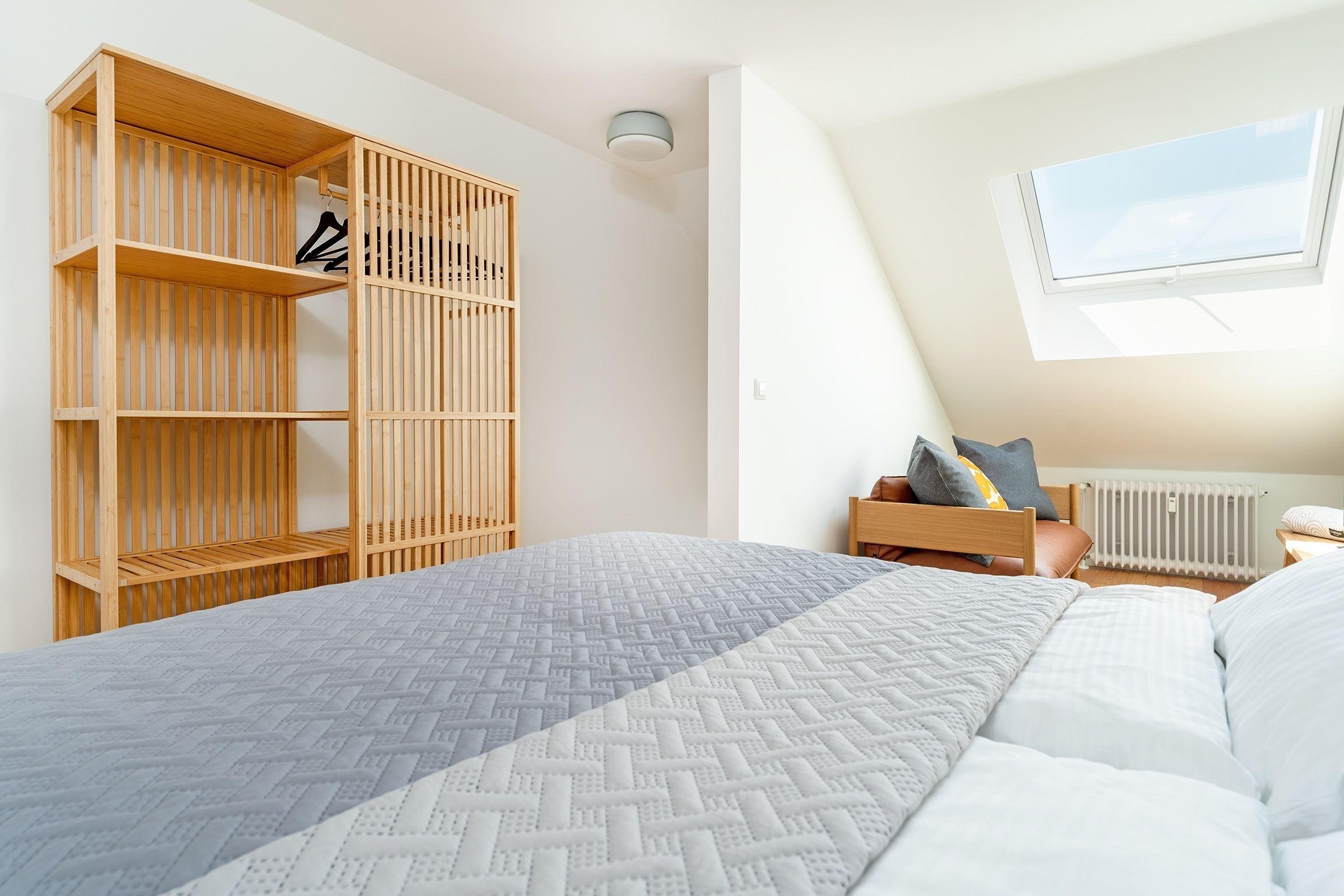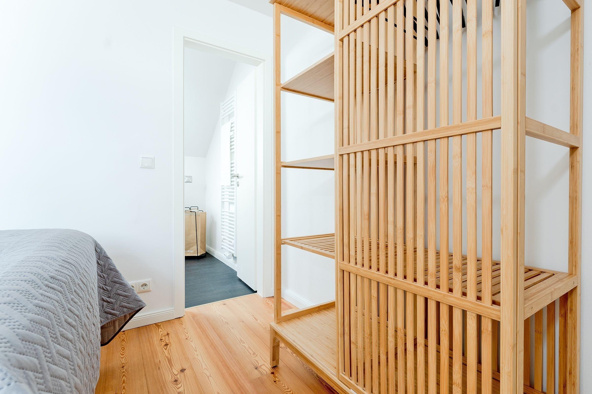 Schlafzimmer (1. Etage): 1 Boxspring-Doppelbett (160x200 cm), Kleiderschrank, Verdunkelung: Rollo, Platz für Babybett vorhanden