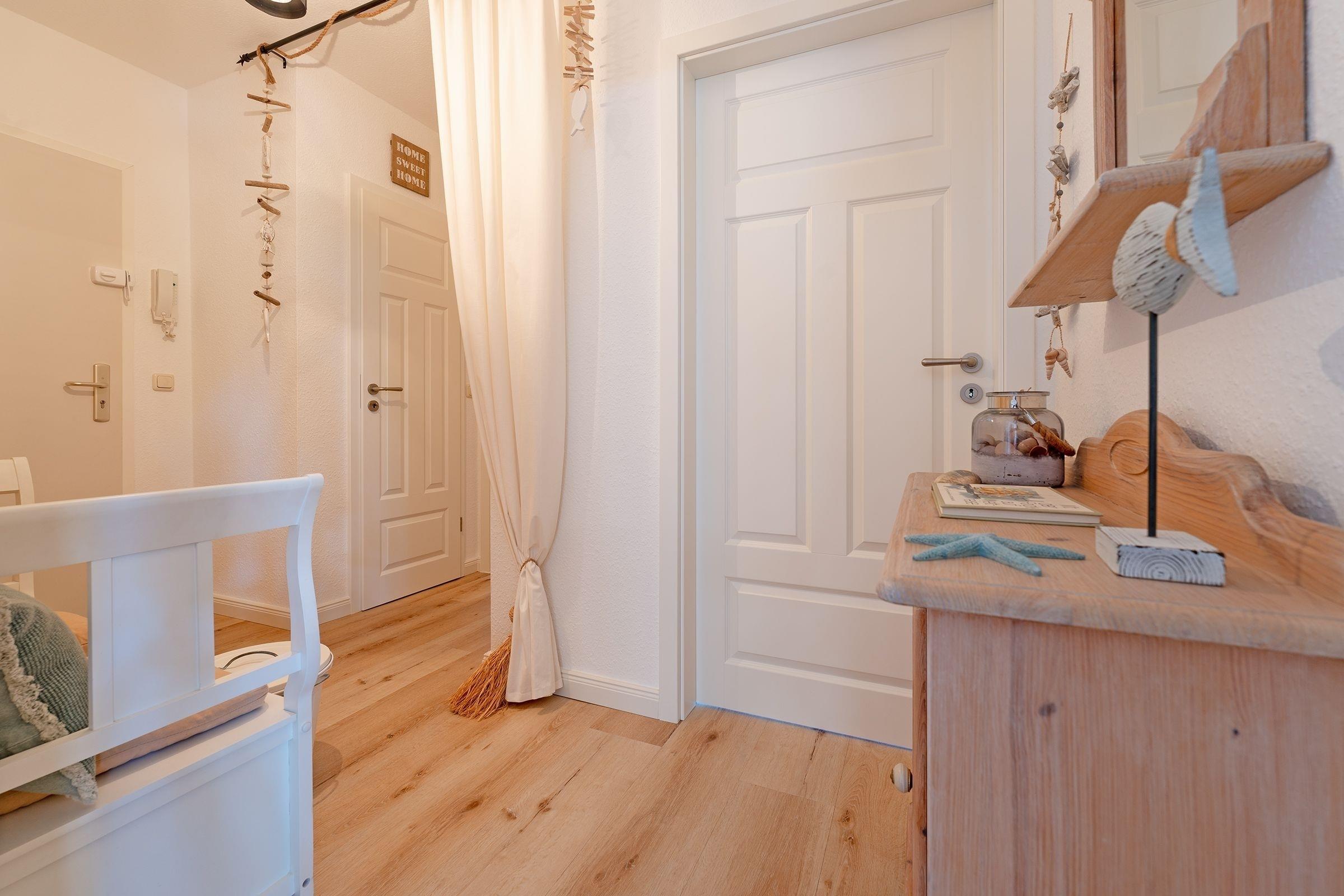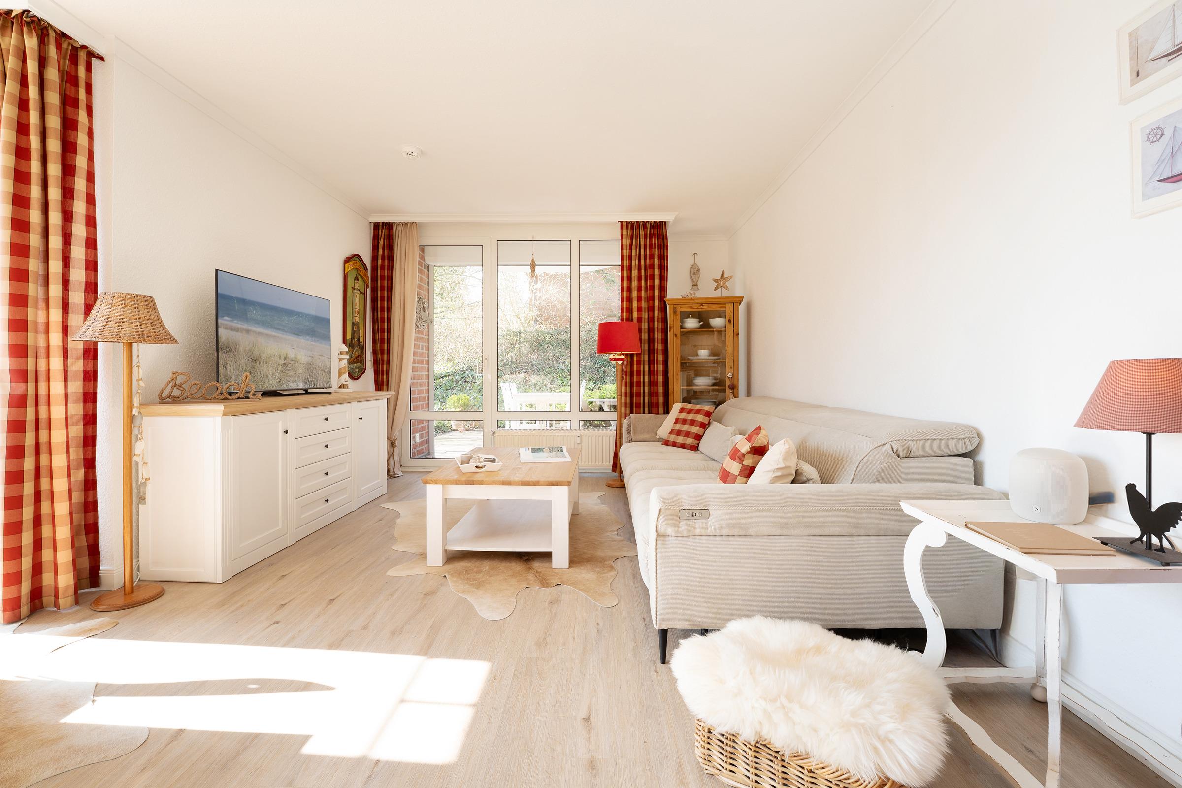 Zauberhaften Urlaub verspricht die Wohnung Zaubermuschel. Treten Sie ein, der freundliche Wohnbereich punktet durch seine geschmackvoll zusammengestellte Einrichtung mit Liebe zum Detail. Zwei große Fensterfronten lassen viel Licht hinein und sorgen für eine freundliche Atmosphäre. Abends können alle Fenster durch elektronische Rollläden abgedunkelt werden. Ihr Urlaub kann sofort beginnen. Wo wird Ihr neuer Lieblingsplatz sein? Das Sofa lädt zu kuscheligen Stunden vor dem TV-Gerät samt Streamingdiensten zur Selbstanmeldung ein. Am Fenster mit wunderschönem Erker steht eine schicke Essecke, an der man auch lustige Spieleabende verbringen kann. Und die möblierte Terrasse mit Sonnenliegen und Sonnenschirm verspricht eine wunderbare Auszeit unter freiem Himmel. Die hübsche Küche ist in den Wohnraum integriert und mit vielen kleinen Hilfsmitteln wie Espressomaschine, Mikrowelle, Mixer und Eierkocher ausgestattet, die die Selbstversorgung erleichtern und den Aufenthalt verschönern. Ein kleiner Tresen fungiert als Raumteiler.