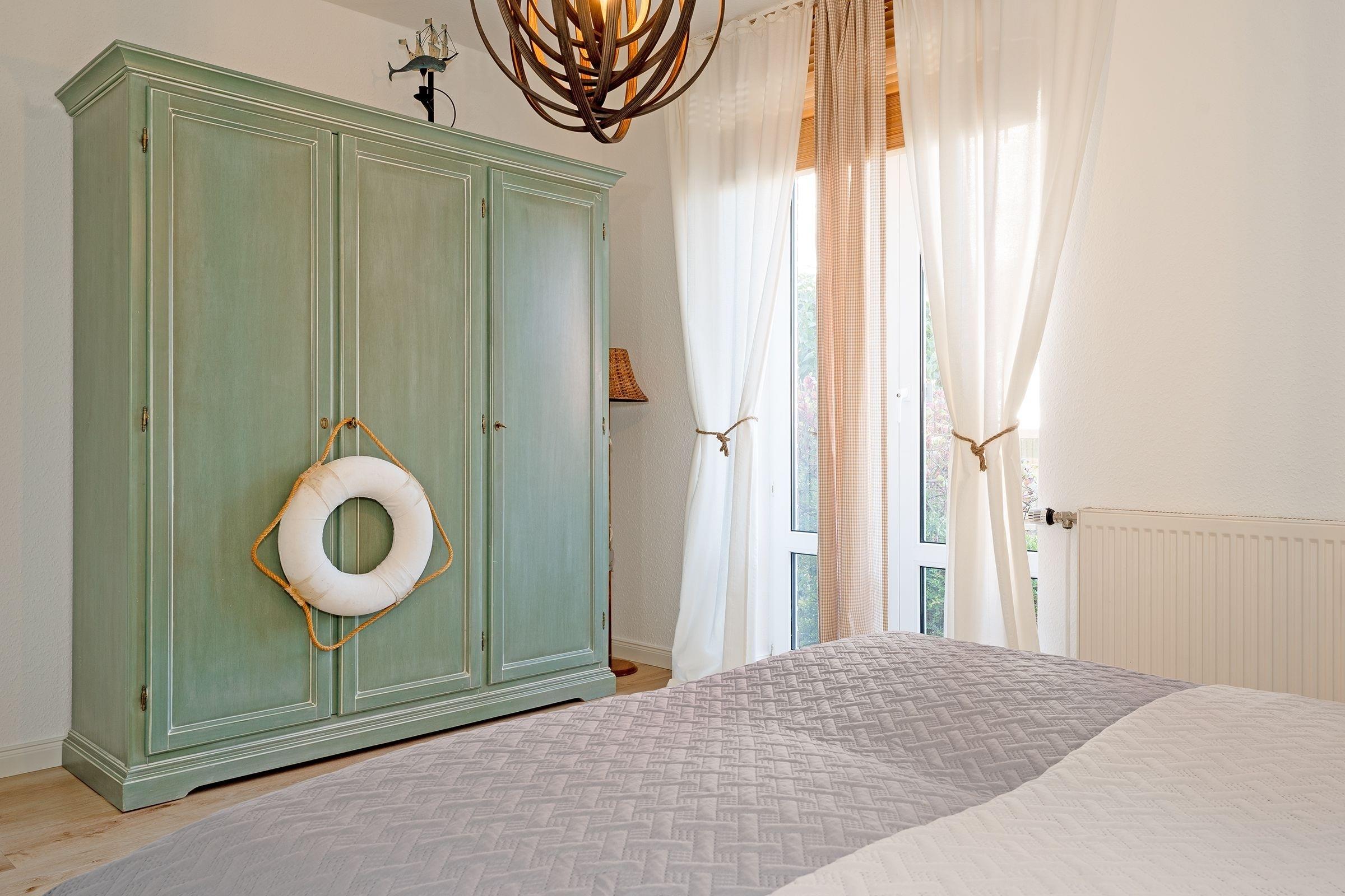 Ein weiteres Highlight der Wohnung ist das liebevoll gestaltete und großzügige Schlafzimmer, das mit einem bequemen Doppelbett (2x 90x200 cm) für einen geruhsamen Schlaf sorgt. Nach Norden ausgerichtet ist es auch im Sommer stets angenehm kühl - Ihre Kleidung findet im geräumigen Kleiderschrank Platz. Schön sind die bodentiefen Fenster, verdunkelt wird mit elektrischen Außenjalousien. Das schicke, taghelle Duschbad mit Föhn und Kosmetikspiegel lässt Sie bestimmt mit einem Lächeln in den neuen Tag starten.