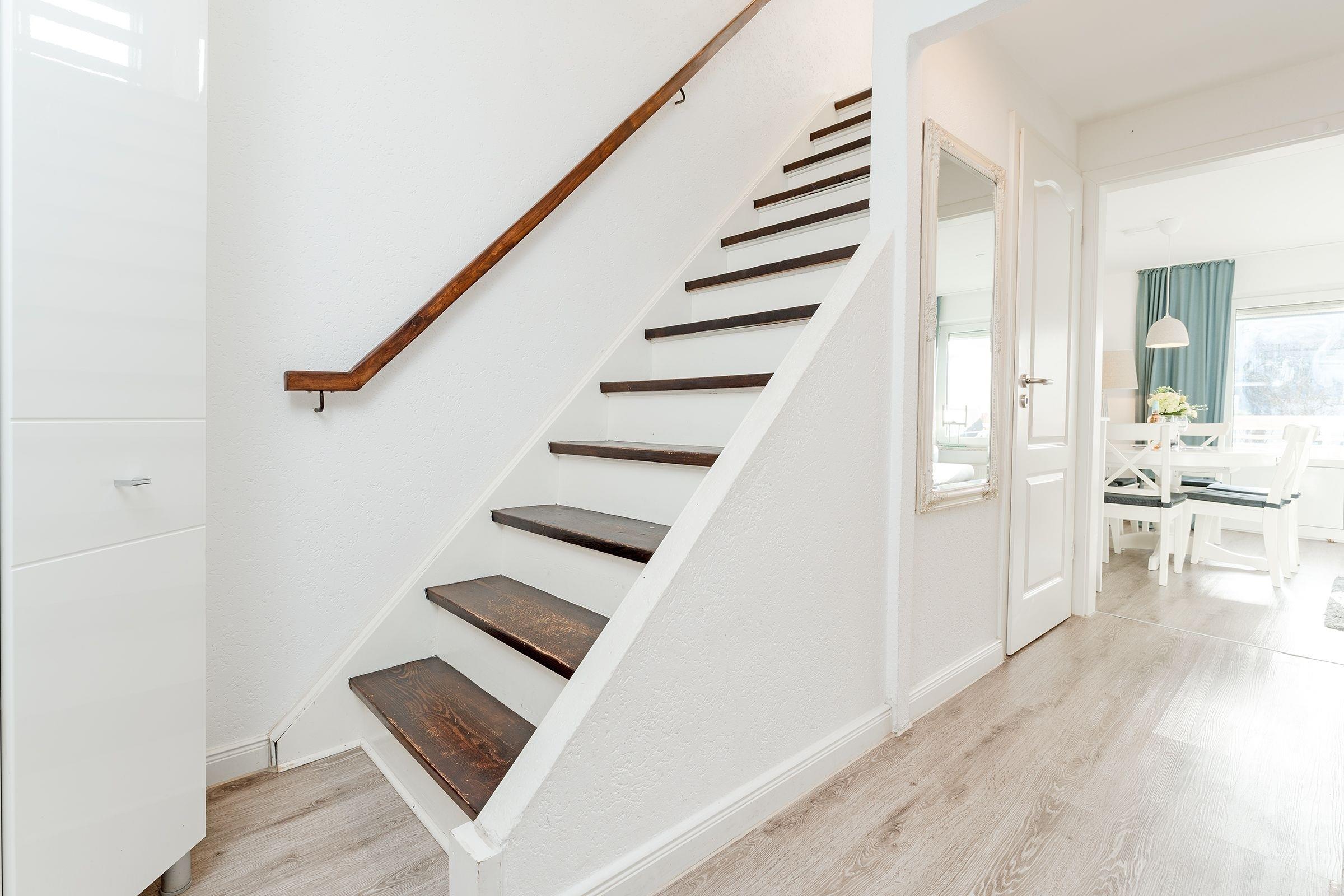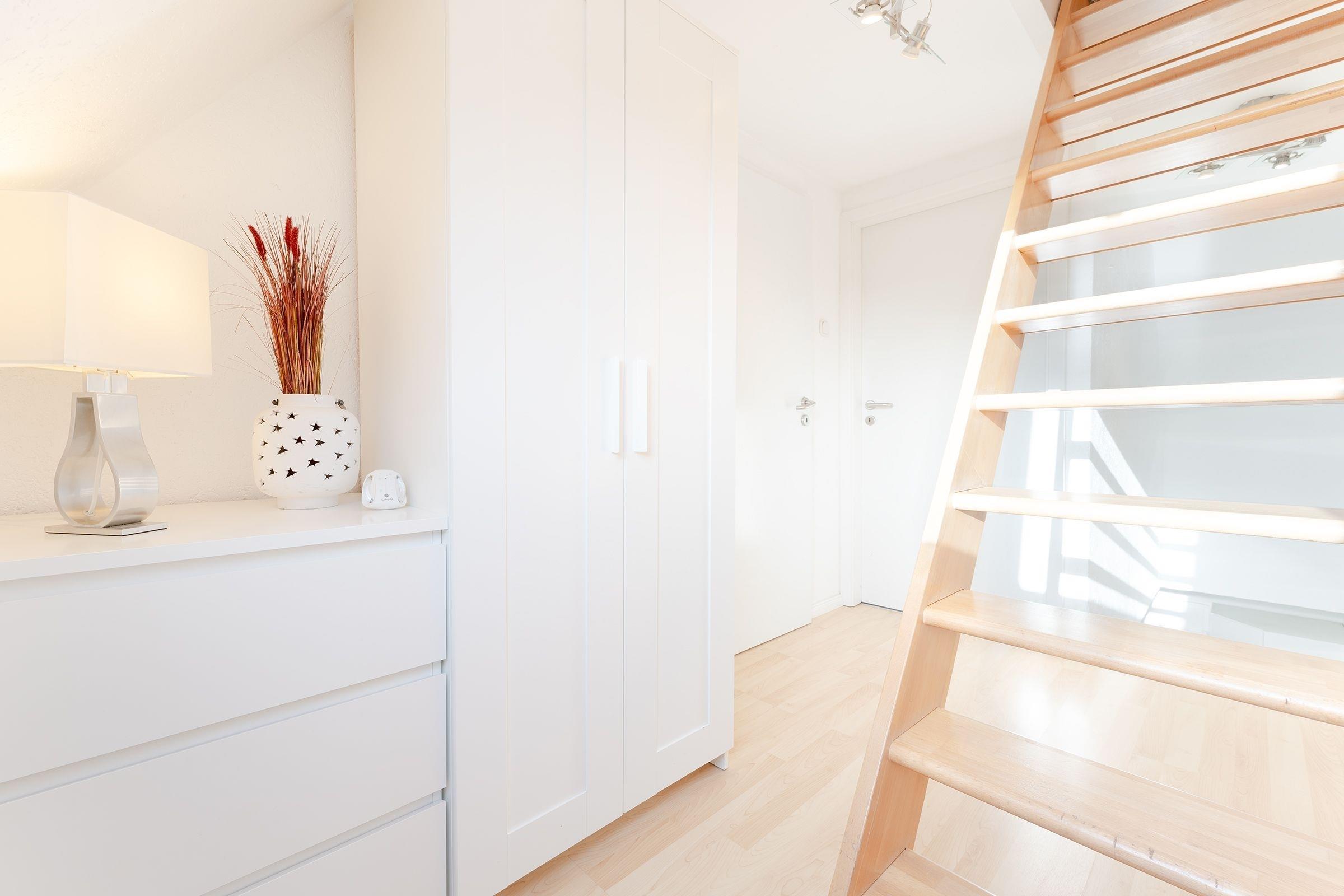 Hinweis: Bei den Treppenaufgang in das Dachgeschoss-Schlafzimmer handelt es sich um eine steile Treppe.