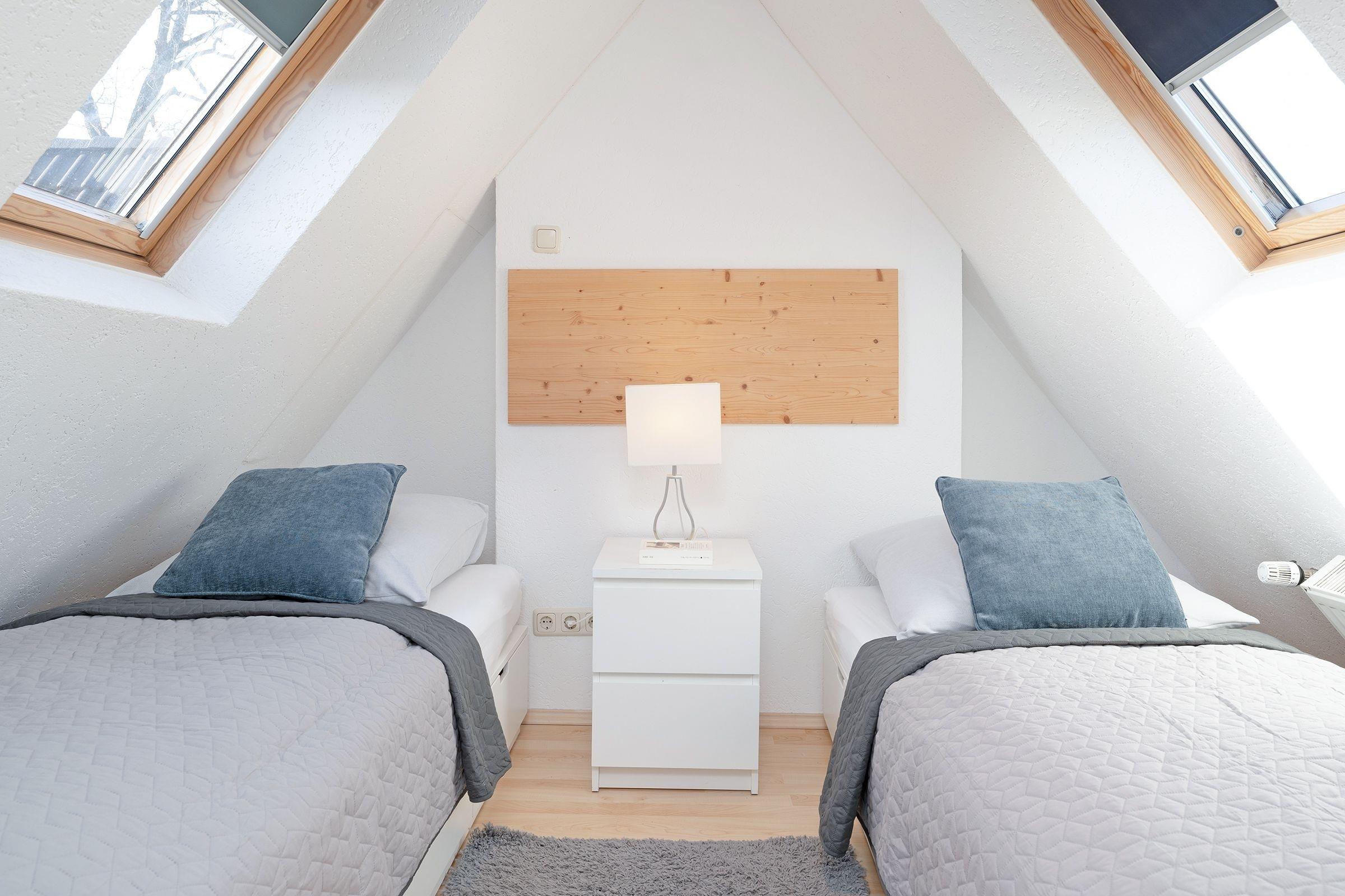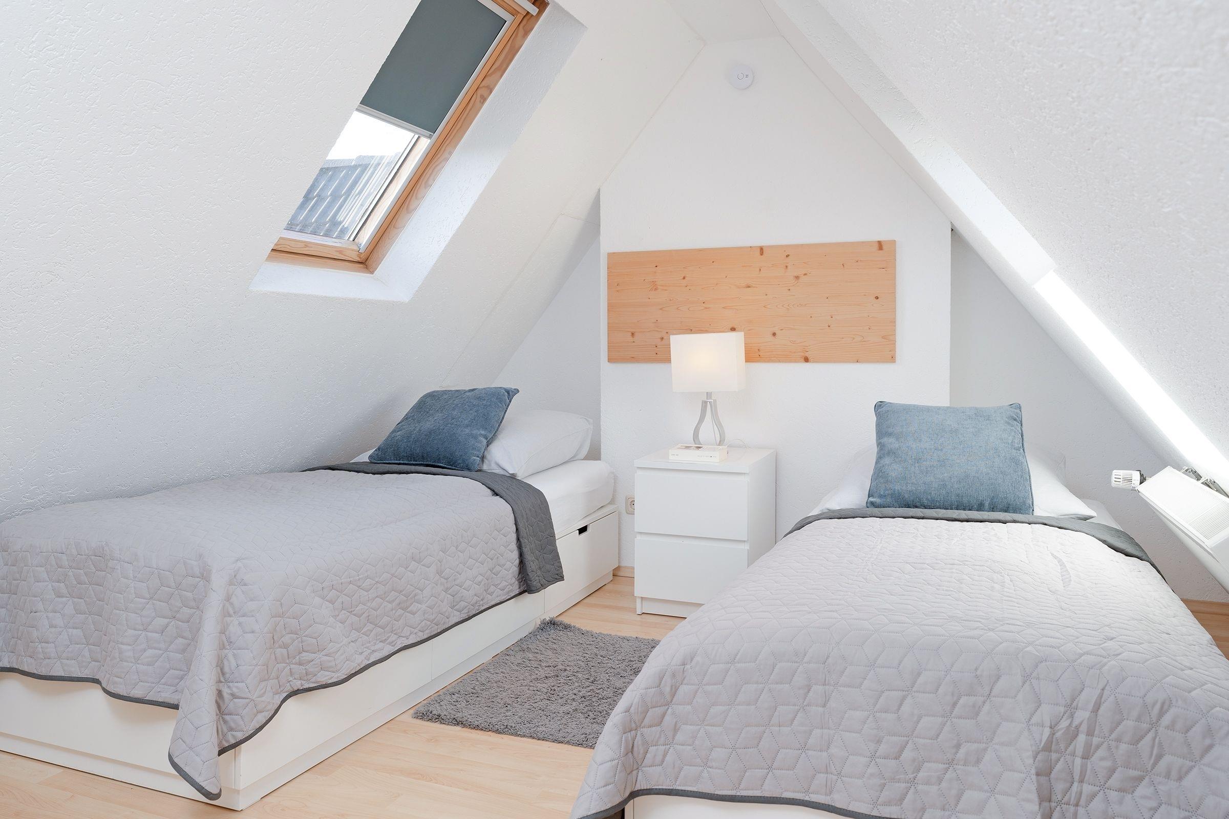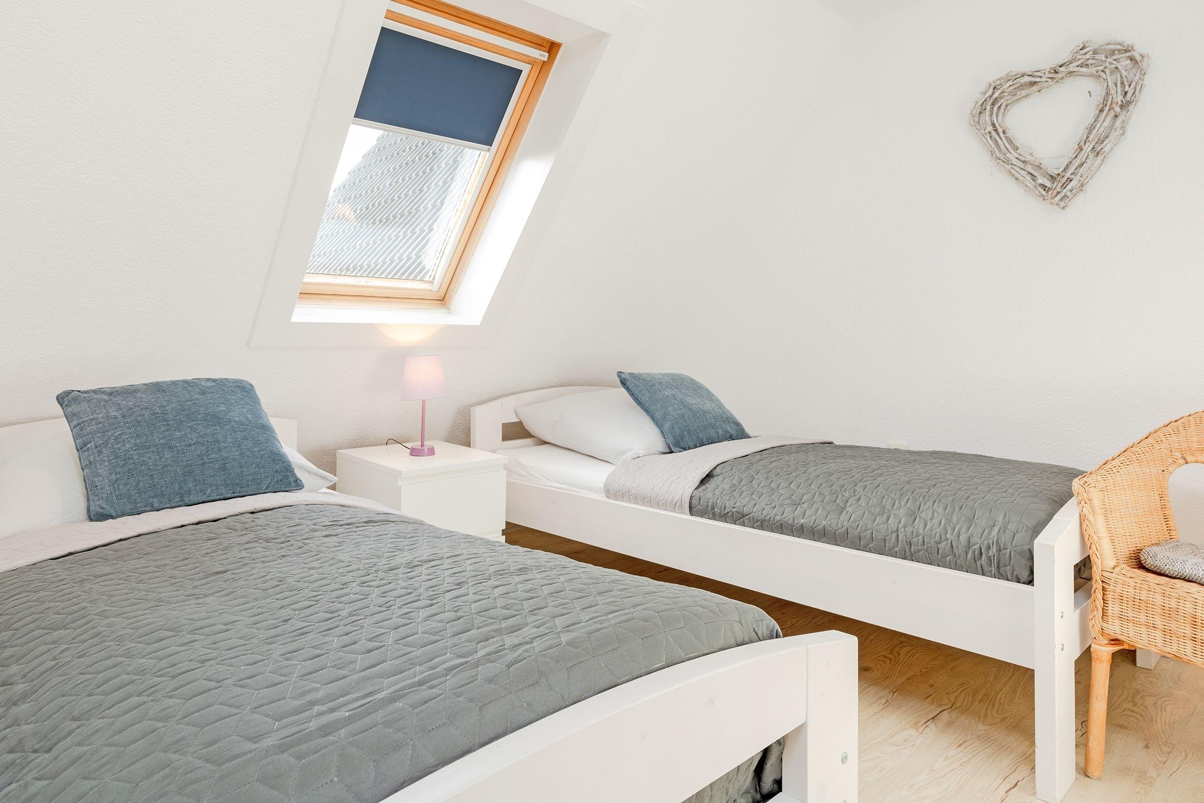 Schlafzimmer 2 im 1.OG: 2 Einzelbetten (je 90x200 cm), Verdunkelungsmöglichkeit: Verdunkelungsrollo, kein Platz für Babybett vorhanden