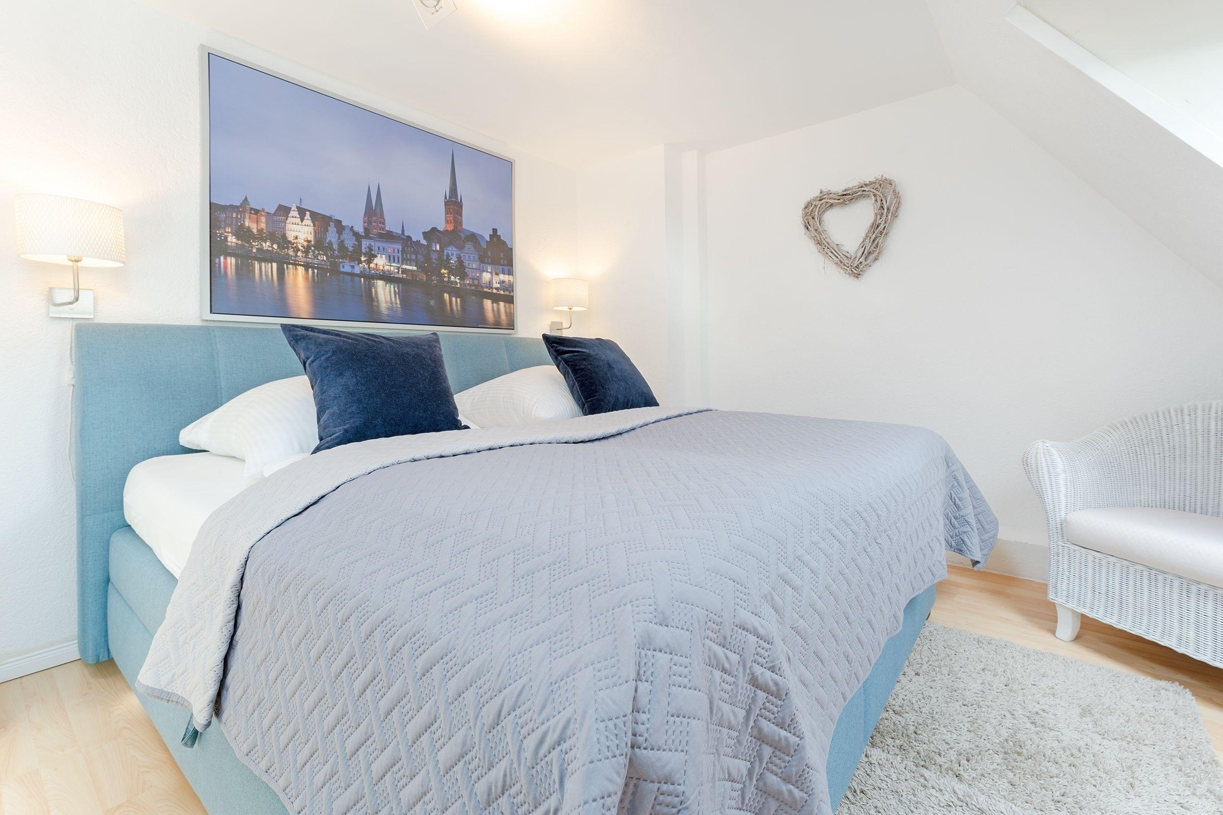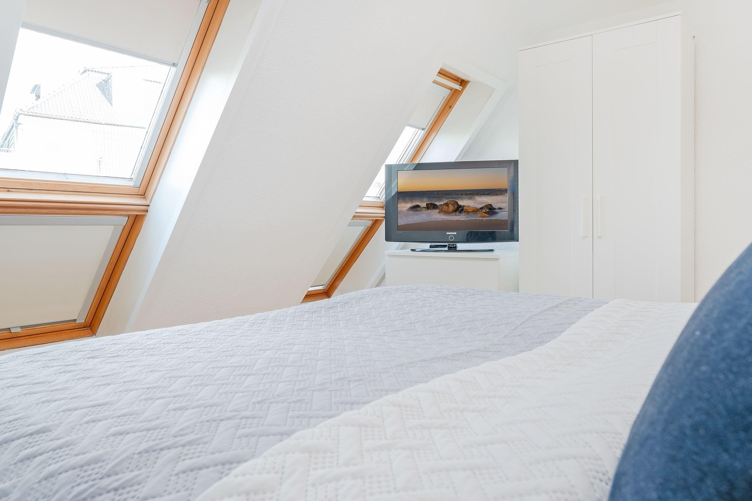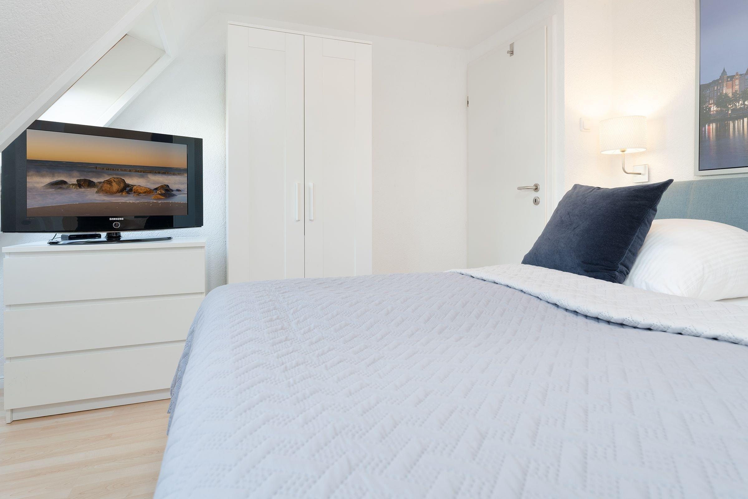 Schlafzimmer 1 im 1.OG: 1 Boxspringbett (200x200 cm), Kleiderschrank, TV, Verdunkelungsmöglichkeit: Verdunkelungsrollo, Platz für Babybett vorhanden