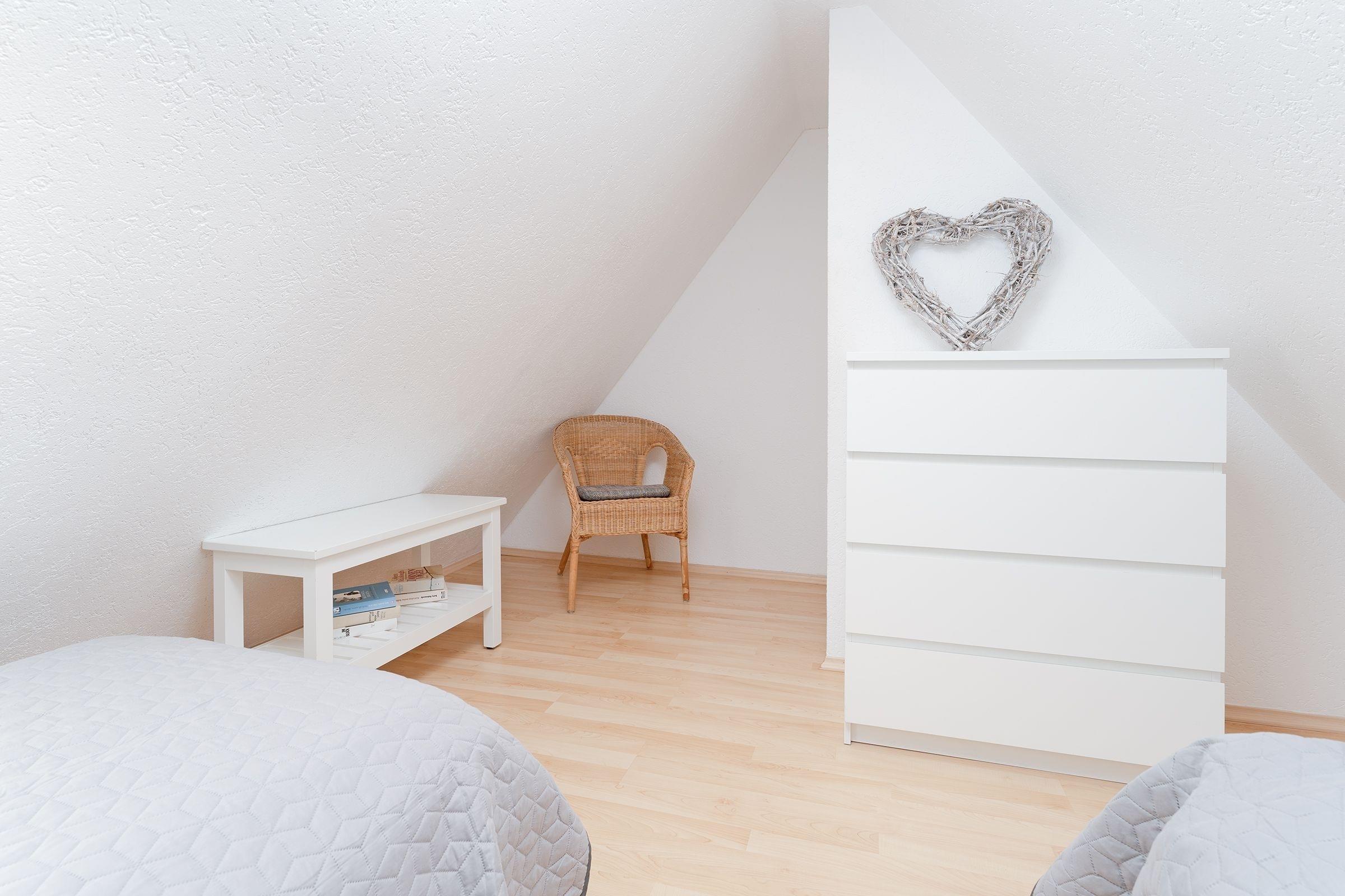 Schlafzimmer 3 im DG: 2 Einzelbetten (je 90x200 cm), Verdunkelungsmöglichkeit: Verdunkelungsrollo, Platz für Babybett vorhanden