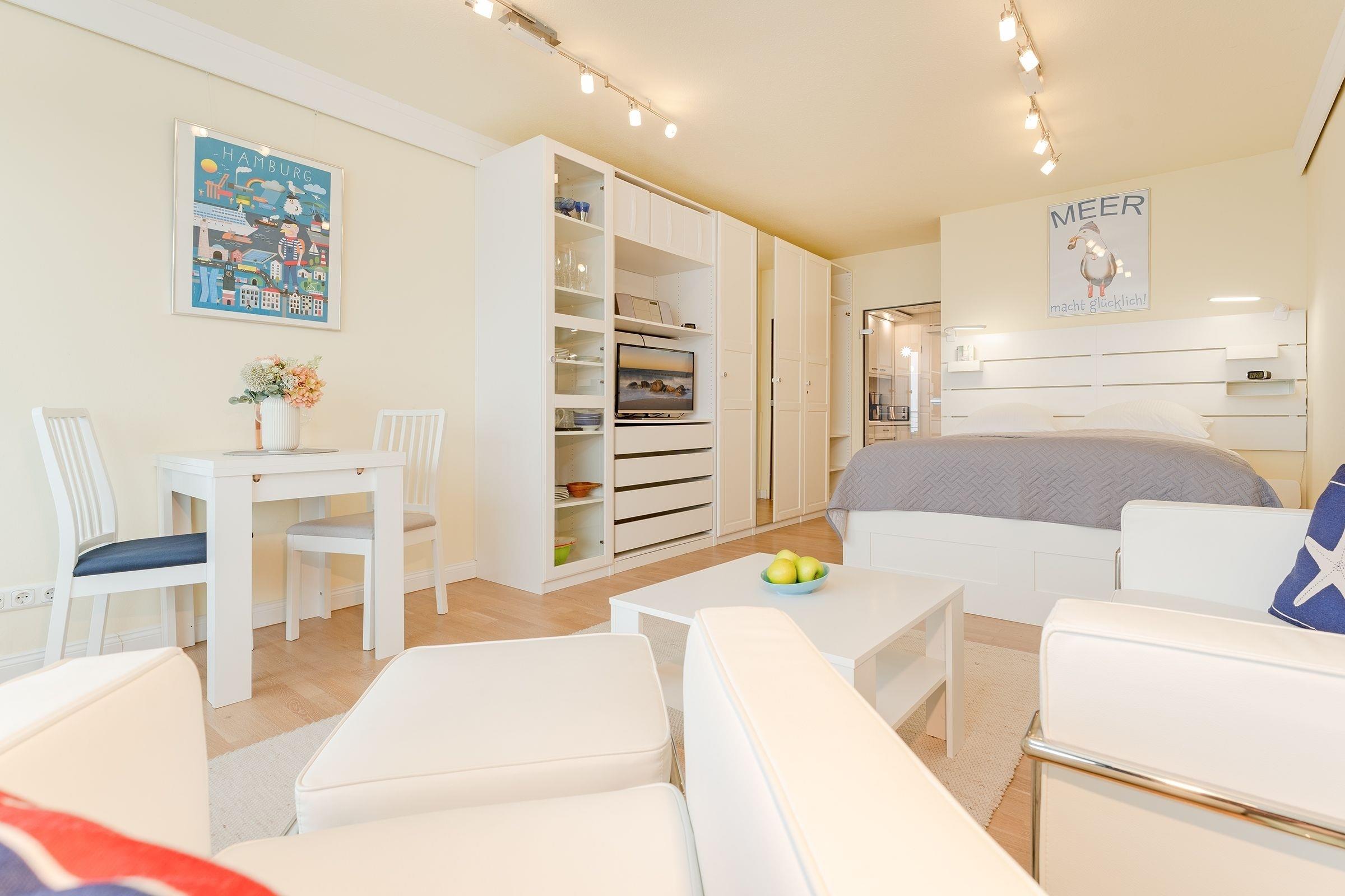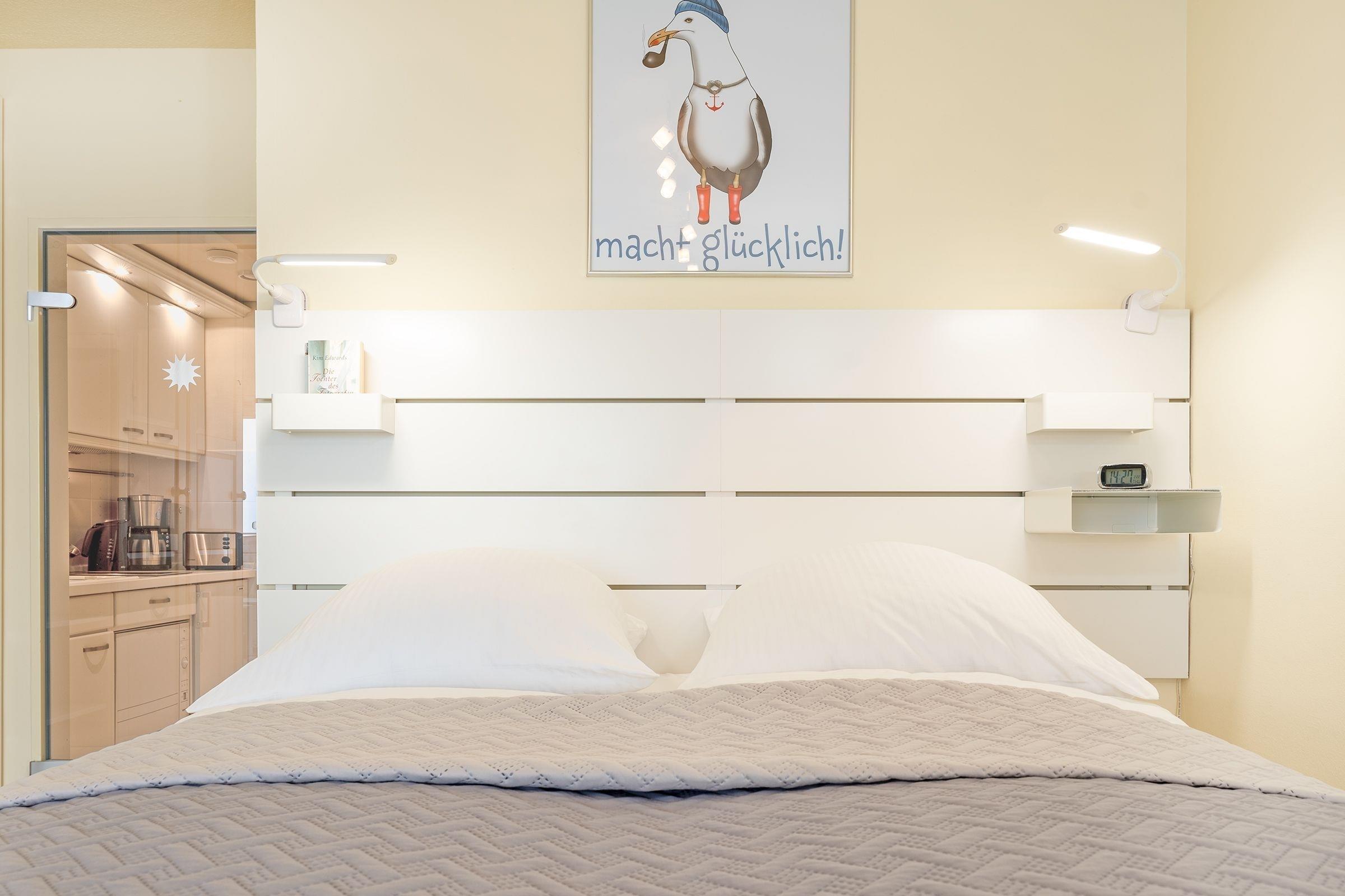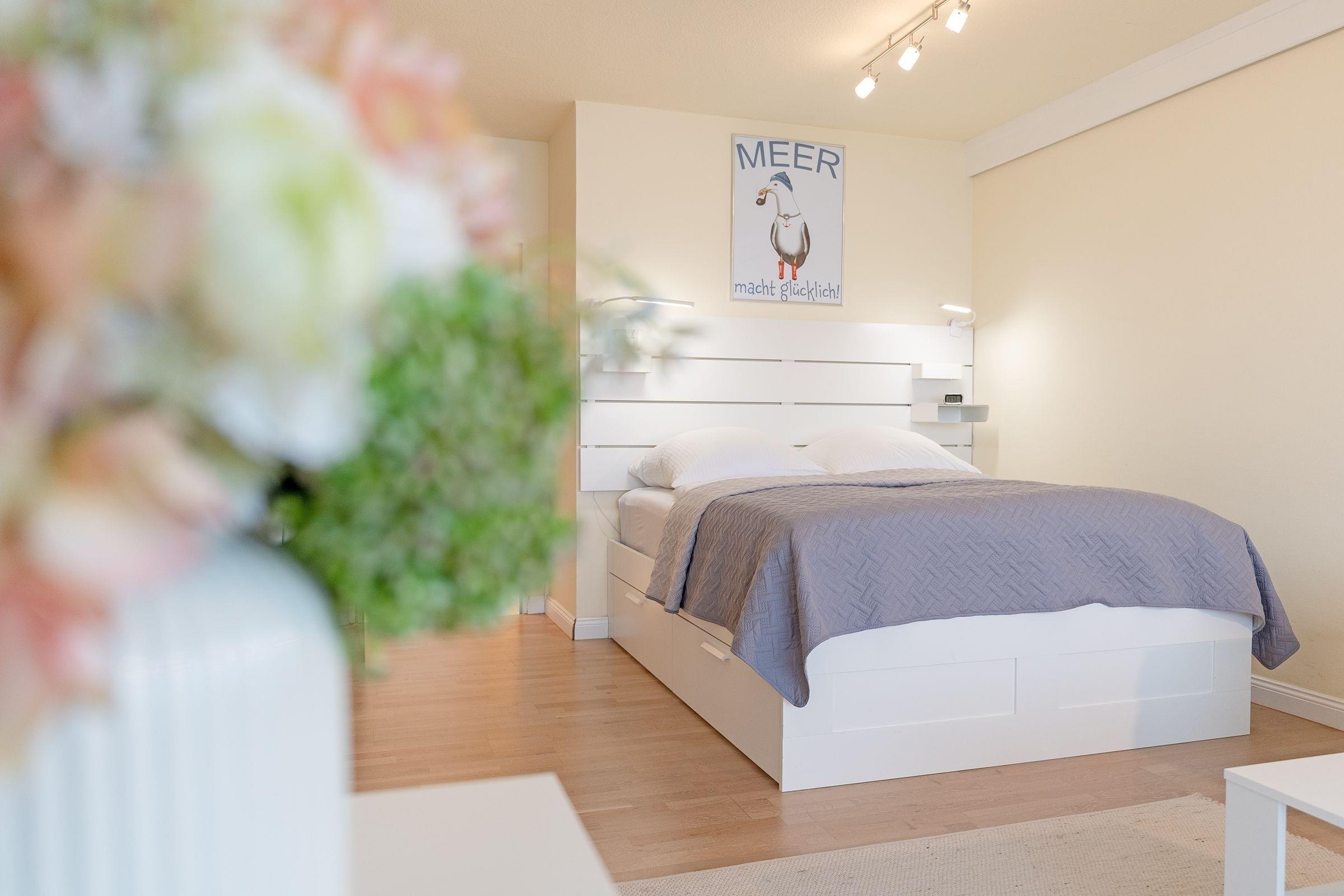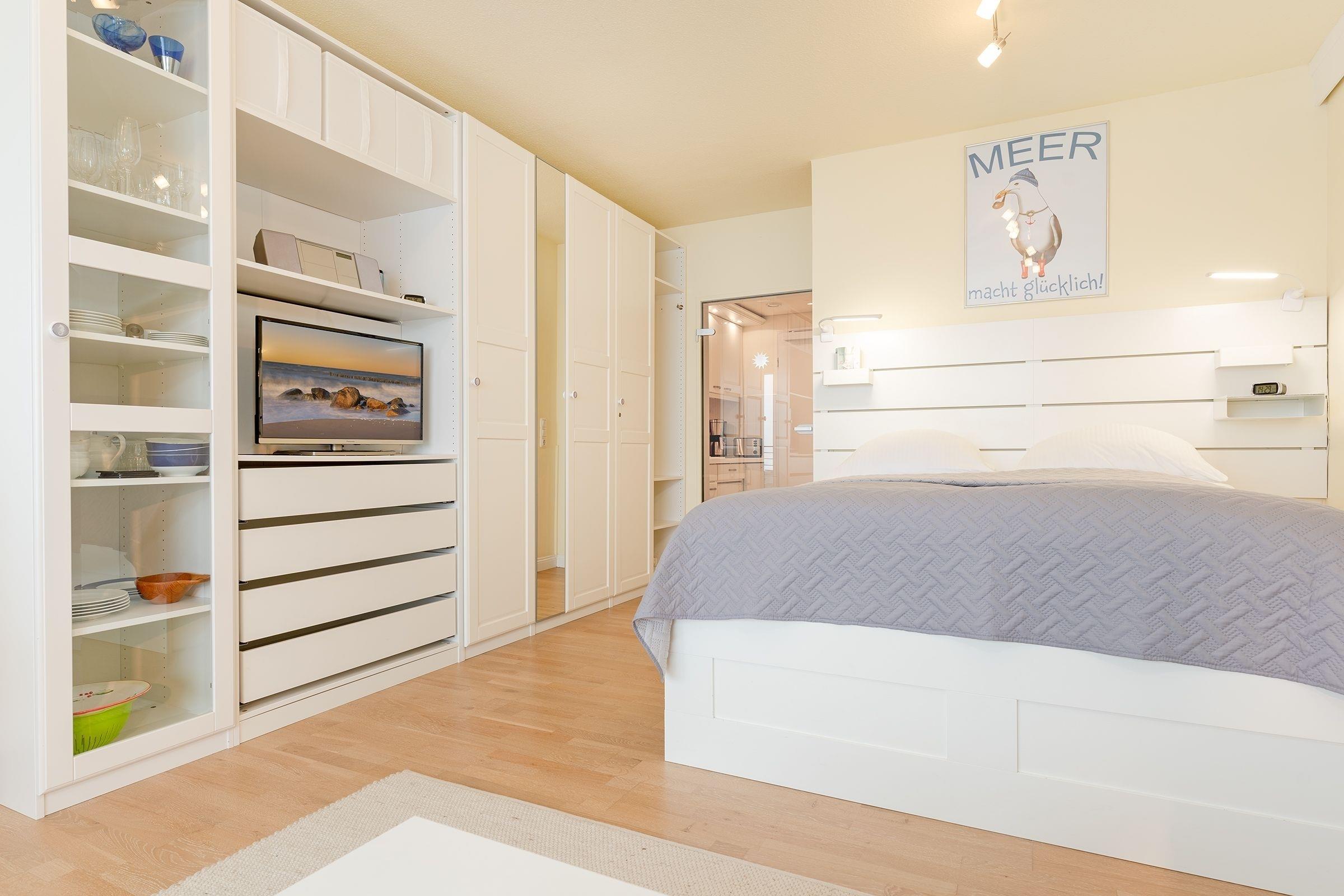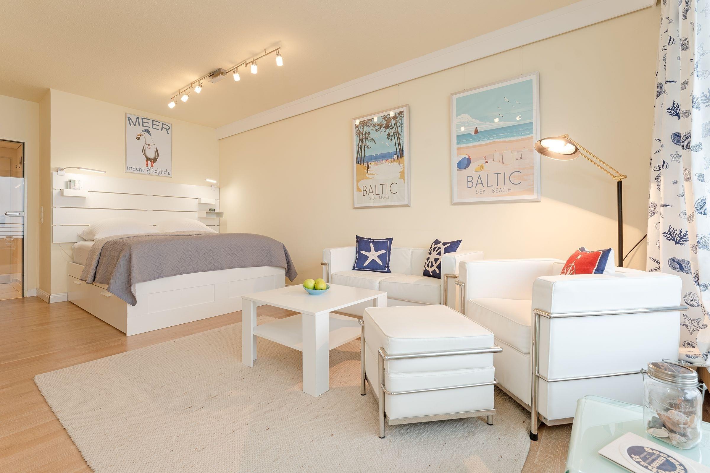 Stellen Sie sich vor, Sie treten auf den Balkon – und werden mit einem traumhaften Weitblick über das Meer und die Ostseeküste begrüßt. Der große, möblierte Balkon wird sicher Ihr neuer Lieblingsplatz, doch das Apartment hat noch mehr zu bieten: Der Wohn-/Schlafbereich ist maritim und mit viel Liebe zum Detail eingerichtet und hat viel Stauraum. Neben einer gemütlichen Polstergarnitur mit TV und einer kleinen Essecke gibt es eine offene Küche mit vielen Extras wie Senseo-Maschine und Geschirrspüler. Im hinteren Bereich steht ein bequemes Doppelbett (180x200 cm) für die Nachtruhe. Das komfortable Duschbad bringt Sie gut in den Tag. Übrigens: Das Motto dieser Wohnung lautet "Meer macht glücklich" – probieren Sie es aus!