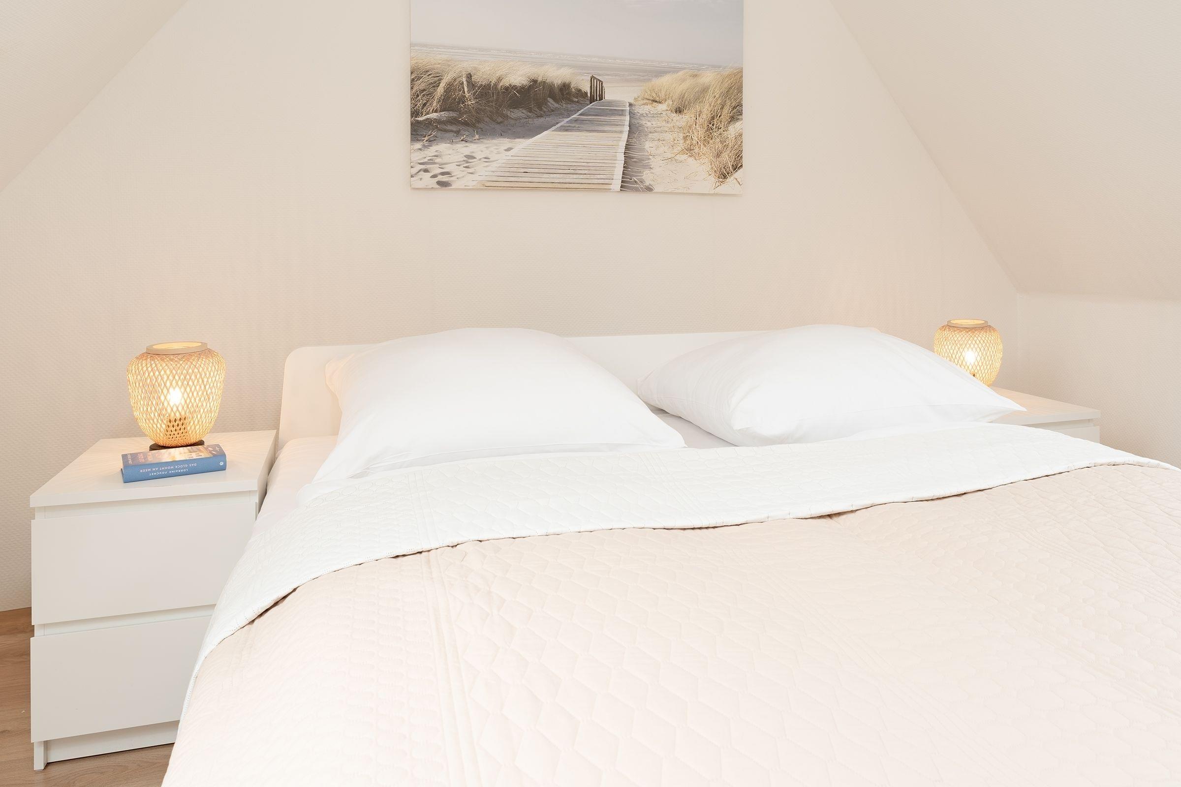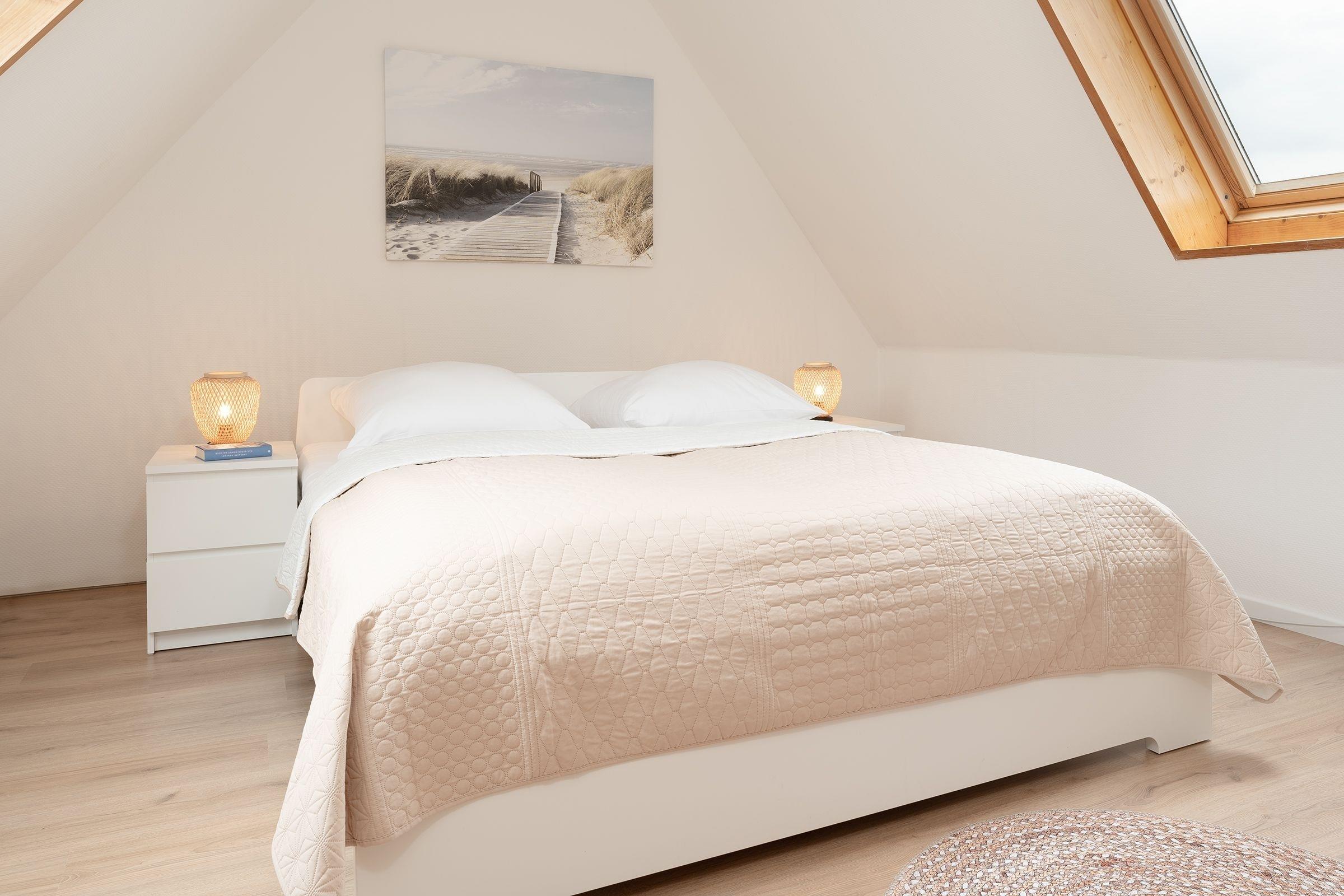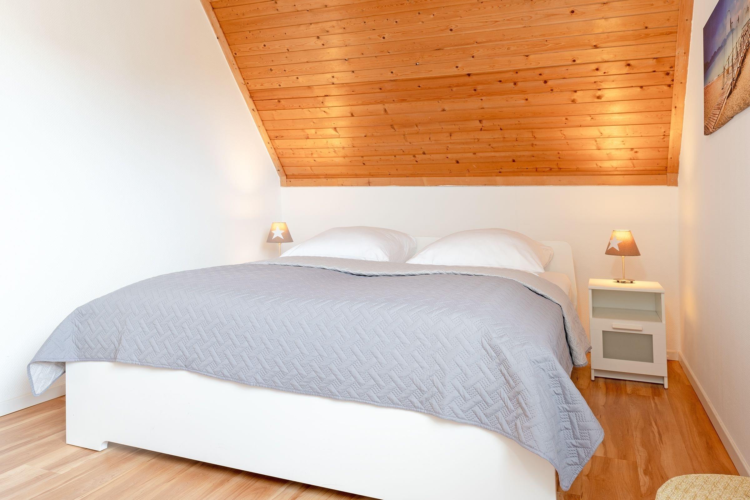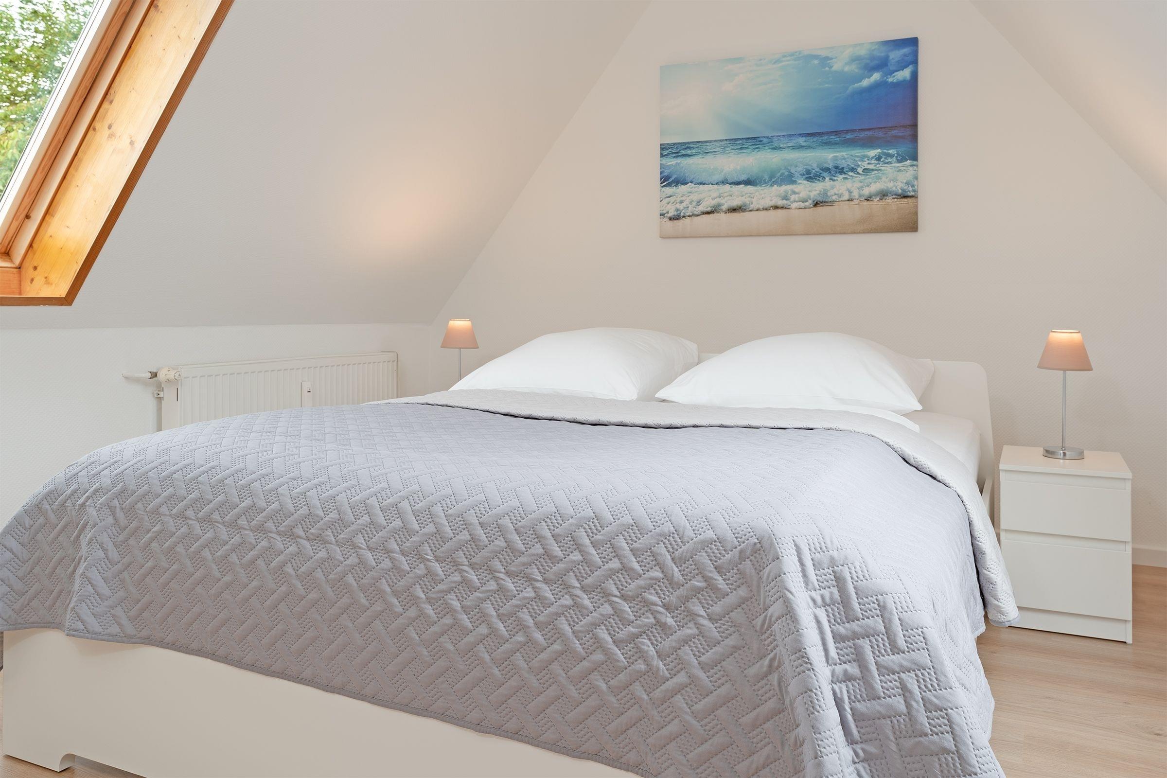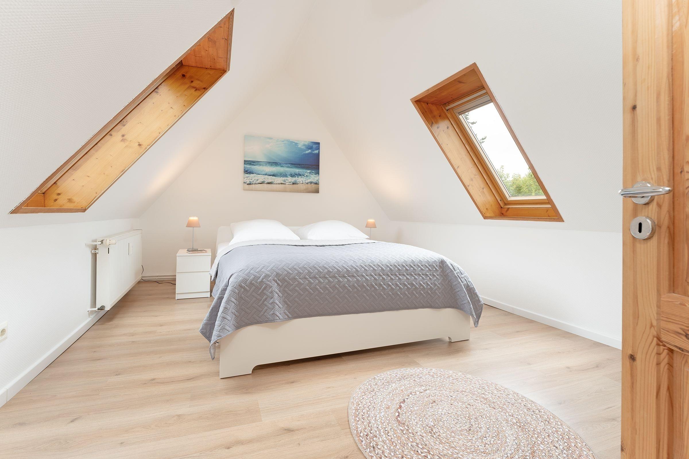 1. Schlafzimmer (1.OG): 1 Doppelbett (180x200 cm), Kleiderschrank, Sichtschutz: Plissees, Platz für Babybett vorhanden