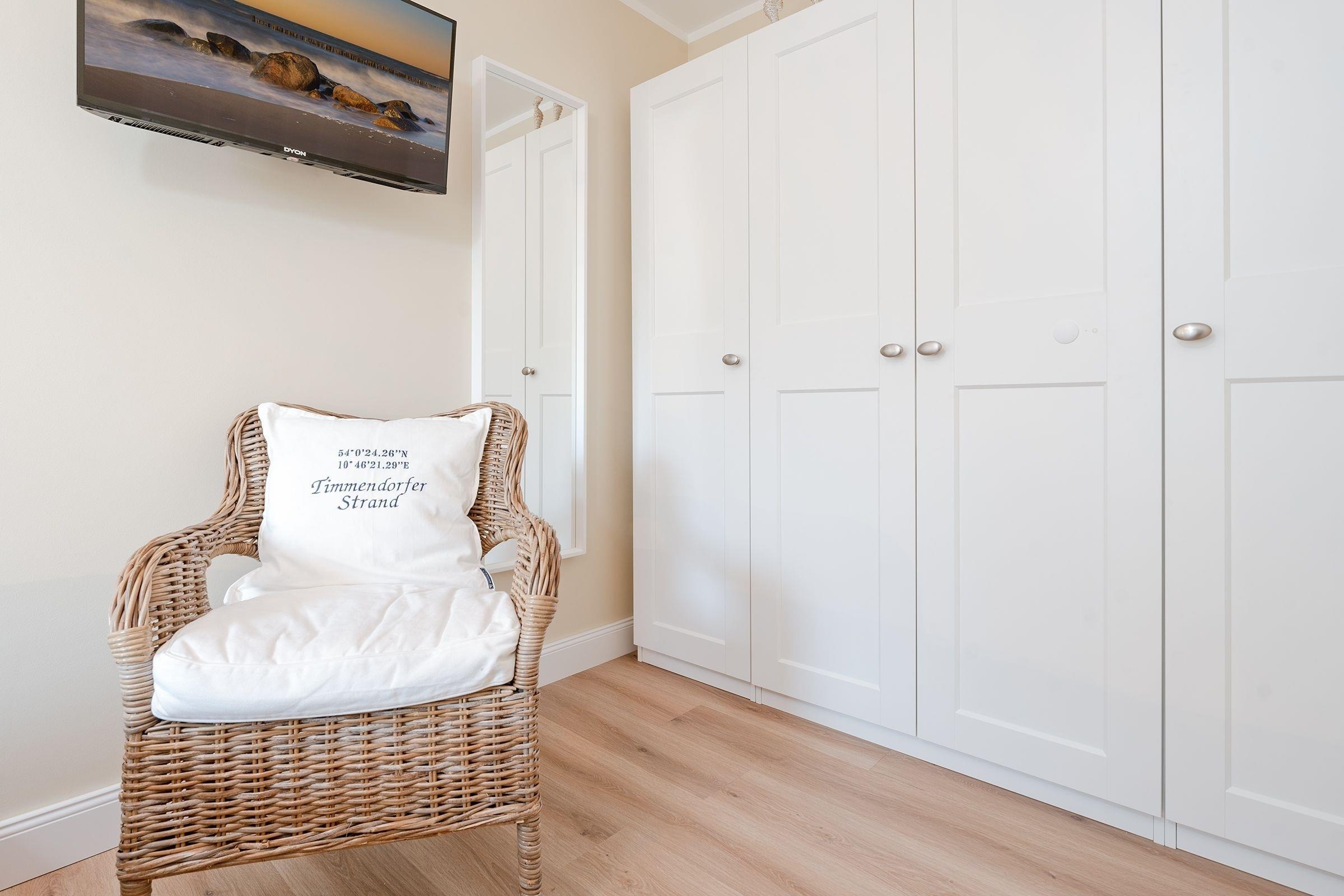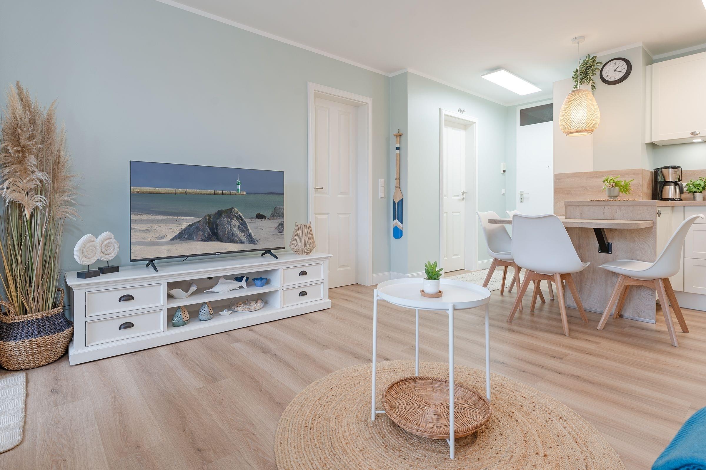 Beim Betreten dieser gemütlichen Ferienwohnung gelangen Sie direkt in den offenen Wohnbereich. Das Wohnzimmer bietet einen bequemen TV-Bereich mit Zugang zu Streaming-Diensten wie Netflix und Amazon Prime (eigene Accounts erforderlich), ideal für entspannte Abende nach einem Tag am Meer. Für die Nacht lässt sich das Schlafsofa in einen bequemen Schlafplatz umwandeln (120x200 cm). Der angrenzende Balkon ist nach Osten ausgerichtet und bietet den idealen Ort für ein Frühstück in der Morgensonne. Ein Grillplatz steht im Gemeinschaftsgarten ebenfalls zur Verfügung, falls Sie den Tag mit einem Barbecue ausklingen lassen möchten. In der integrierten Küche mit Induktionsherd, Kühl-Gefrier-Kombination und Kaffeemaschine finden Sie alles, um sich kulinarisch zu verwöhnen. Das Hauptschlafzimmer verspricht mit einem komfortablen Boxspringbett (160x200 cm) kuschelige Nächte. Im modernen Badezimmer mit komfortabler Handtuchheizung starten Sie erfrischt in Ihre Urlaubstage. Als weiteres Highlight steht Ihnen im Nachbarhaus eine Gemeinschaftssauna (Münzbetrieb) zur Verfügung.