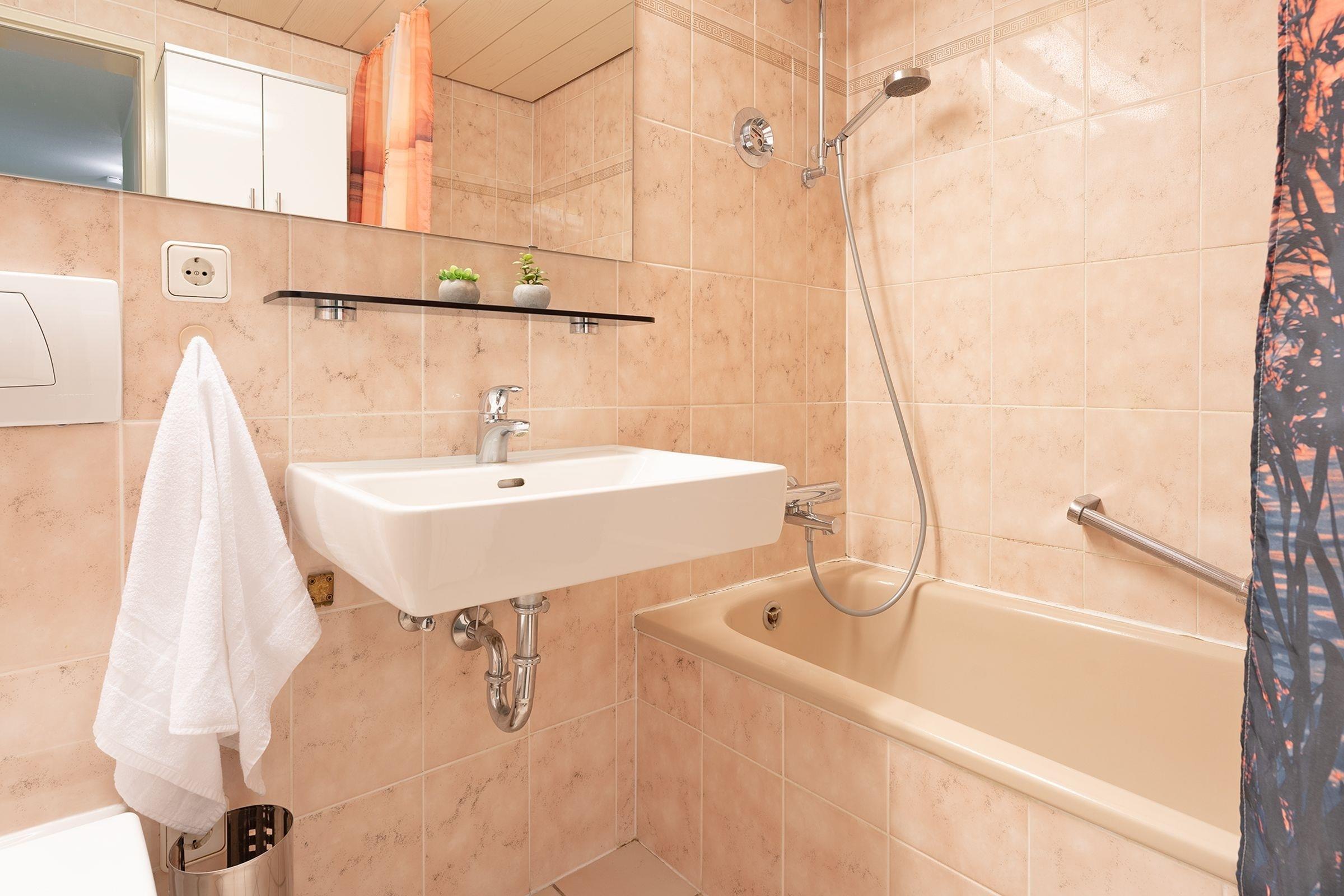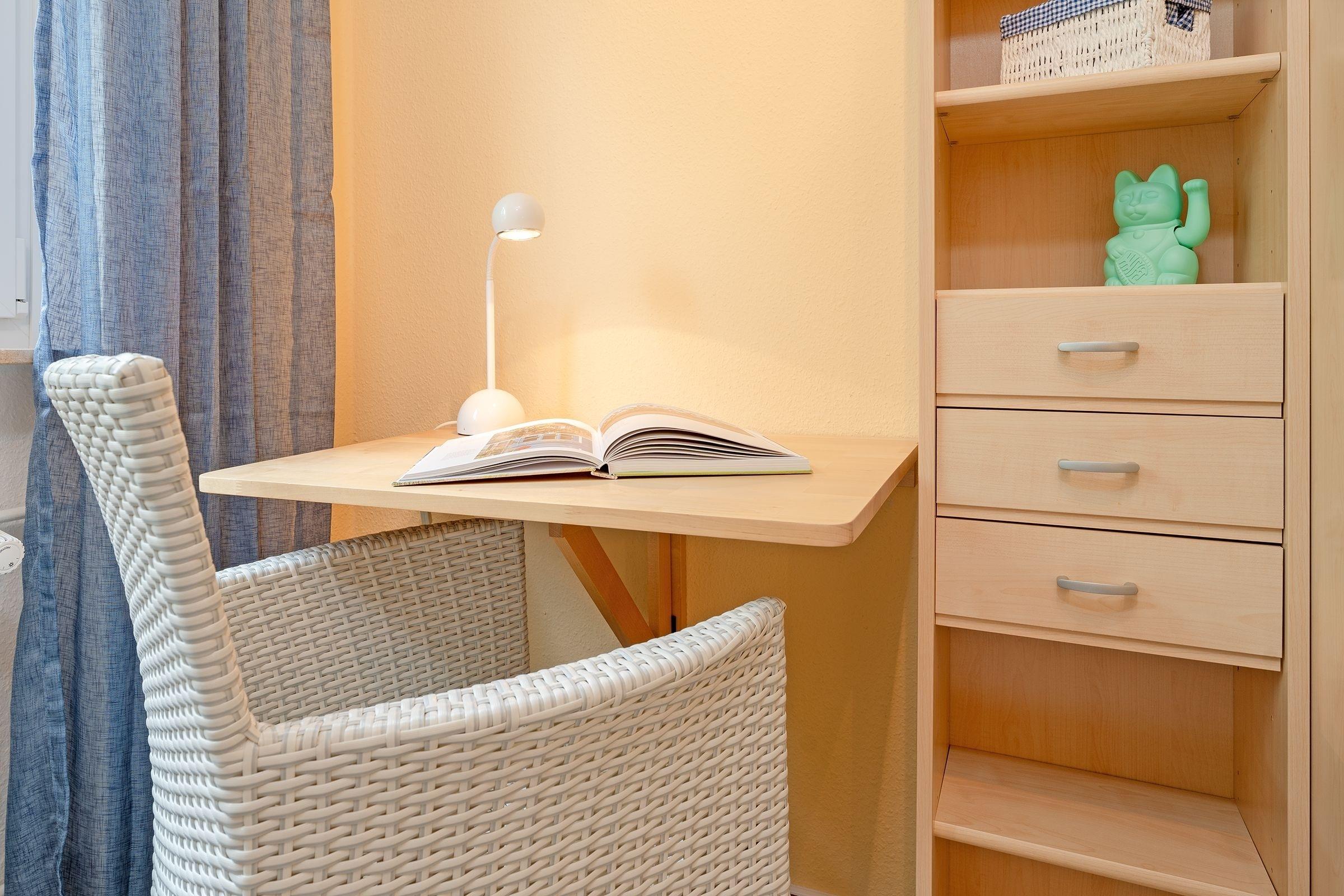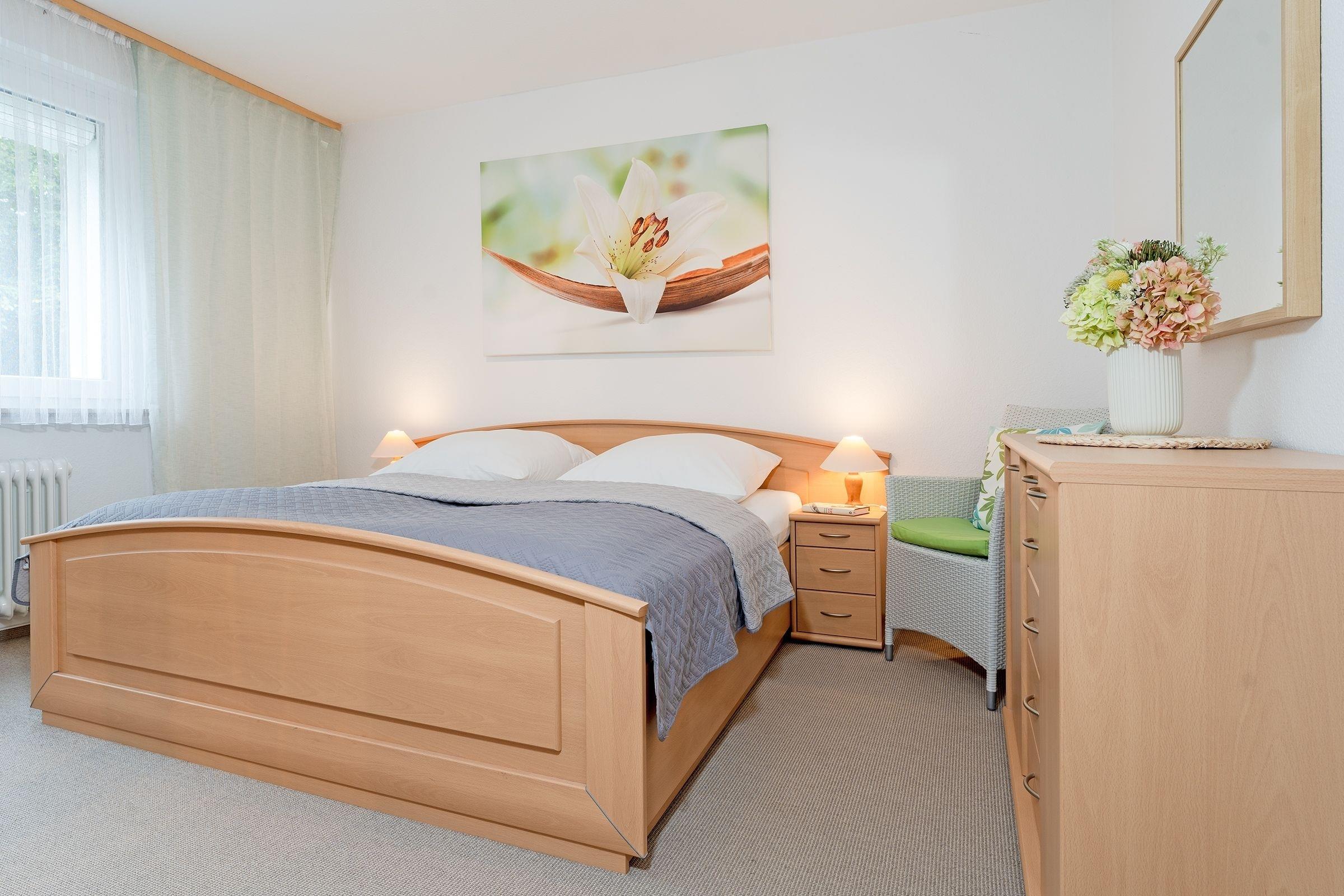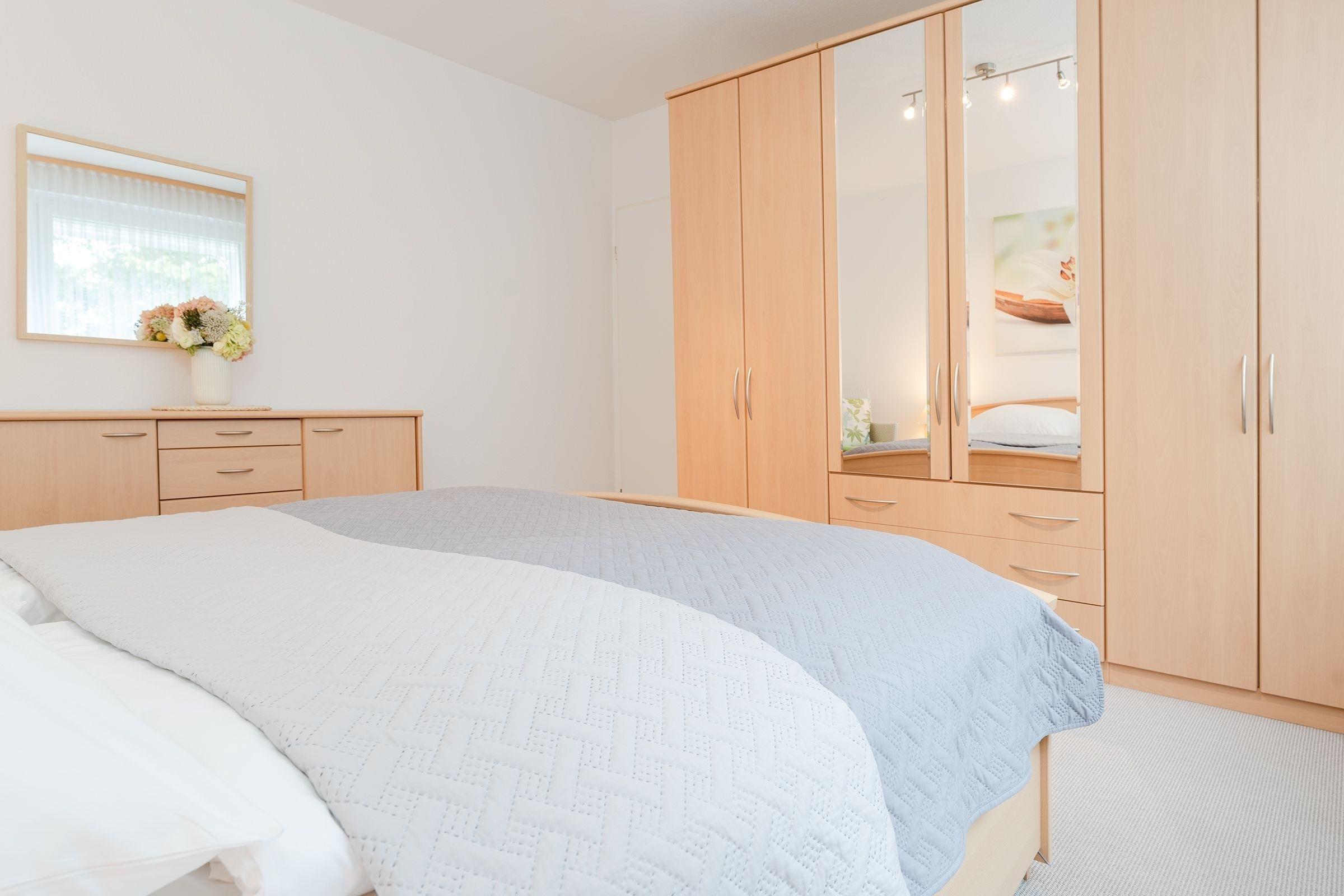 Im ersten Schlafzimmer finden Sie ein komfortables Doppelbett (2x 90x200 cm) sowie einen geräumigen Kleiderschrank für Ihre Urlaubsgarderobe. Das zweite Schlafzimmer ist mit einem Einzelbett (90x200 cm) ausgestattet und bietet ebenfalls einen Kleiderschrank. Alle Räume verfügen über Außenjalousien zur Verdunkelung. Ein modernes Badezimmer sowie ein zusätzliches Gäste-WC ergänzen den Komfort dieser Ferienwohnung.