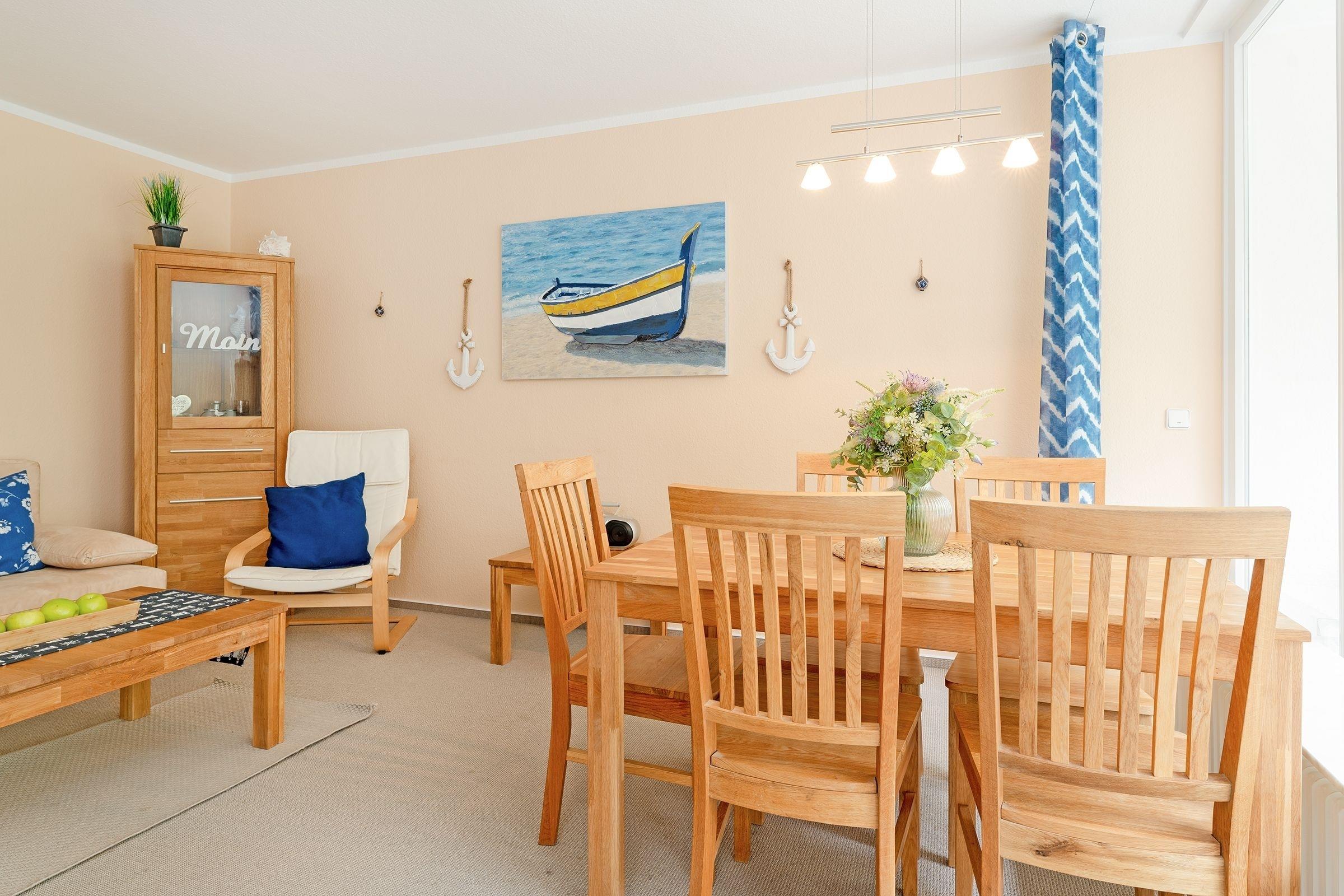 Die Ferienwohnung emfängt Sie mit einem hellen und geräumigen Wohnzimmer, das mit einer bequemen Schlafcouch (160x200 cm) ausgestattet ist. Der Wohnbereich bietet Platz für die gesamte Familie und verfügt zudem über einen Flachbild-TV sowie kostenfreies WLAN. Vom Wohnzimmer aus haben Sie Zugang zum überdachten Südwest-Balkon, der mit bequemen Sitzmöbeln ausgestattet ist. Hier können Sie hier ausgiebig entspannen und die Sonnenstunden ab spätem Vormittag bis zum Abend in vollen Zügen genießen.