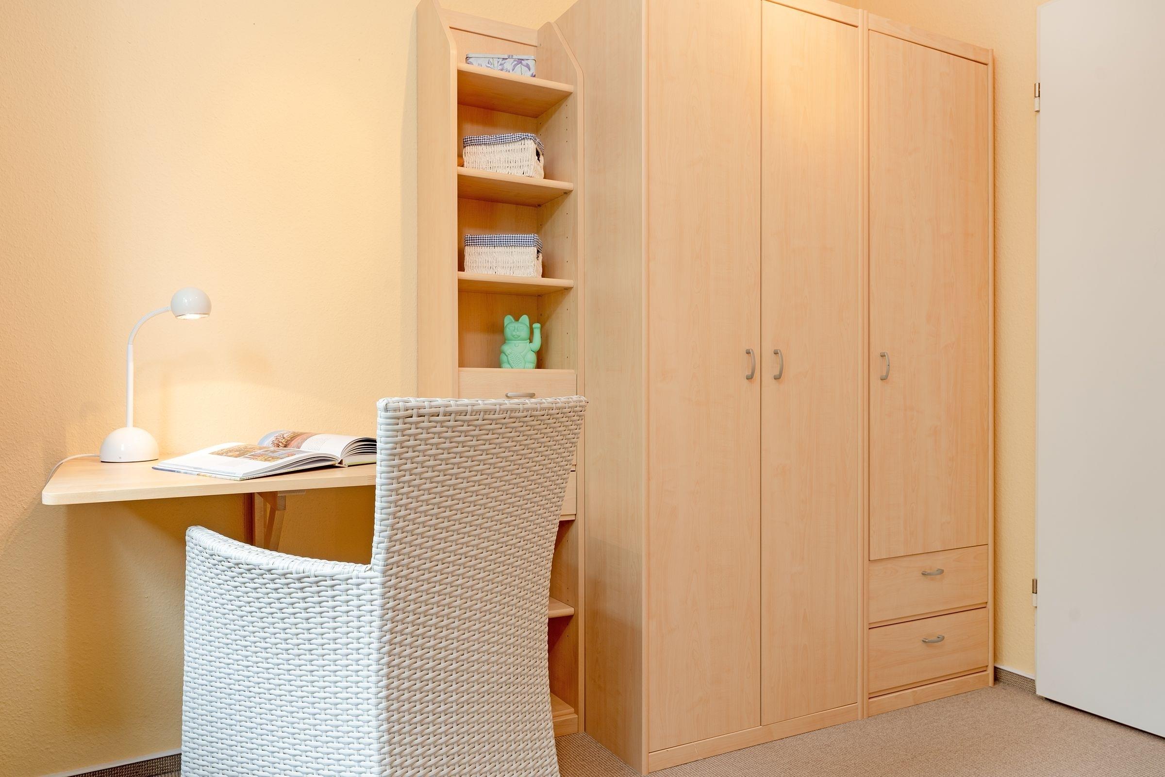 Schlafzimmer 2 : 1 Einzelbett (90x200 cm), Kleiderschrank, Verdunkelung: Außenjalousien, Platz für Babybett vorhanden